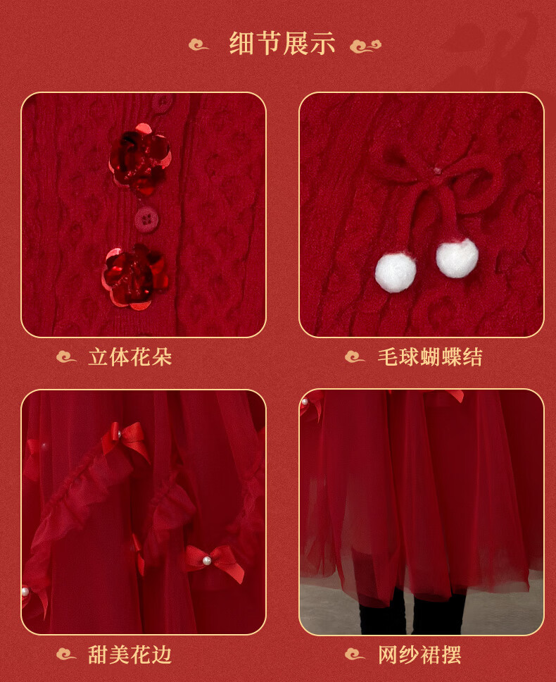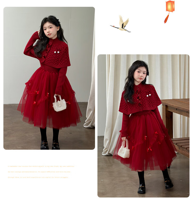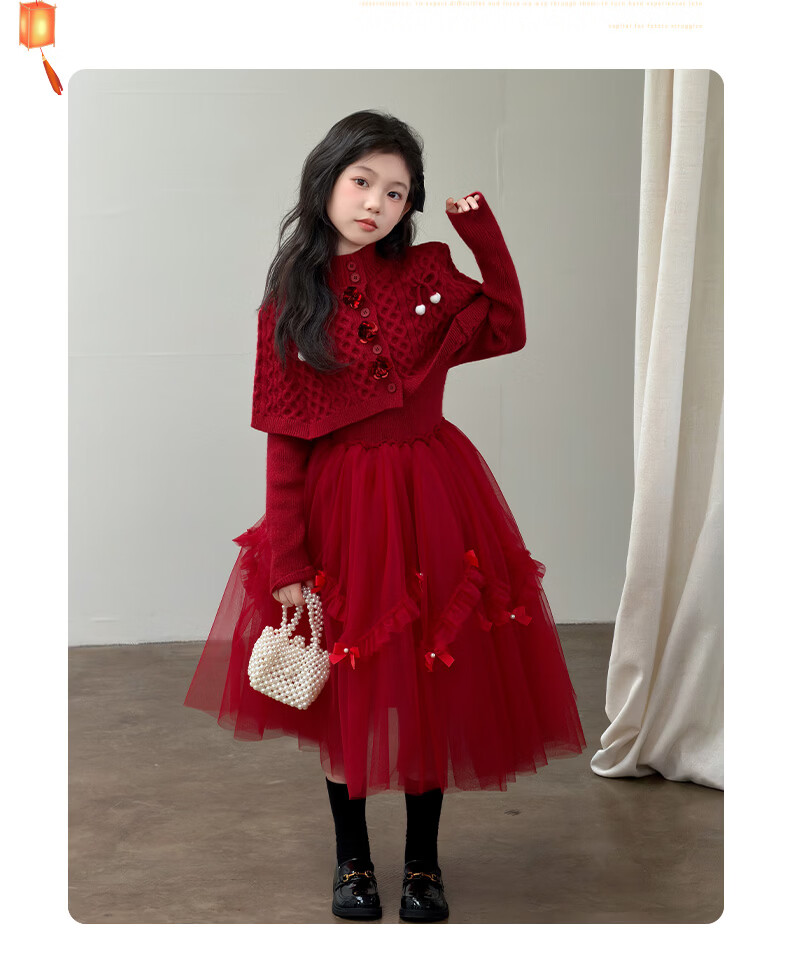 Doudou Kingdom Girls Dress New Year's Wear 2026 New Big Children New Year Thickened Red Skirt Girls Long Skirt Suit Winter Clothes Red Velvet Style 120