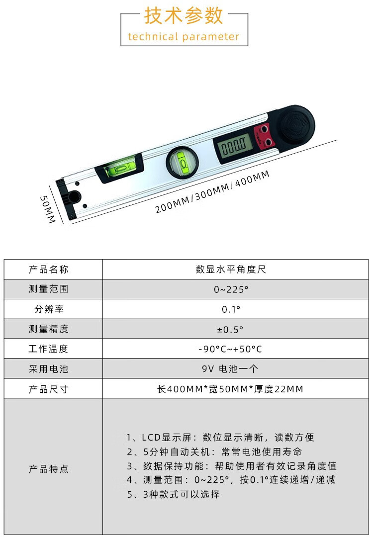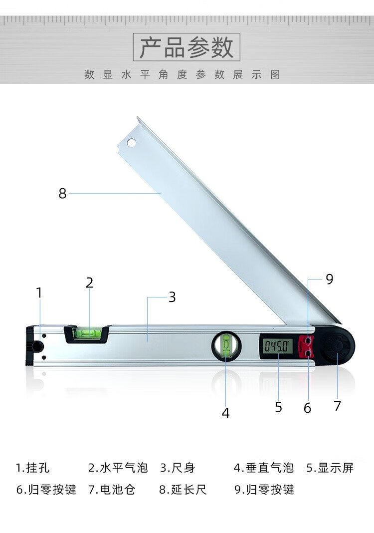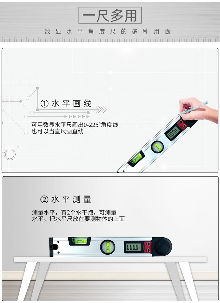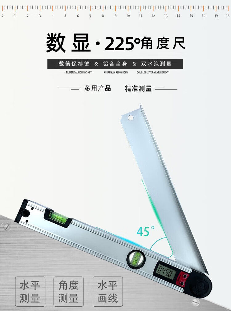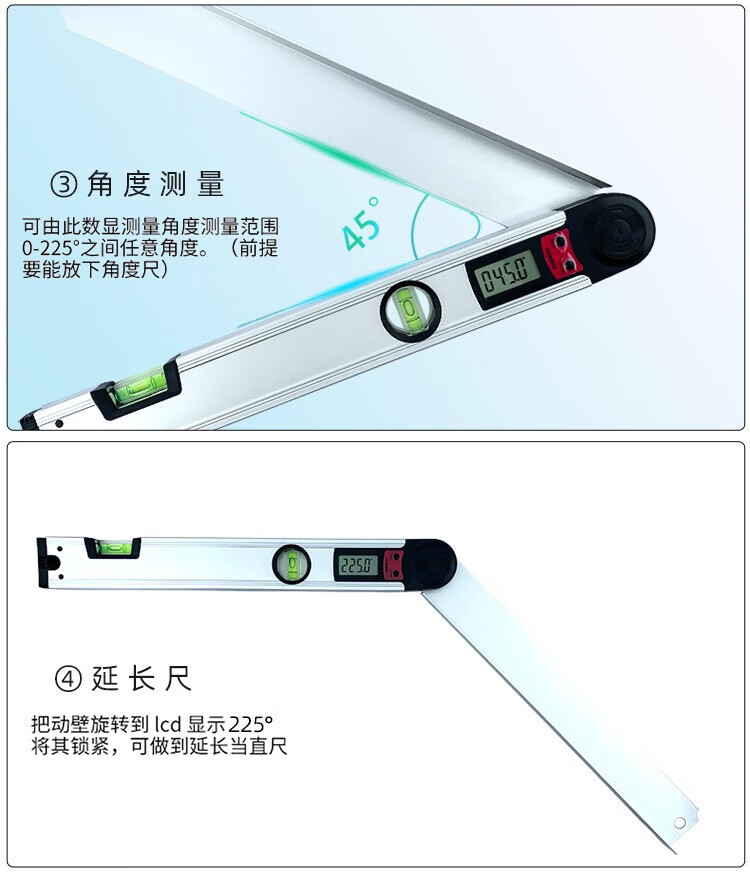Qian Huinong 225 degree digital display angle ruler multi-functional protractor horizontal ruler aluminum alloy electronic woodworking 250MM ruler length