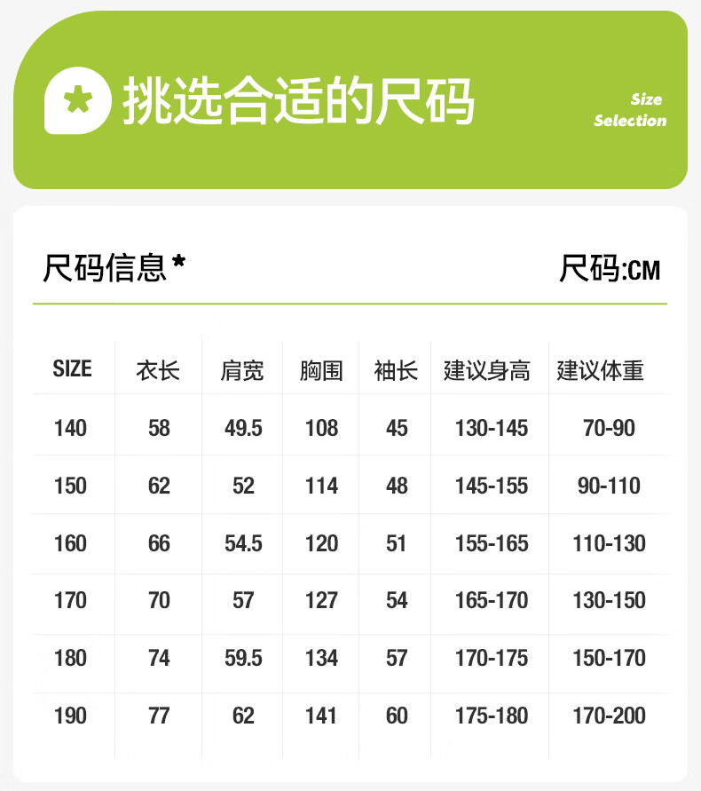 China (cm) 165 / 88-90 170 / 96-98 175 / 108-110 180 / 118-122 185 / 126-130