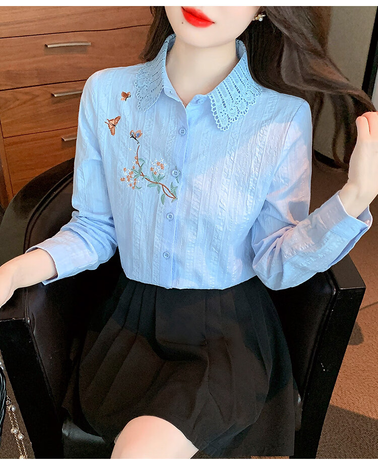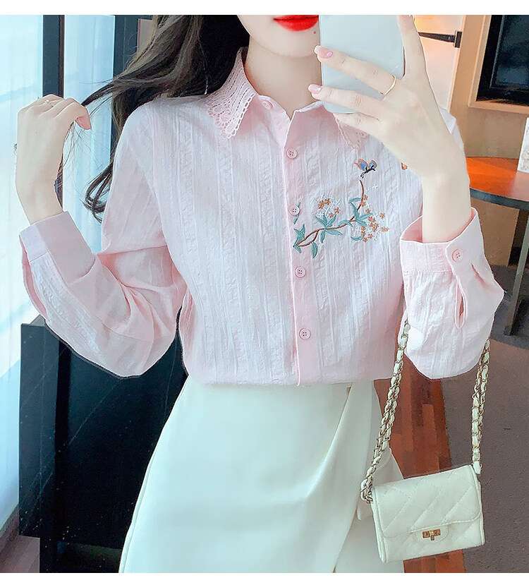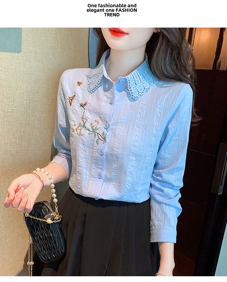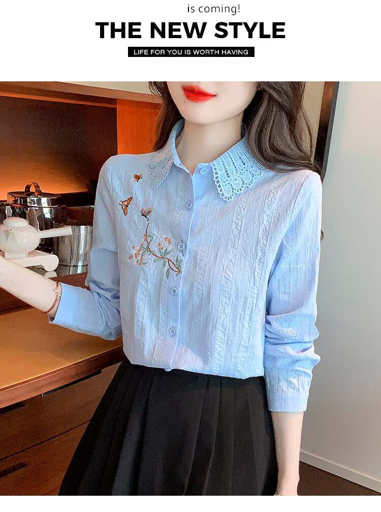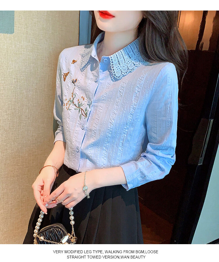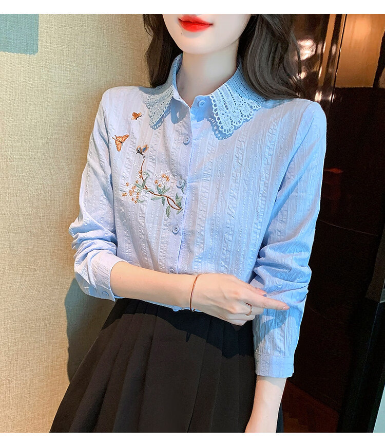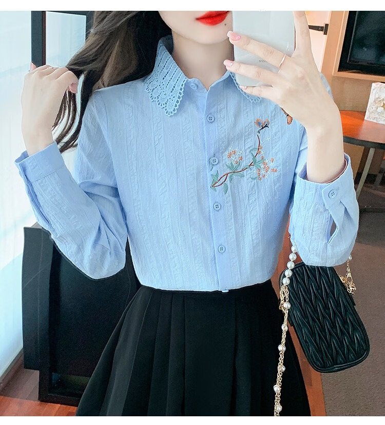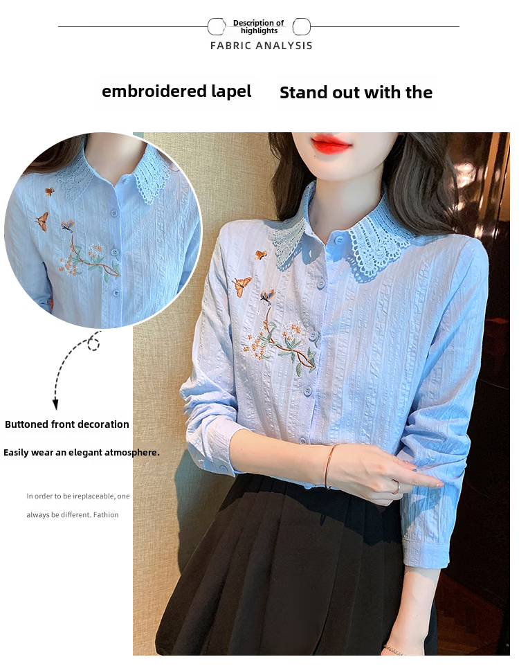 Woodpecker (TUCANO) Fashionable Embroidered Cotton Velvet Shirt Women's 2026 Spring and Autumn Clothing New Long Sleeve Cotton Shirt Women's Fashion Tops Blue S