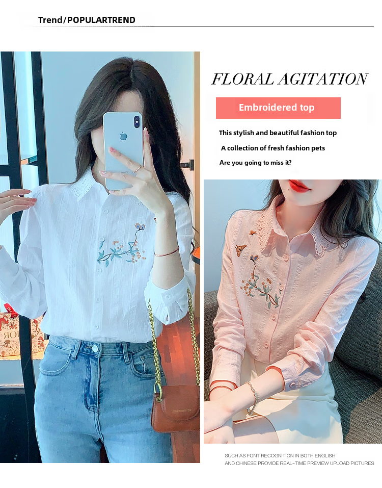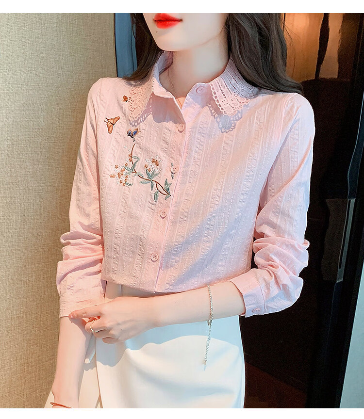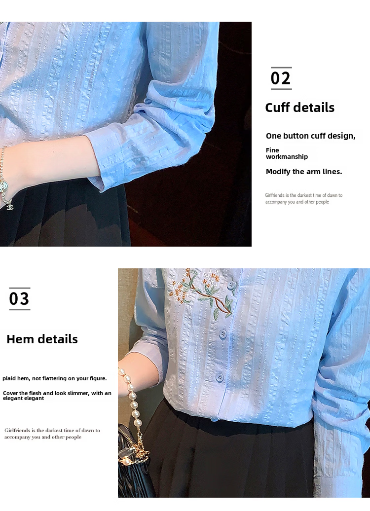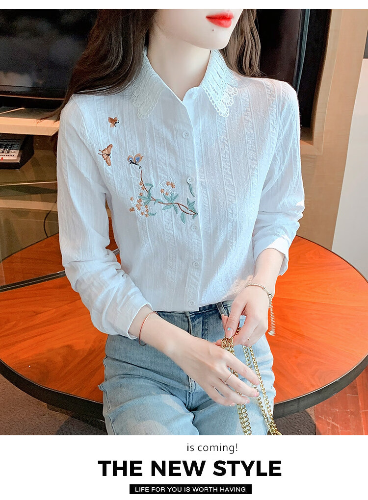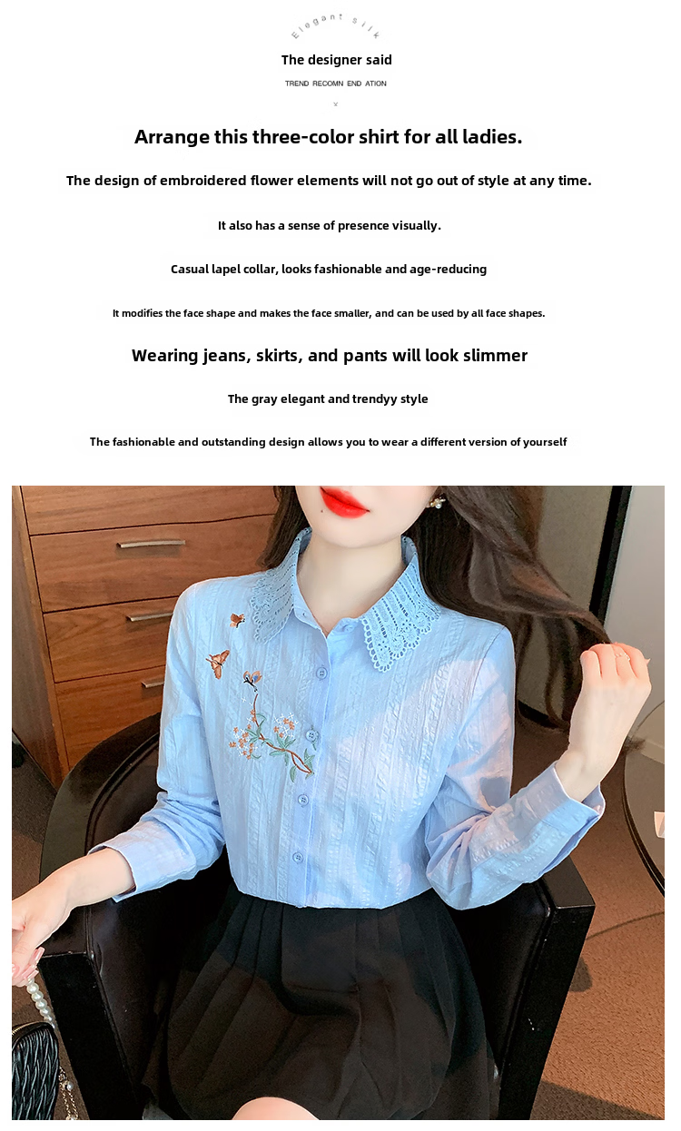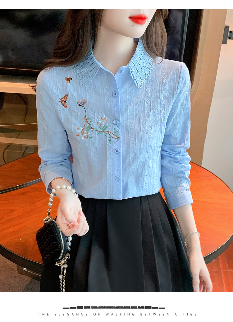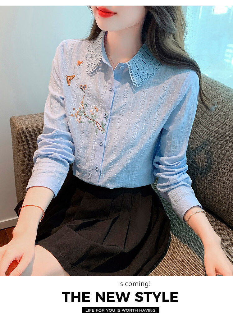 Woodpecker (TUCANO) Fashionable Embroidered Cotton Velvet Shirt Women's 2026 Spring and Autumn Clothing New Long Sleeve Cotton Shirt Women's Fashion Tops Blue S