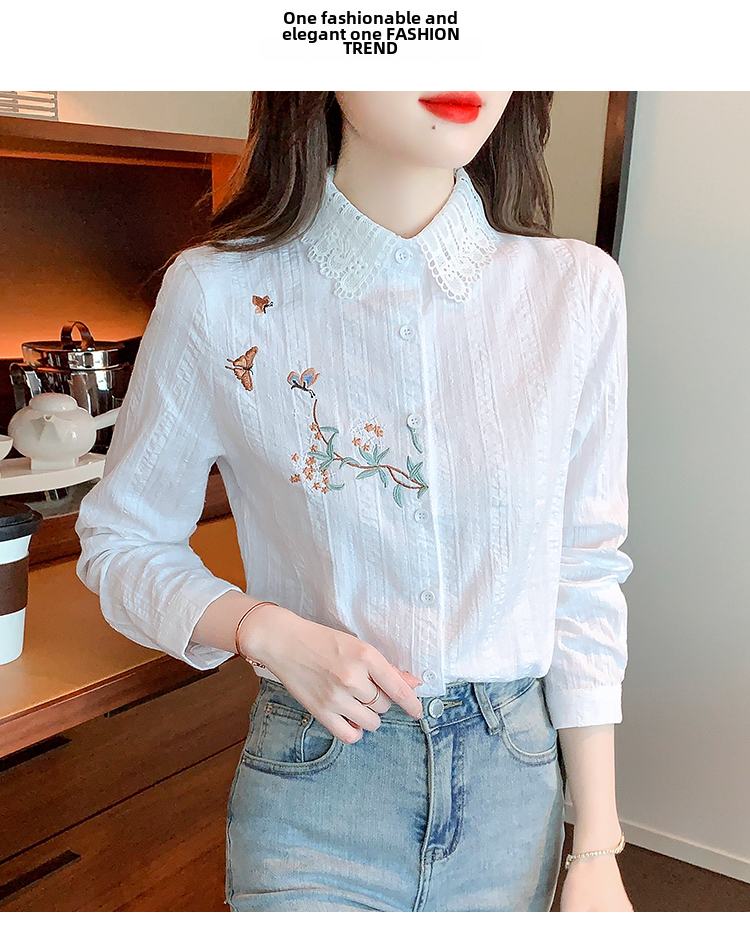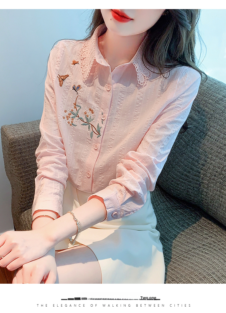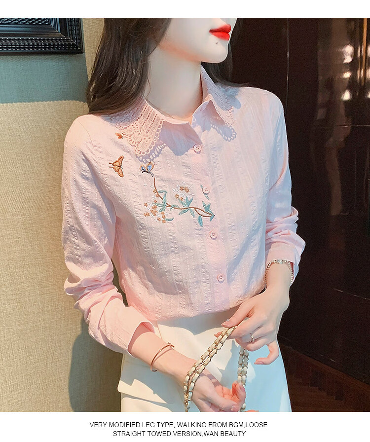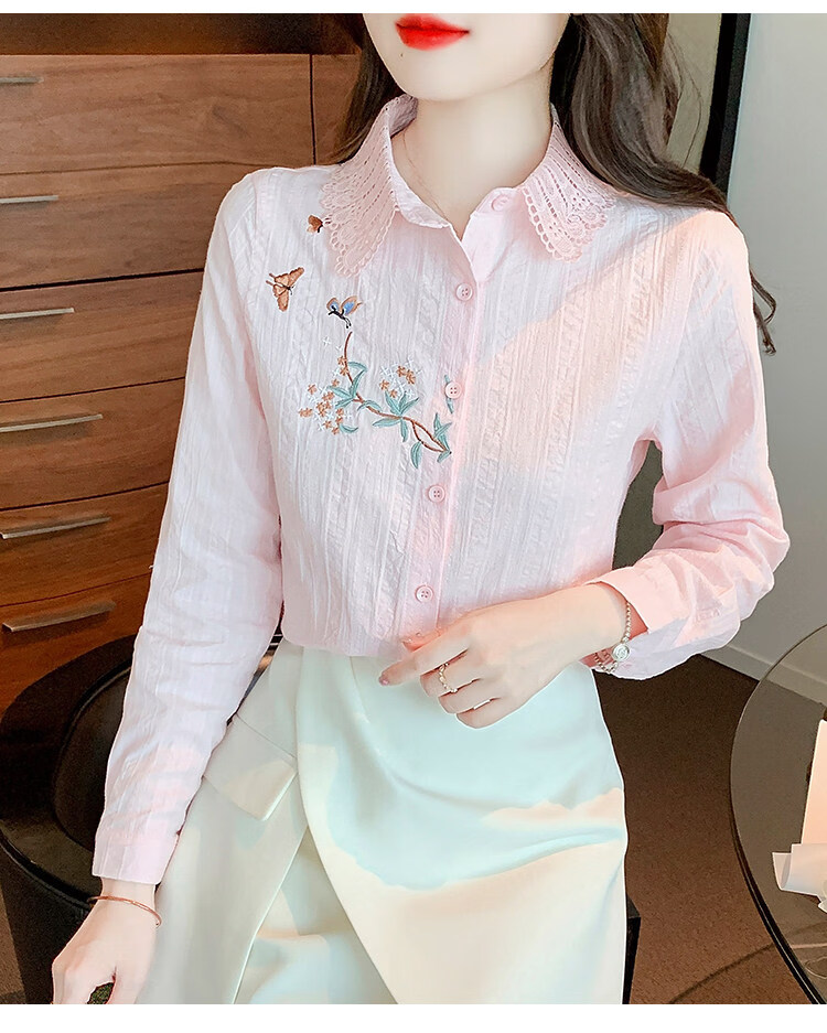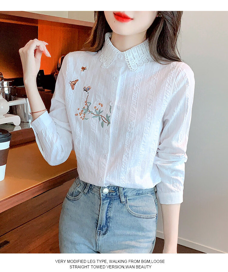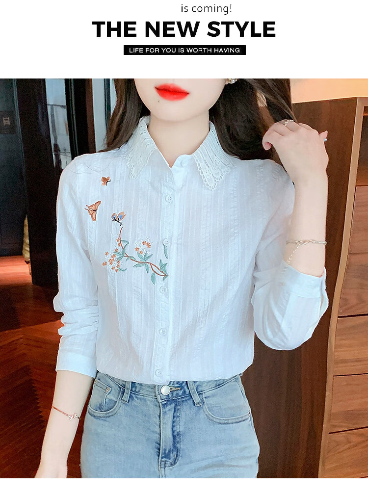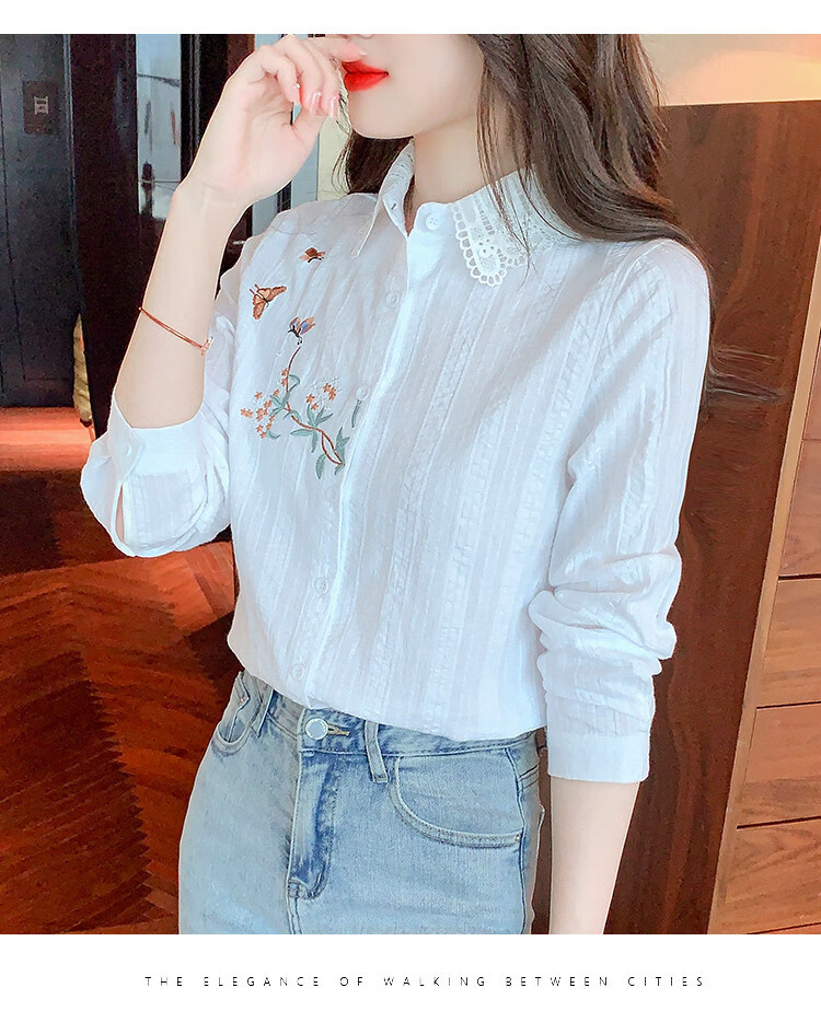 Woodpecker (TUCANO) Fashionable Embroidered Cotton Velvet Shirt Women's 2026 Spring and Autumn Clothing New Long Sleeve Cotton Shirt Women's Fashion Tops Blue S