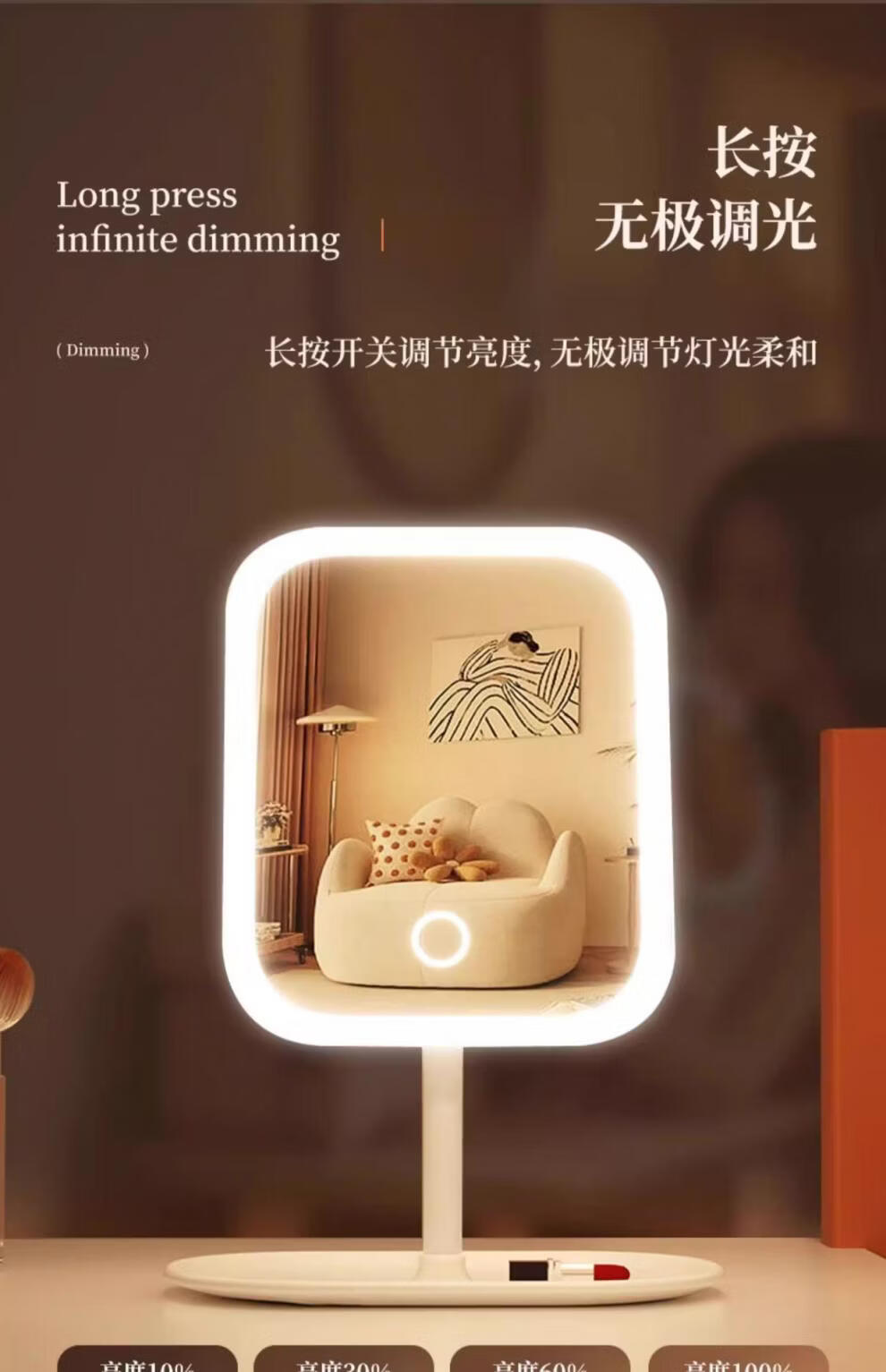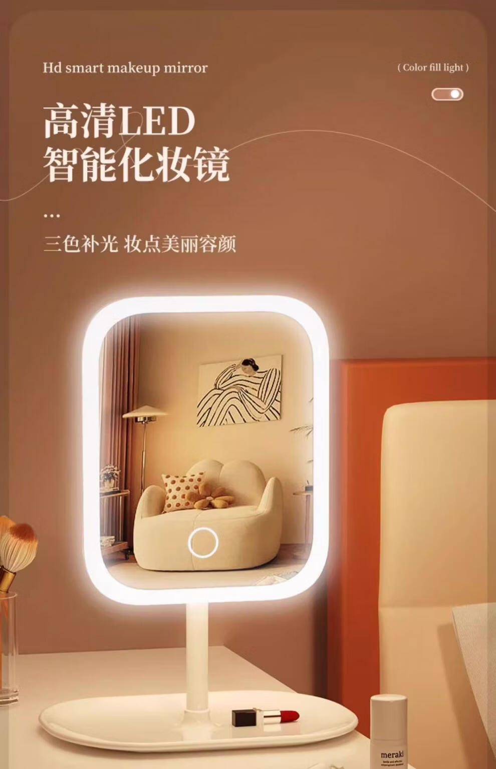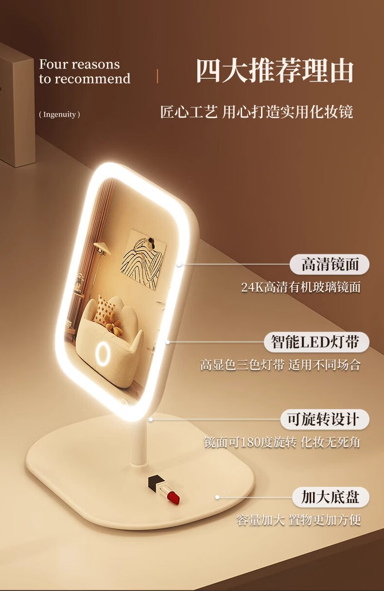 TRUVOER German brand luminous LED smart makeup mirror with light girls' bedroom dressing table dressing mirror student dormitory desktop fill-in mirror square mirror-Princess White three-color light changing