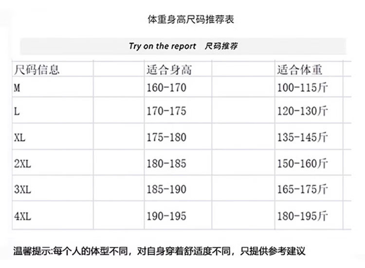 China (cm) 165 / 88-90 170 / 96-98 175 / 108-110 180 / 118-122 185 / 126-130
