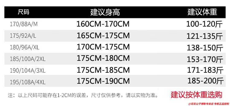 China (cm) 165 / 88-90 170 / 96-98 175 / 108-110 180 / 118-122 185 / 126-130