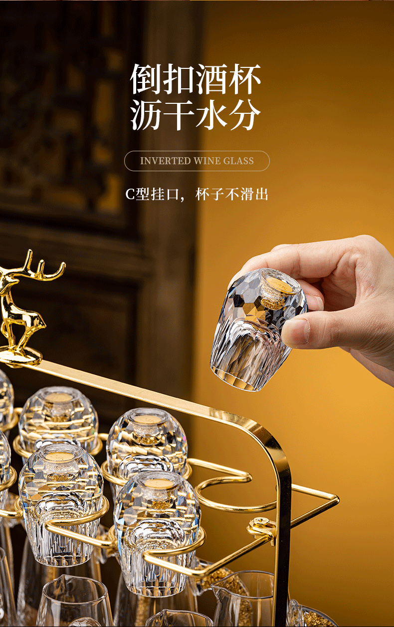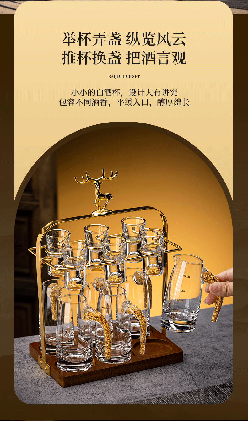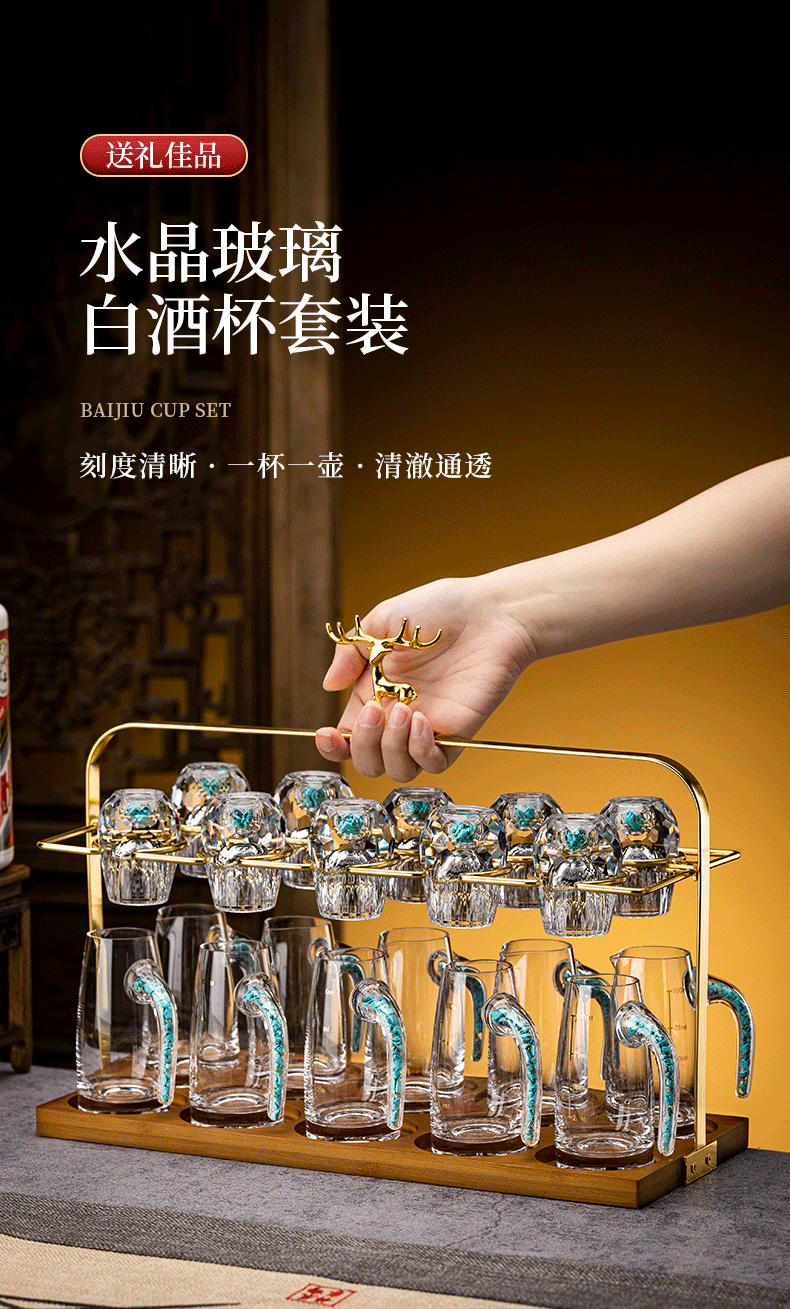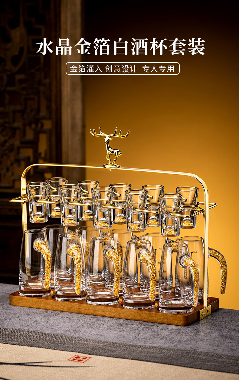 Hejian Gong Crystal Light Luxury Glass White Wine Cup Set Household Gold Foil Chinese Small Wine Cup Wine Divider Wine Set Deer Head Cup Holder 10+10 Foil Mountain Helicopter Kettle X10+Jinshan Cup X1