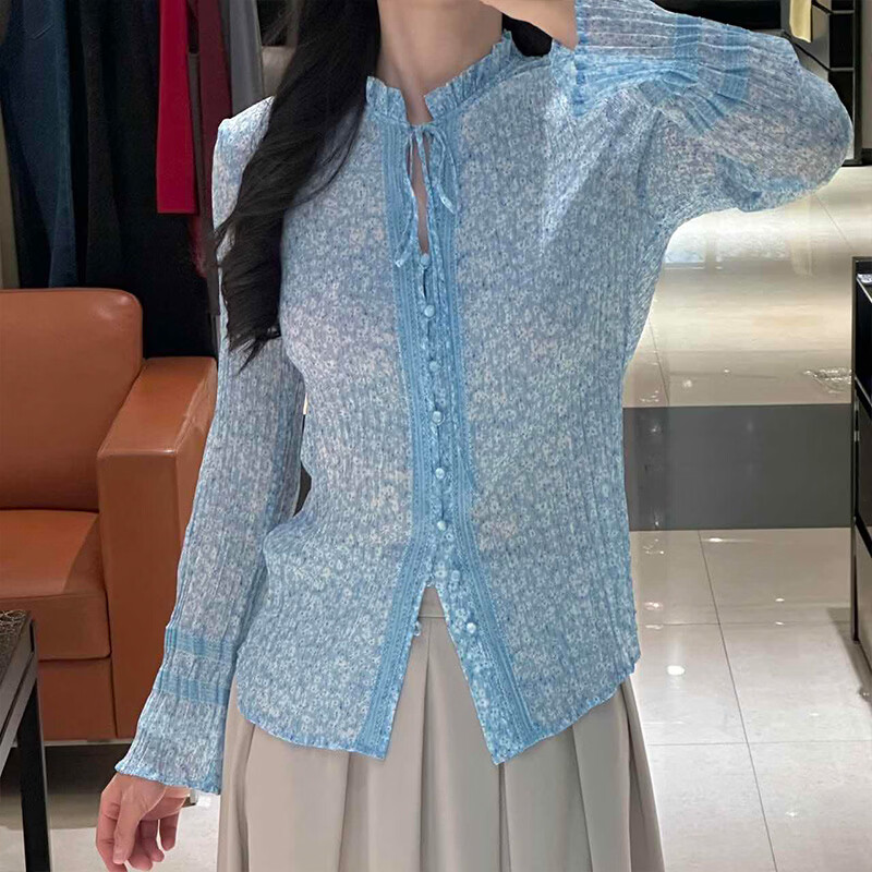 GIRDEAR 26 early spring Korean style women's new floral pleated texture floral print shirt 130156 light blue (2A88272) M (3)
