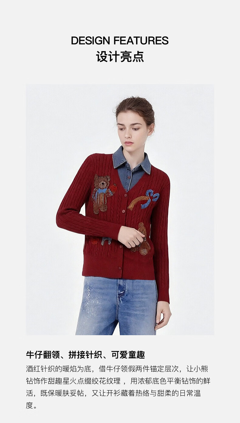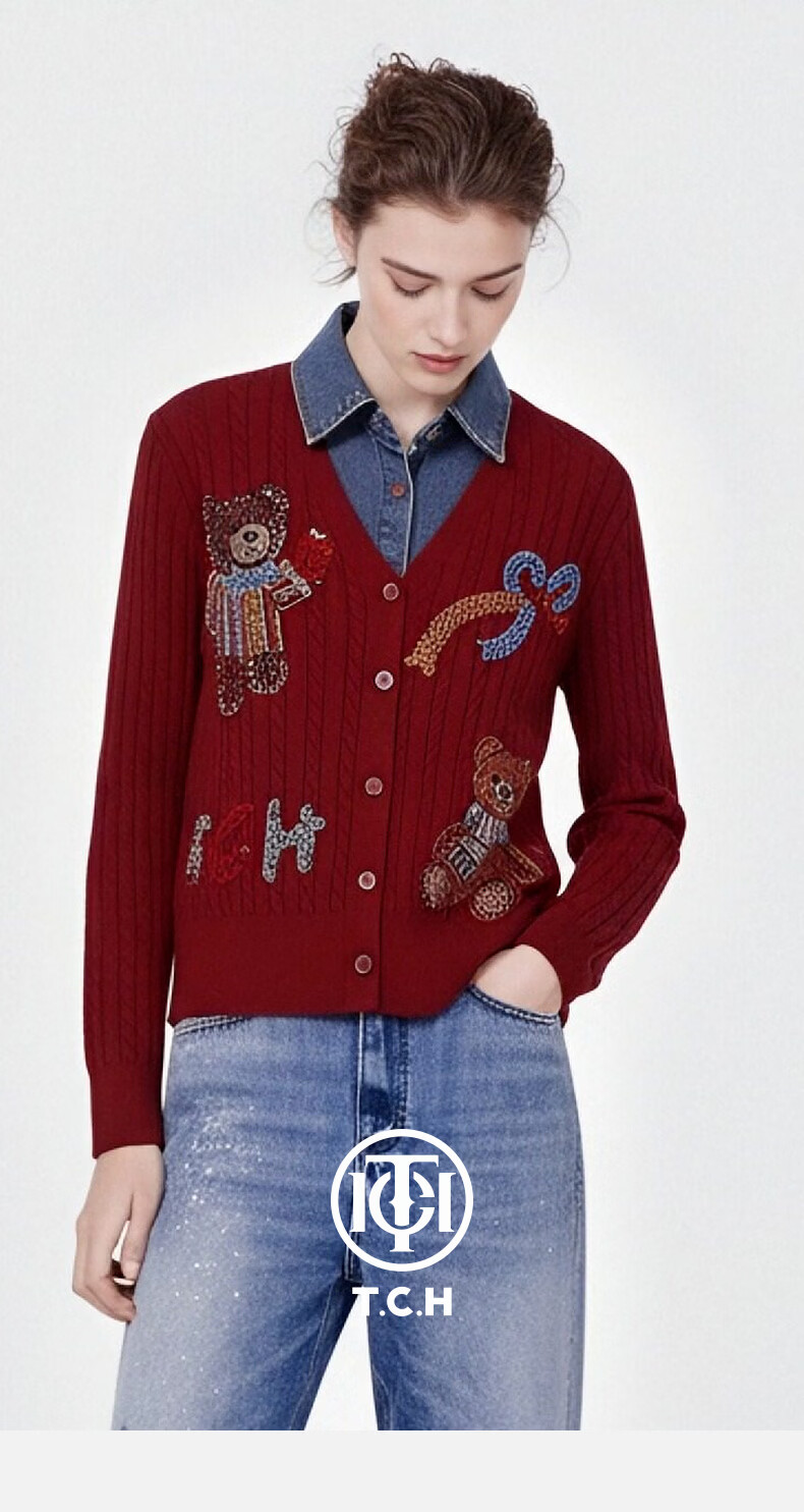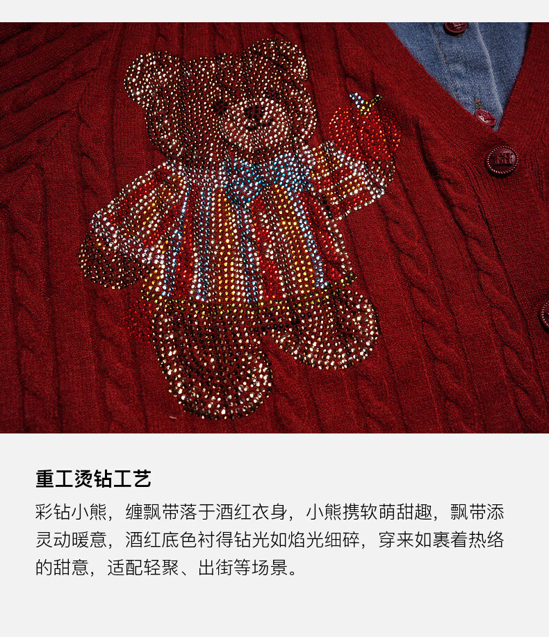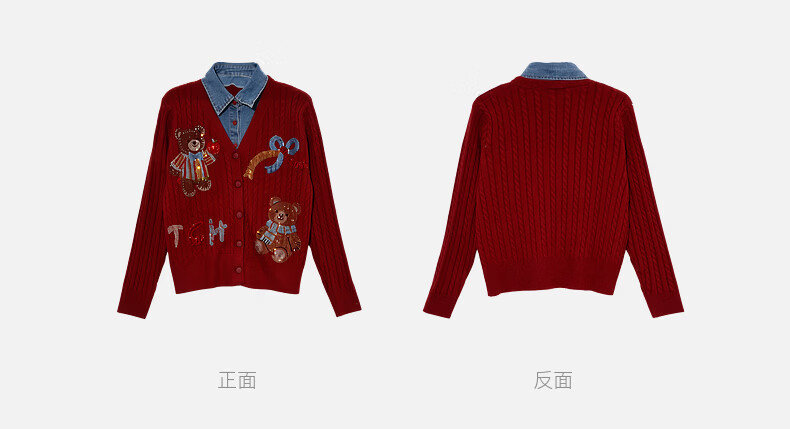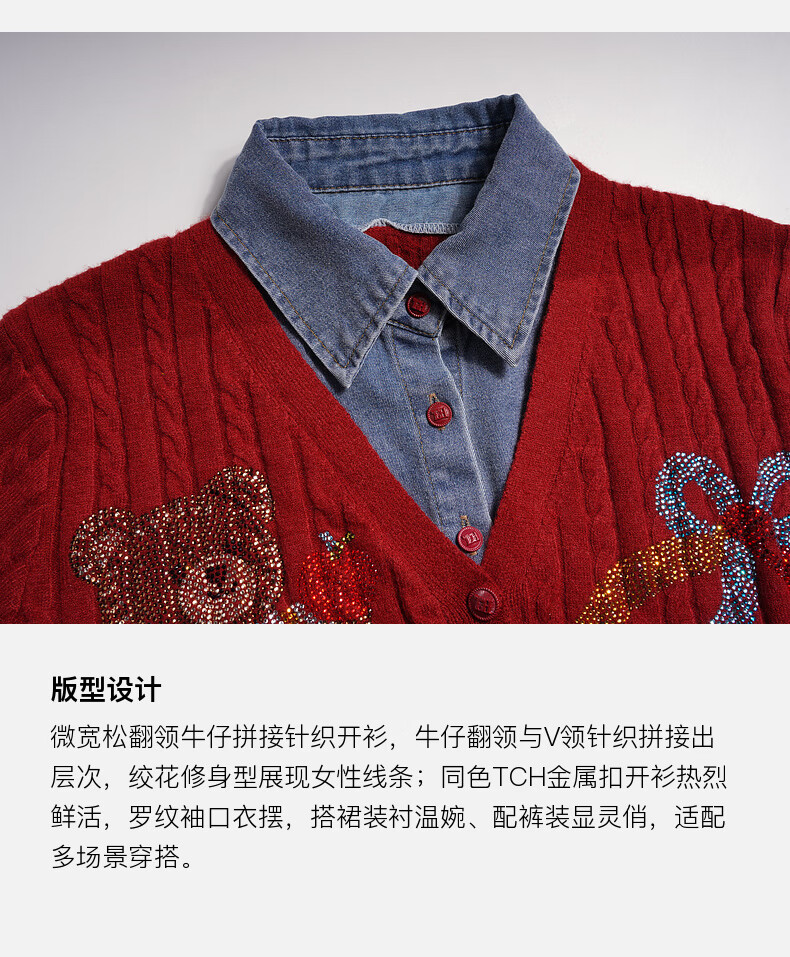 TCH knitted cardigan for women 26 years early spring fashion hot diamond retro red fake two-piece splicing denim design sweater burgundy L