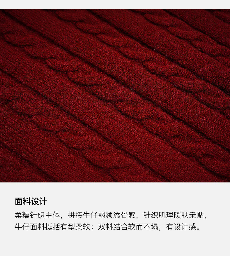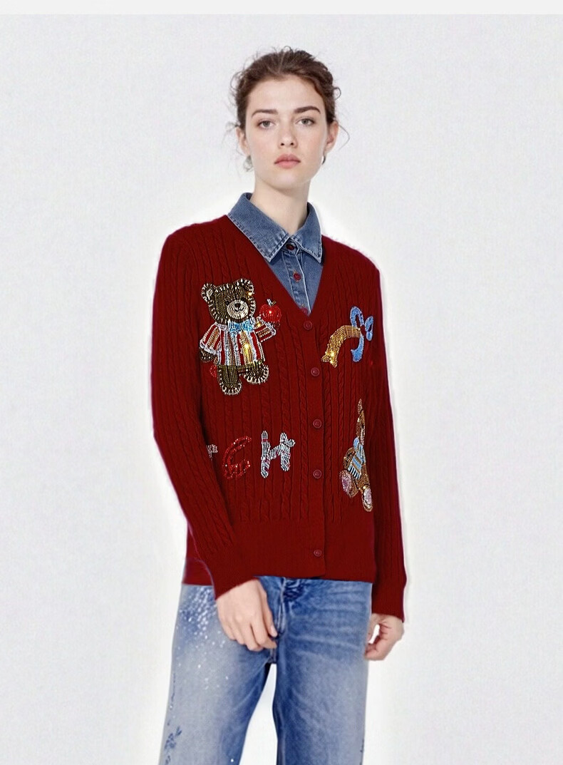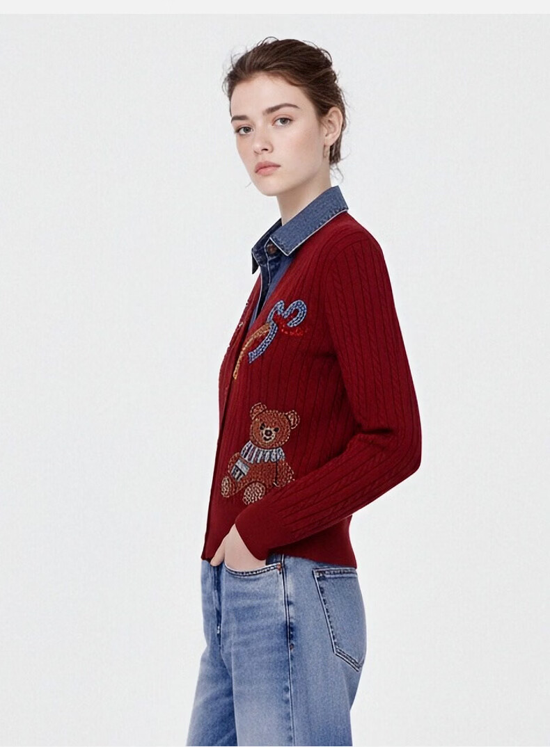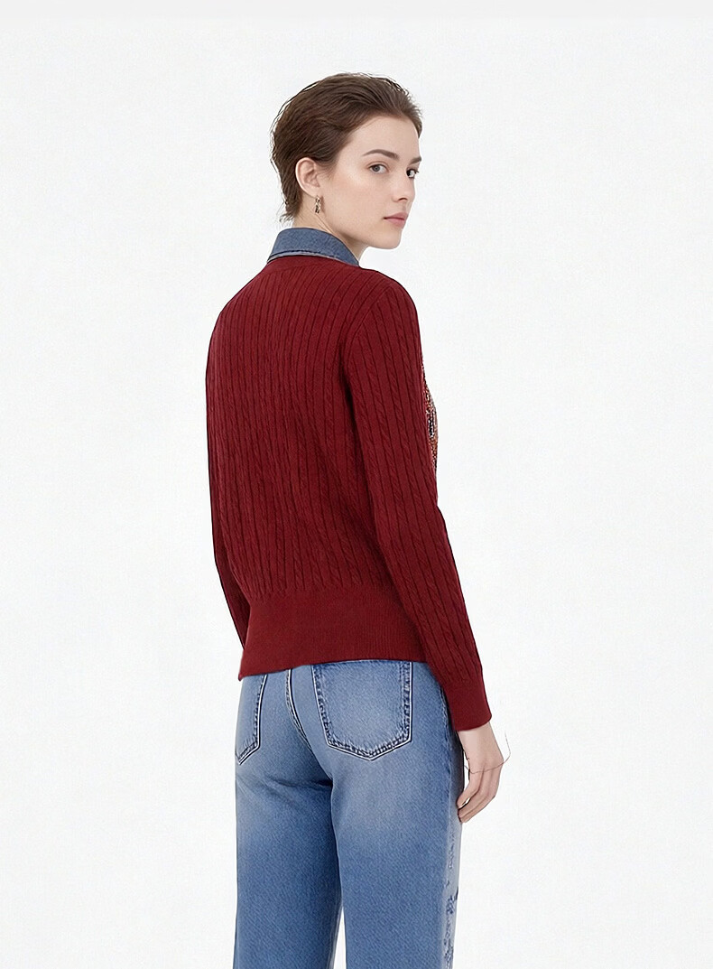 TCH knitted cardigan for women 26 years early spring fashion hot diamond retro red fake two-piece splicing denim design sweater burgundy L