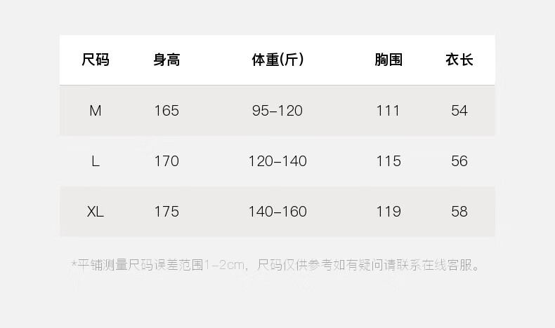 China (cm) 165 / 88-90 170 / 96-98 175 / 108-110 180 / 118-122 185 / 126-130