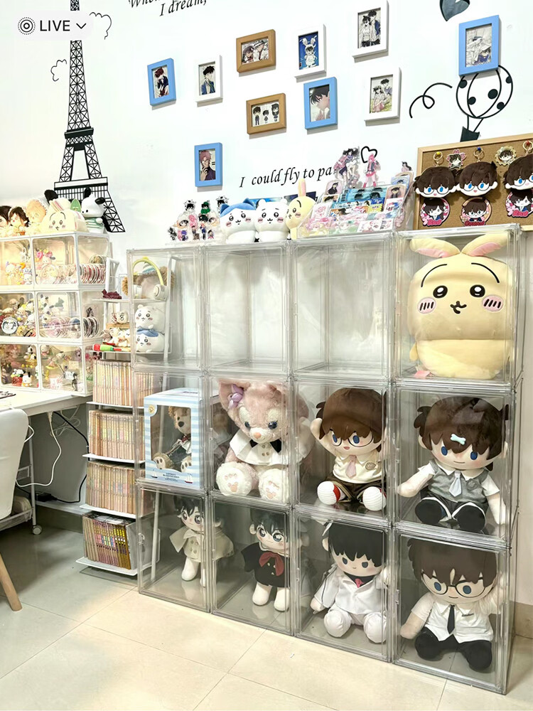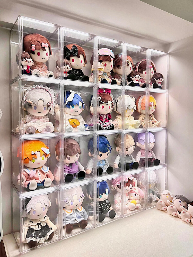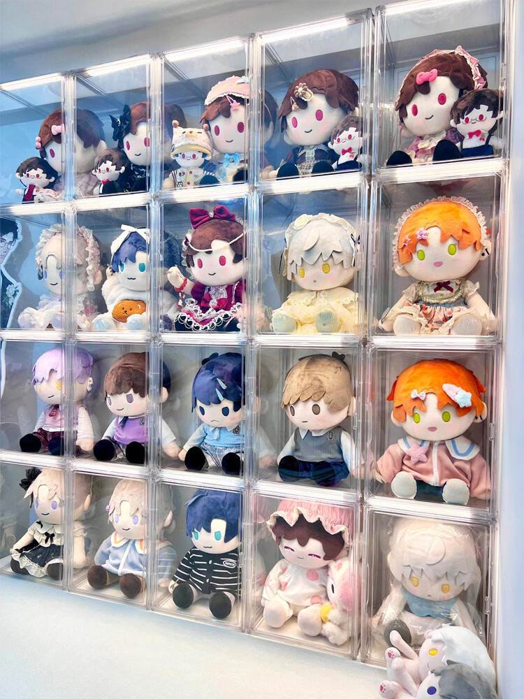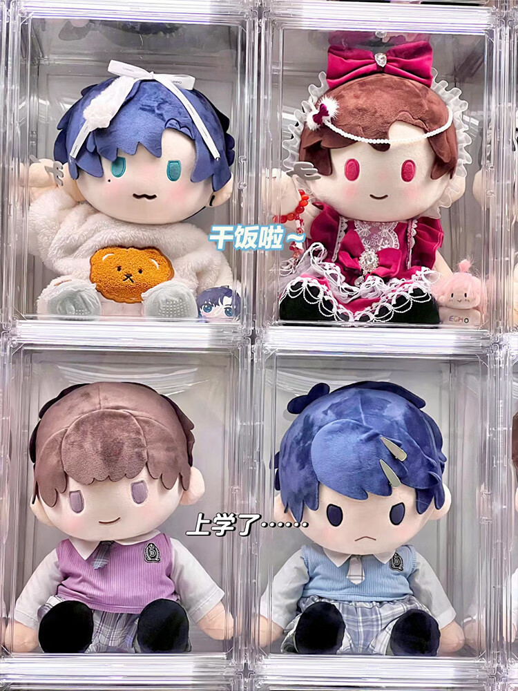 Yusenyi transparent dustproof acrylic display cabinet 40cm cotton doll storage box toy display box for living room can be huge size main picture can hold 40cm big baby 3 pieces