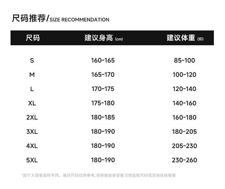 China (cm) 165 / 88-90 170 / 96-98 175 / 108-110 180 / 118-122 185 / 126-130