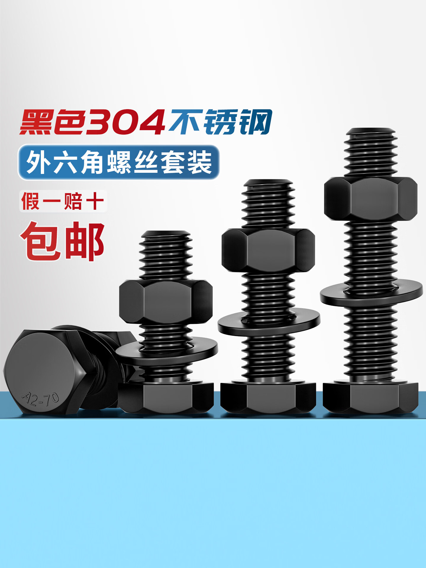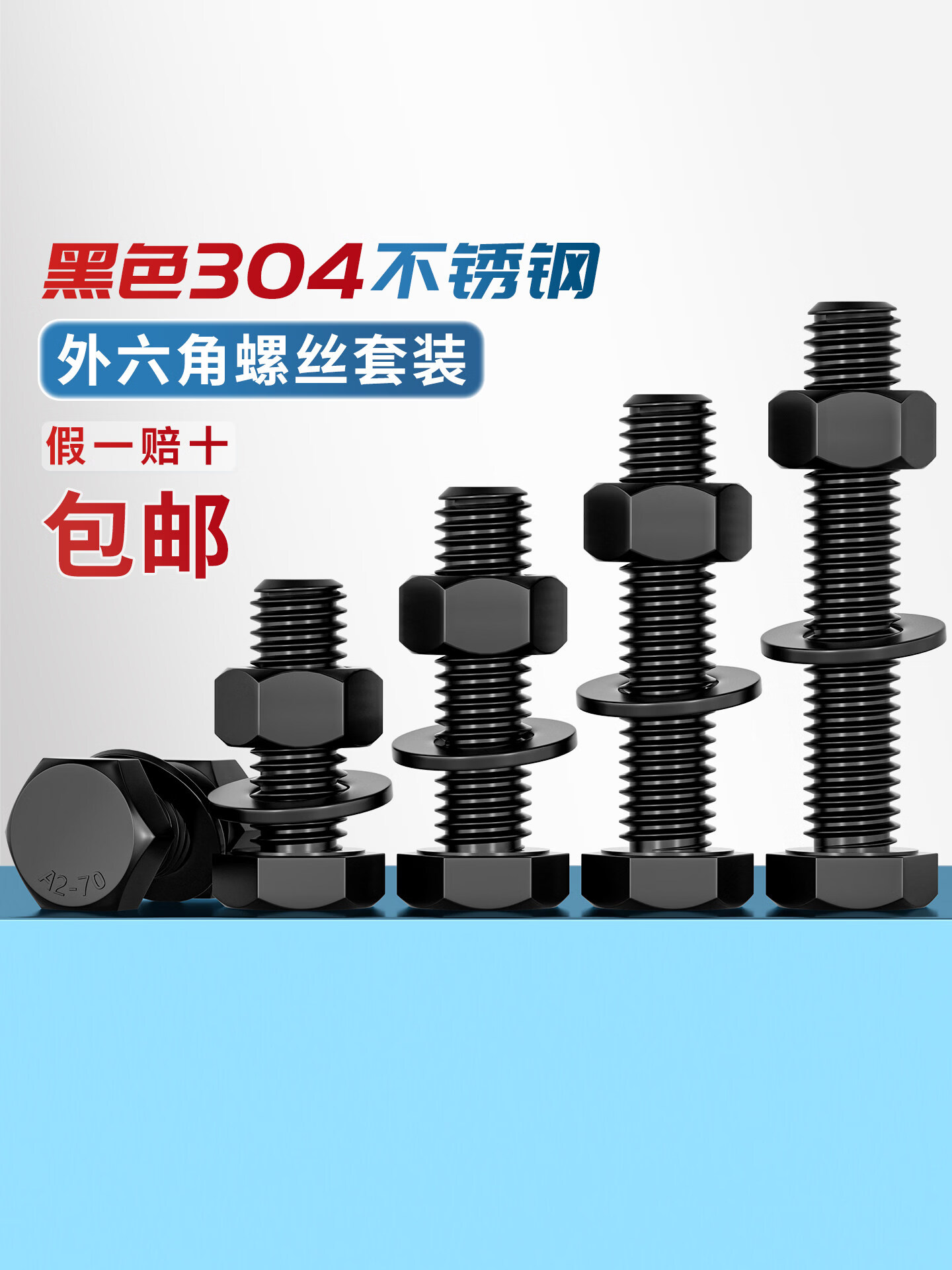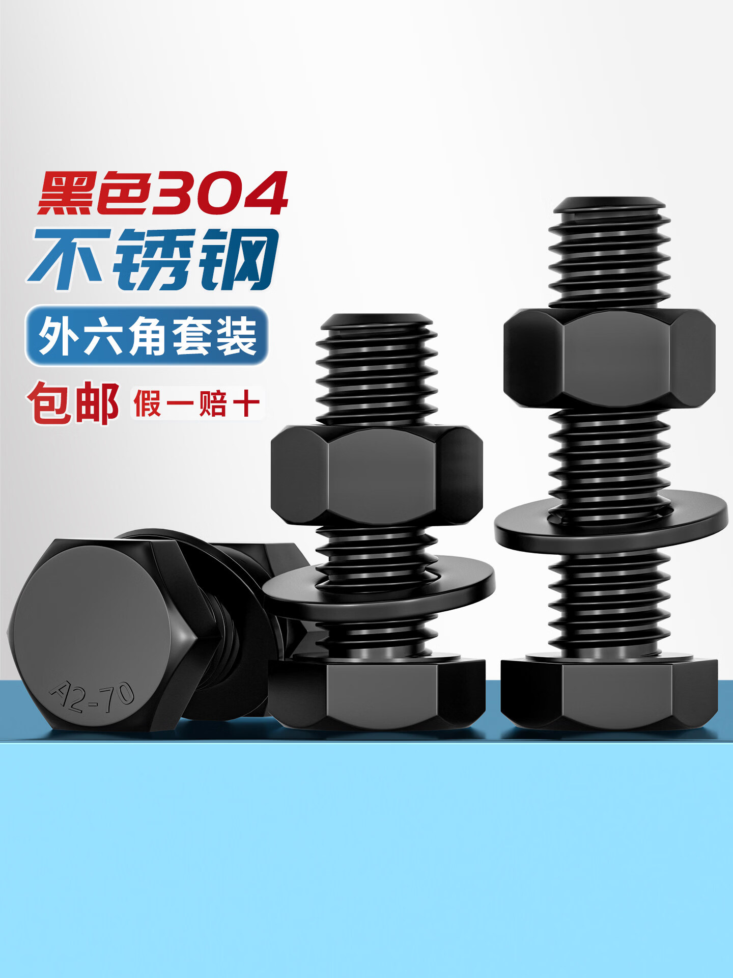 Tianzhuo Hardware Black 304 Stainless Steel Full Thread External Hexagon Screw Nut Flat Washer Set Extended Screw M3M4M5M6M8M10 M6*8-20 Set