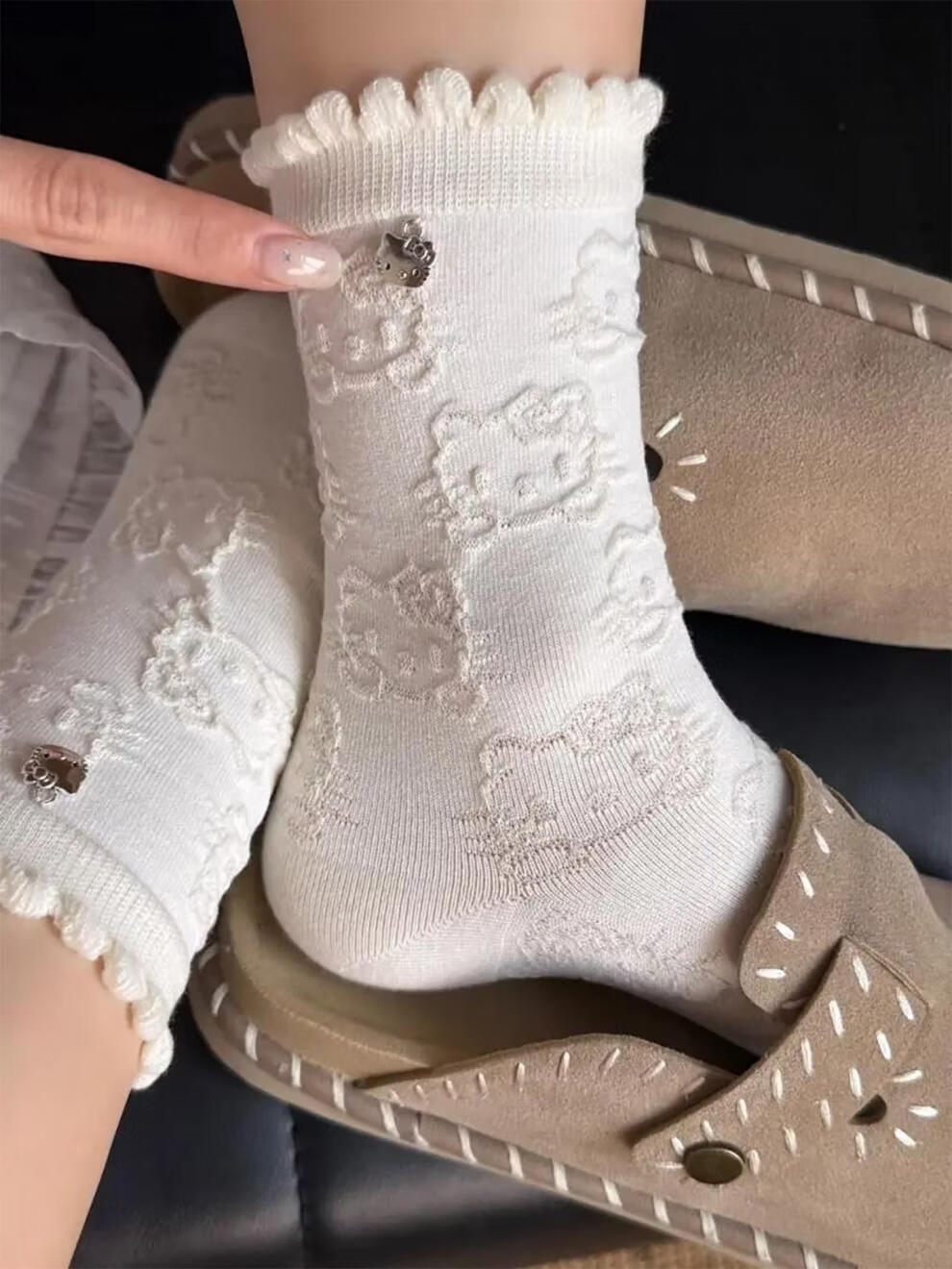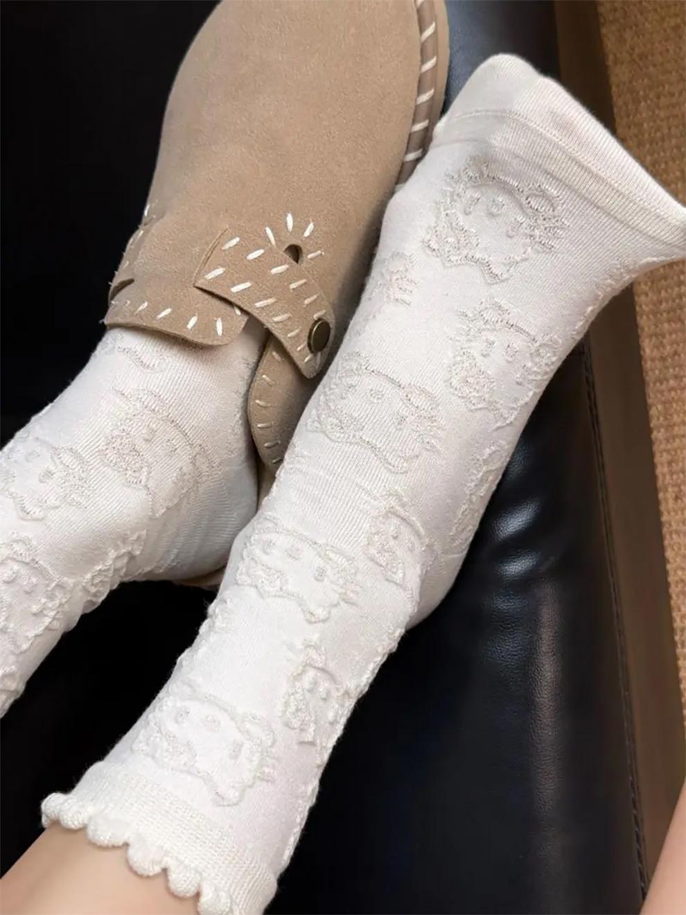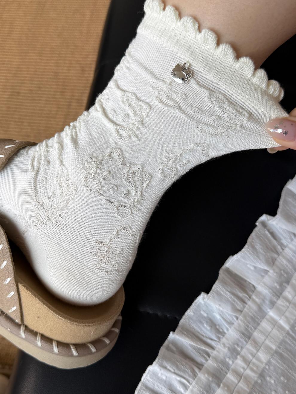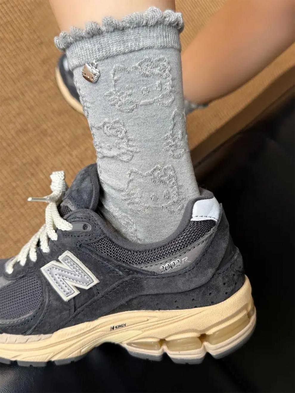 Modal Hello Kitty socks for women, lace pile socks, cartoon pendant cotton socks, cute spring and autumn mid-calf socks, 2 gray + 2 black, 4 pairs, one size fits all