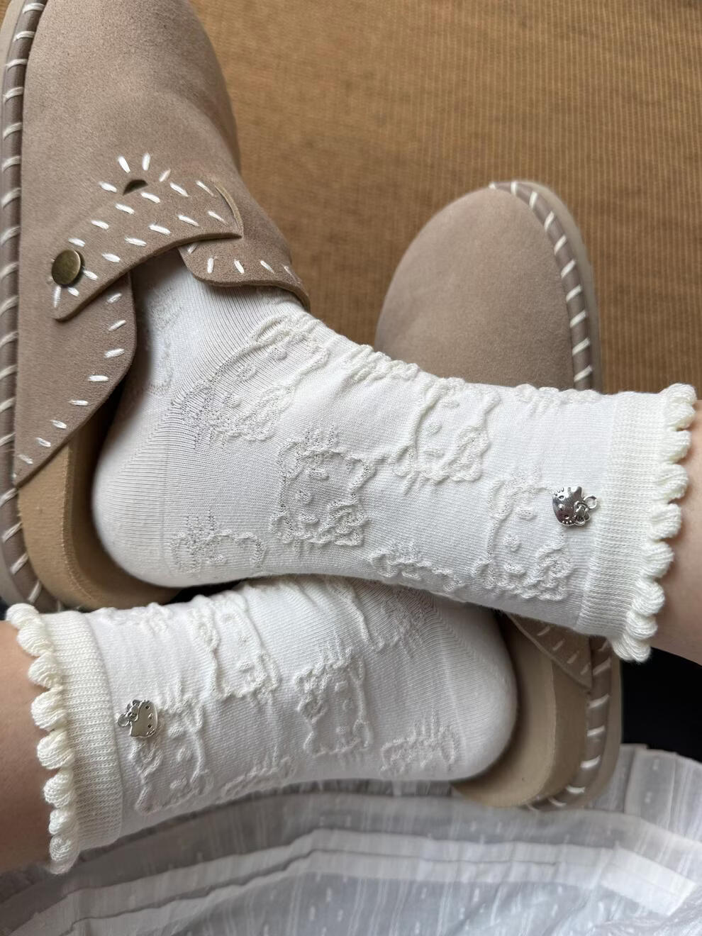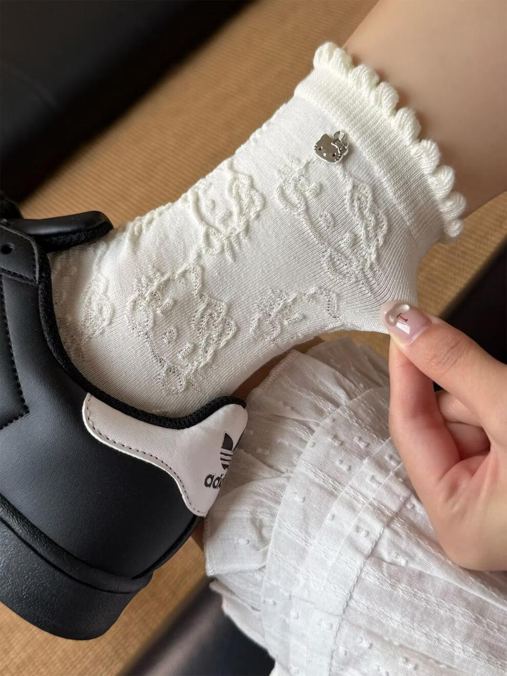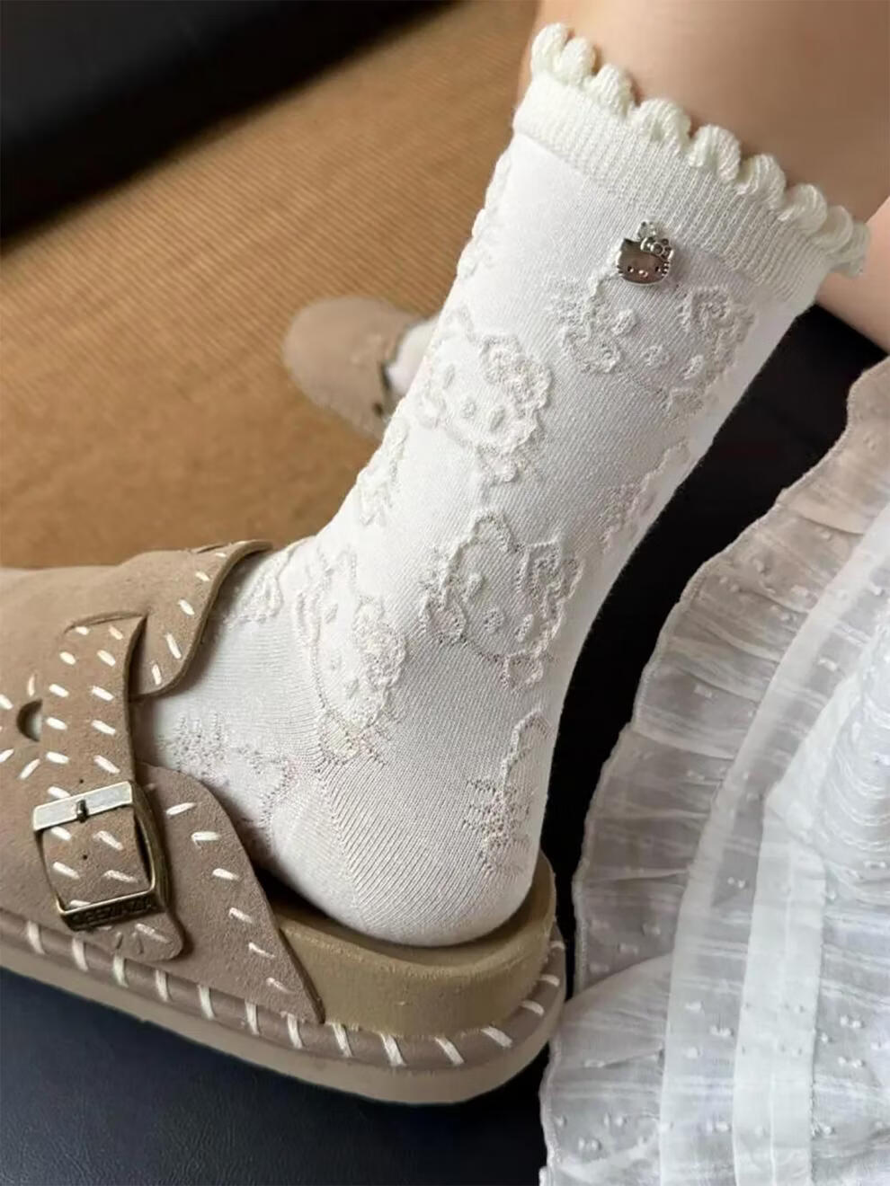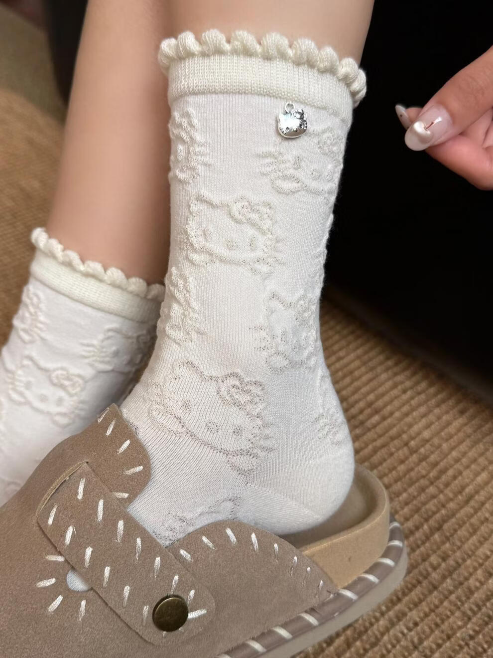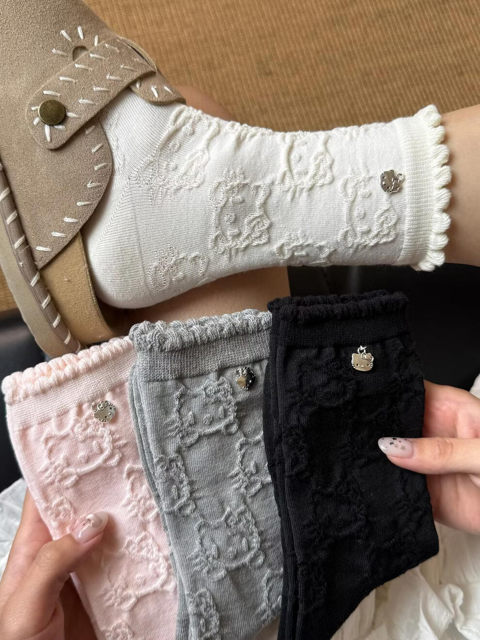 Modal Hello Kitty socks for women, lace pile socks, cartoon pendant cotton socks, cute spring and autumn mid-calf socks, 2 gray + 2 black, 4 pairs, one size fits all
