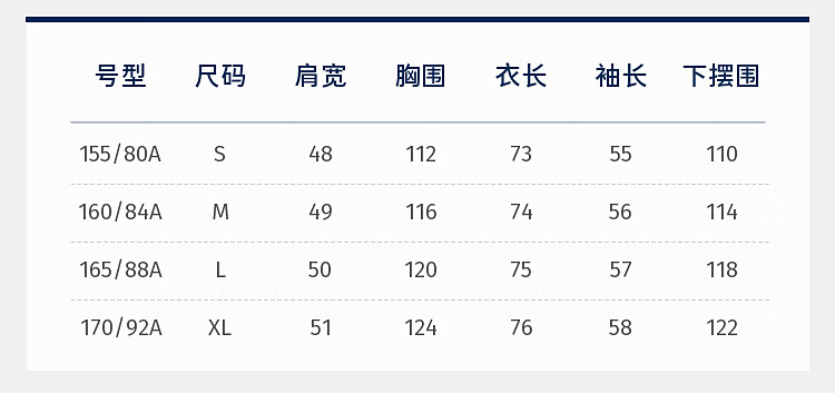 China (cm) 160-165/84-86 165-170 / 88-90 167-172 / 92-96 168-173 / 98-102 170-176 / 106-110