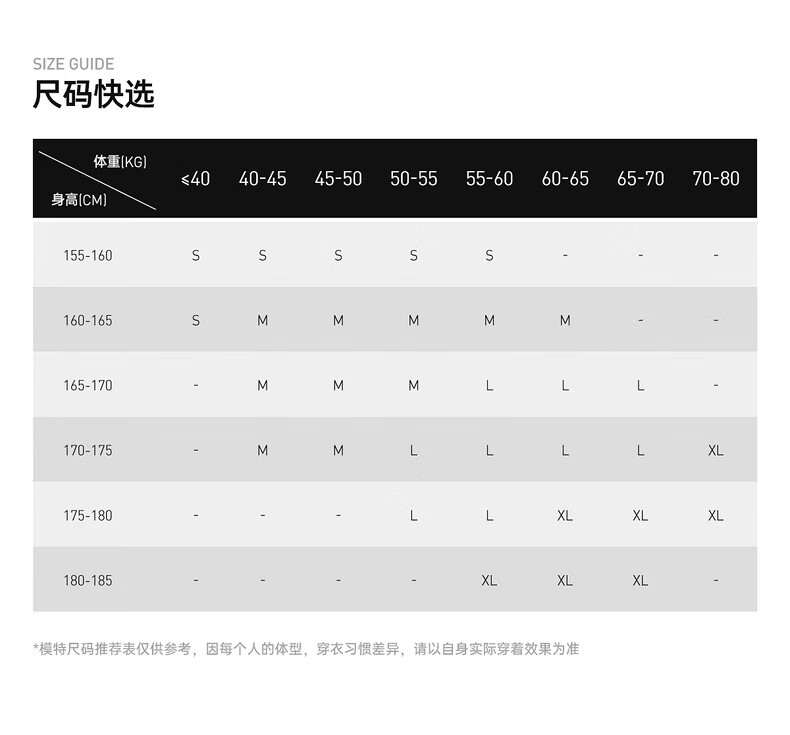China (cm) 160-165/84-86 165-170 / 88-90 167-172 / 92-96 168-173 / 98-102 170-176 / 106-110