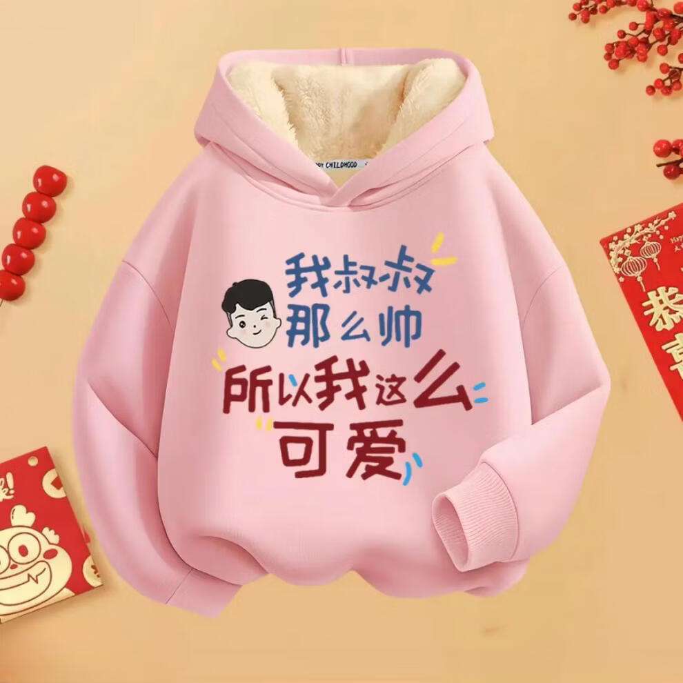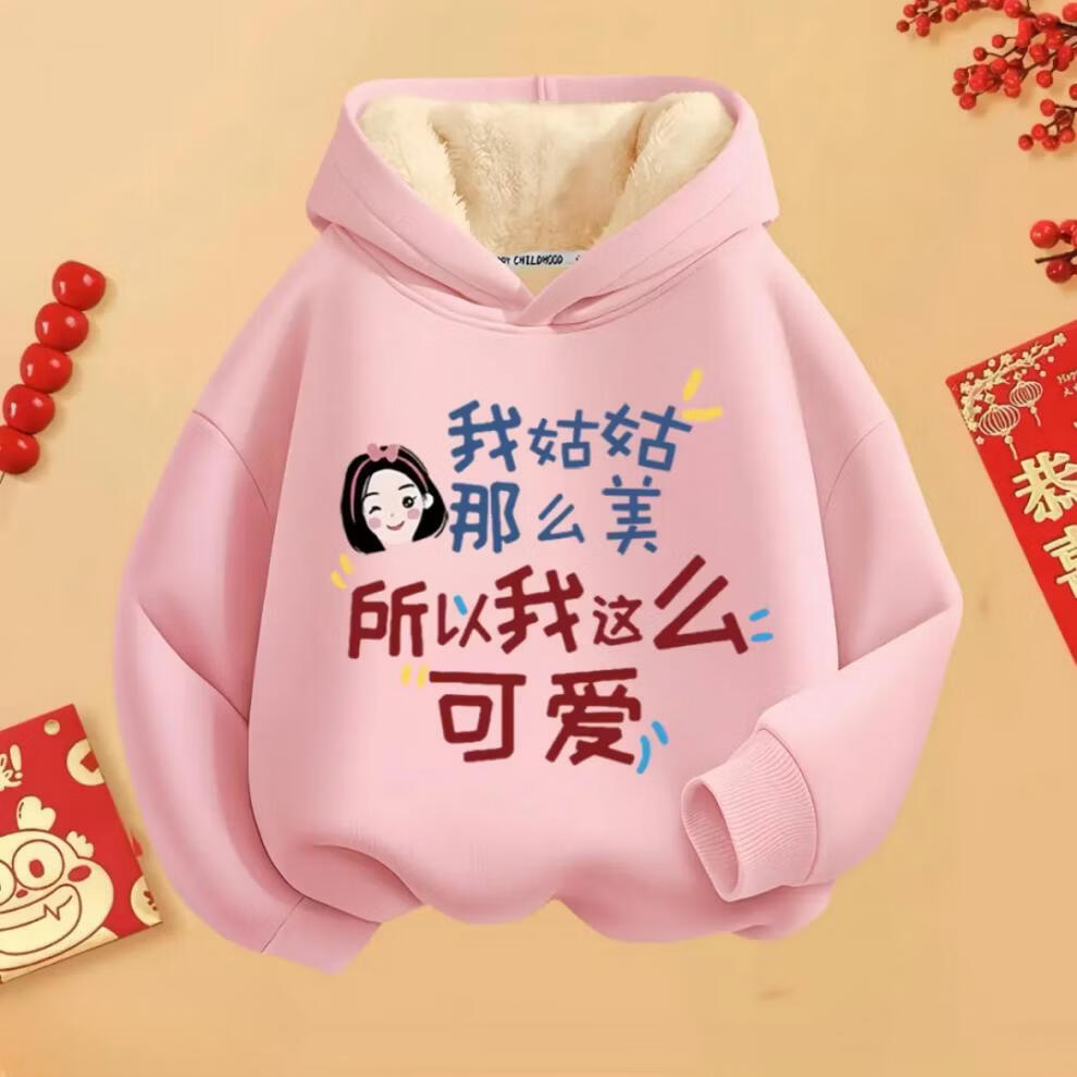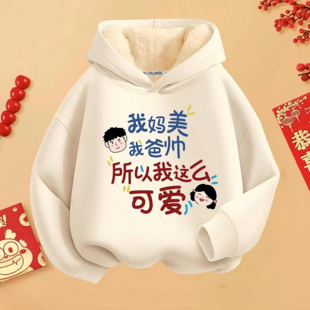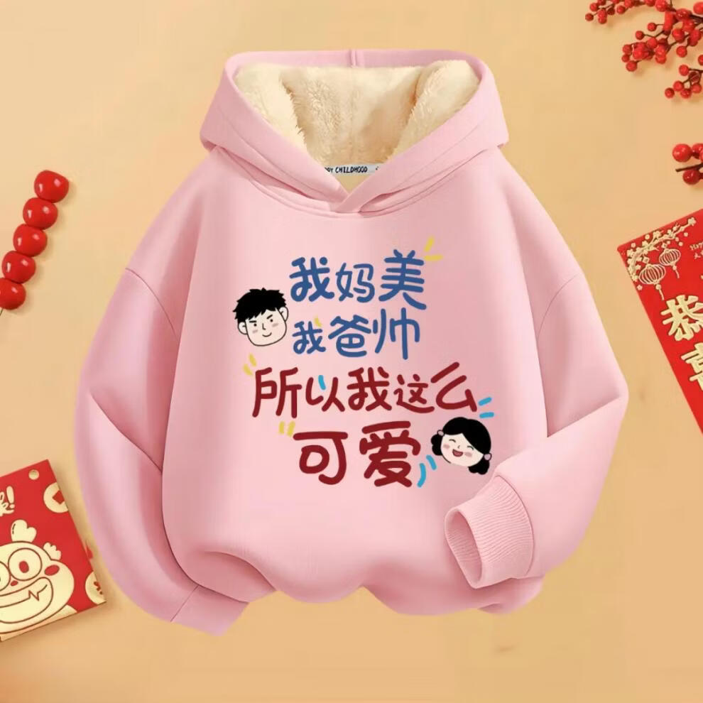 Fragrant red New Year's greetings winter hooded hooded velvet thickened sweatshirt for boys and girls with text clothes 2026 new Chinese style children's red round neck velvet style mom and dad are handsome 90 cm