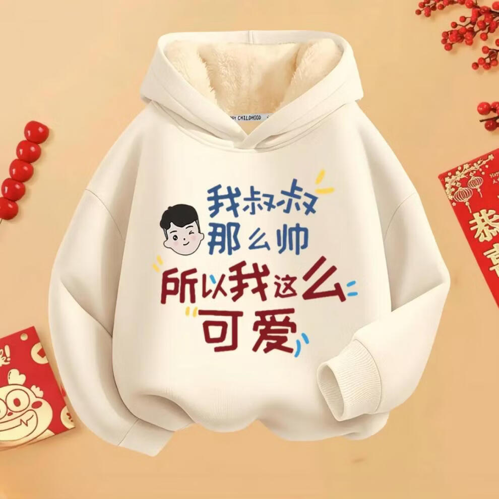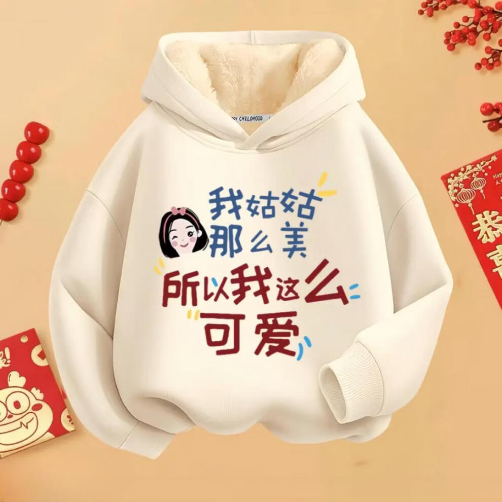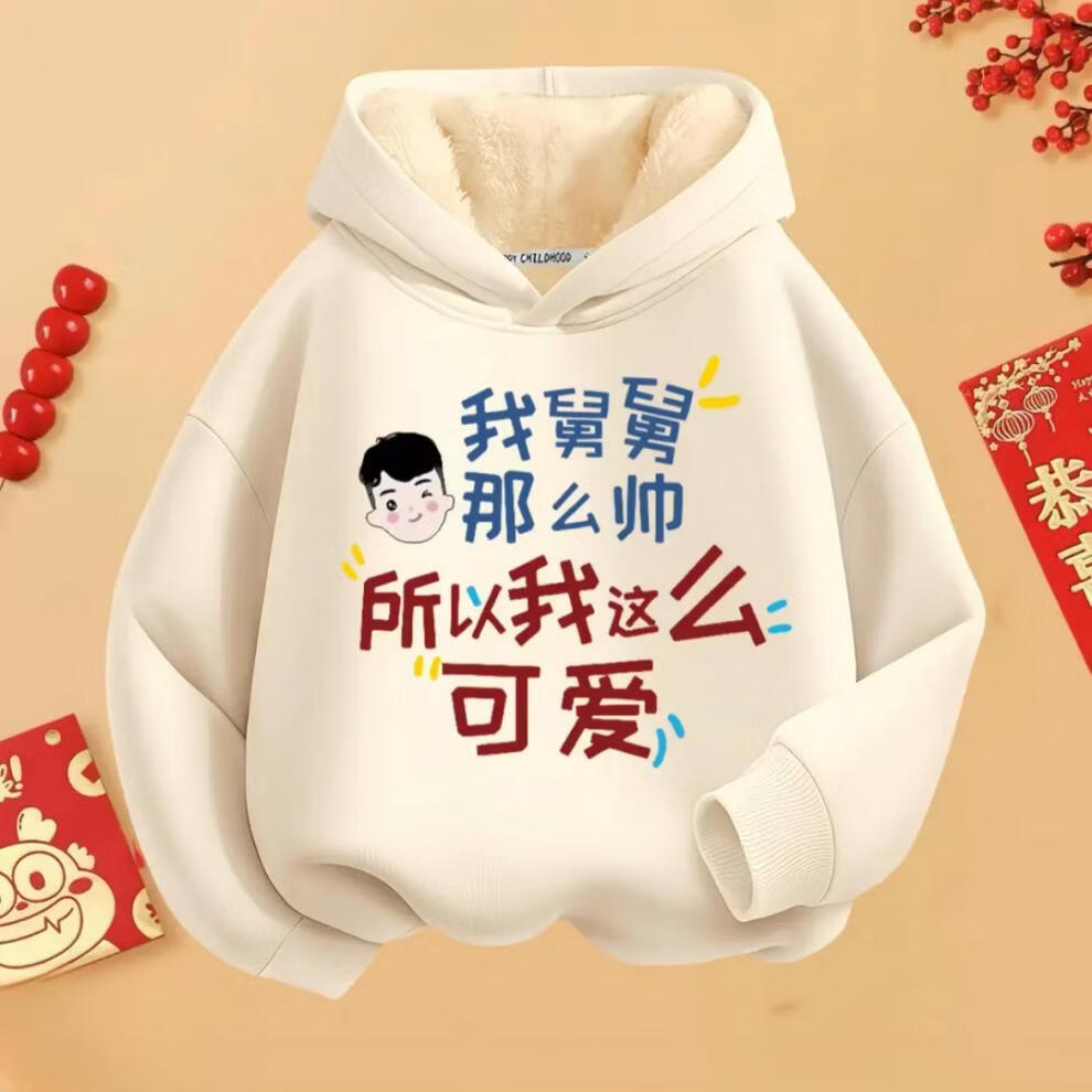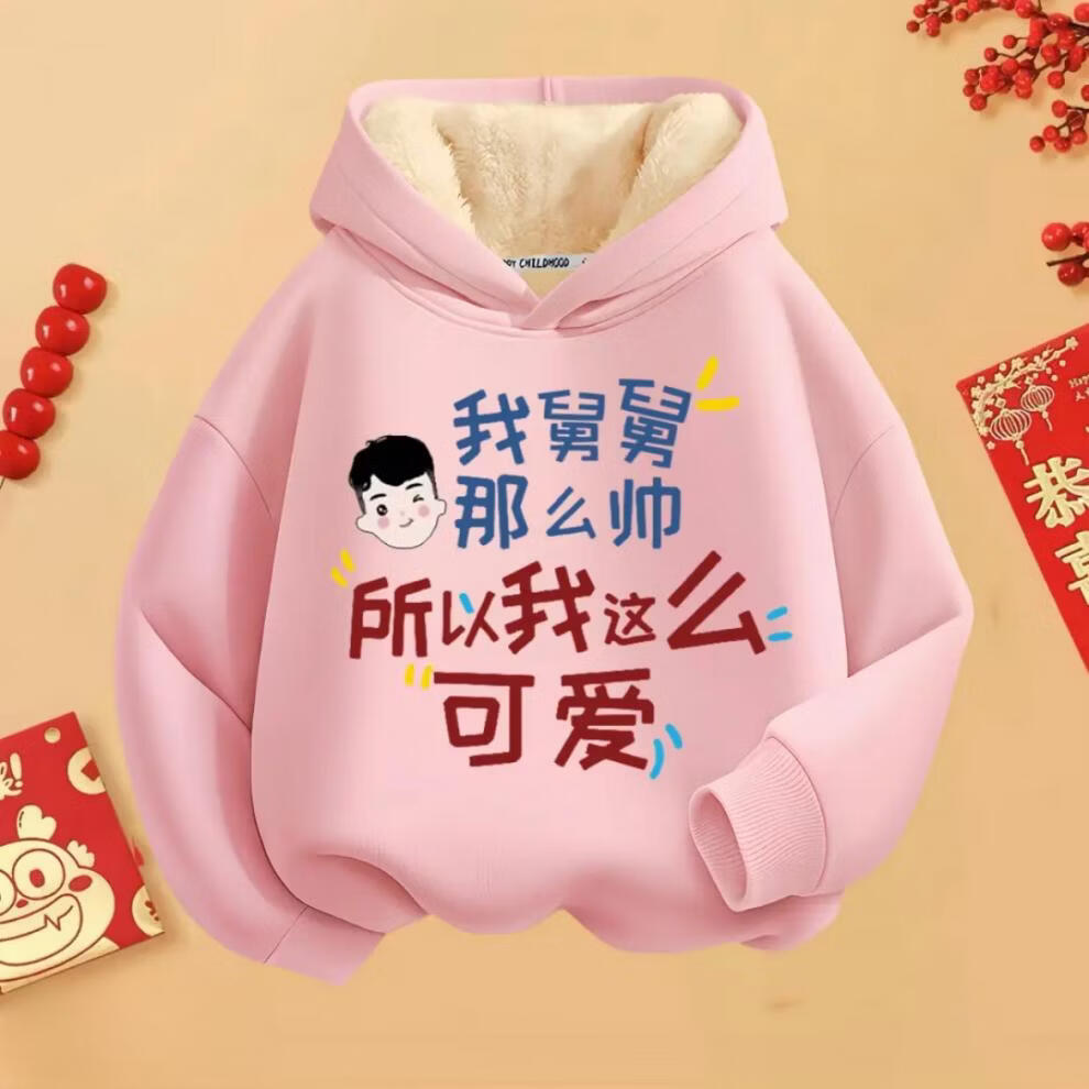 Fragrant red New Year's greetings winter hooded hooded velvet thickened sweatshirt for boys and girls with text clothes 2026 new Chinese style children's red round neck velvet style mom and dad are handsome 90 cm