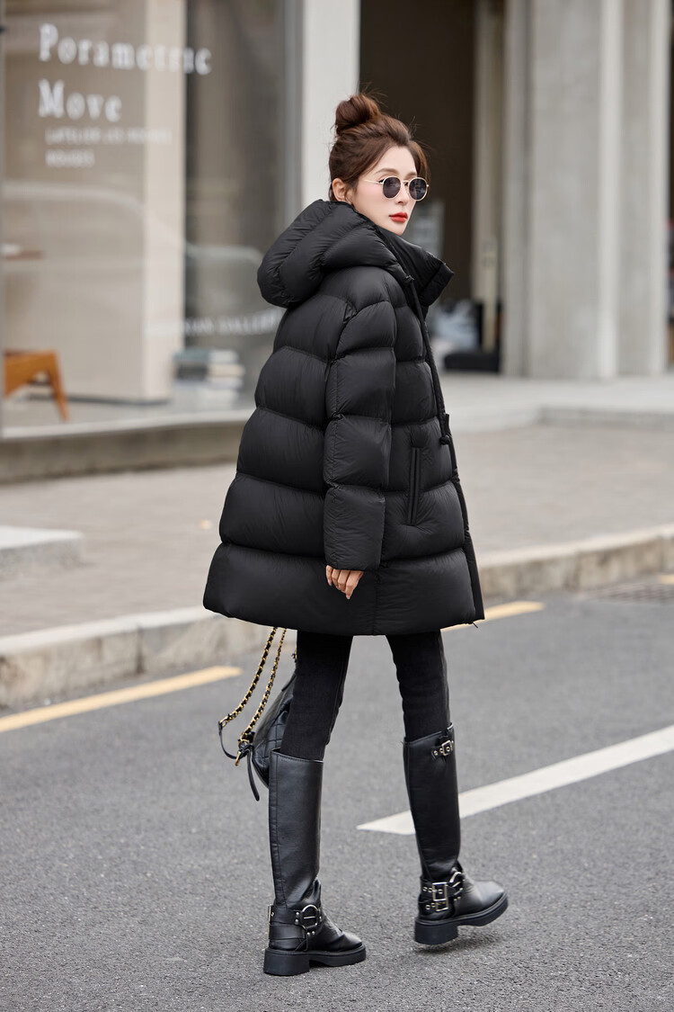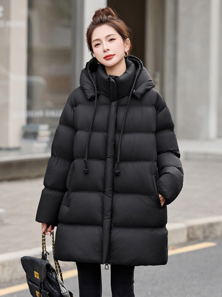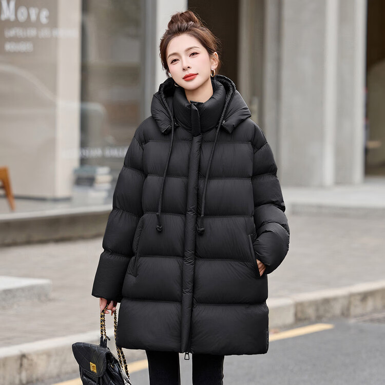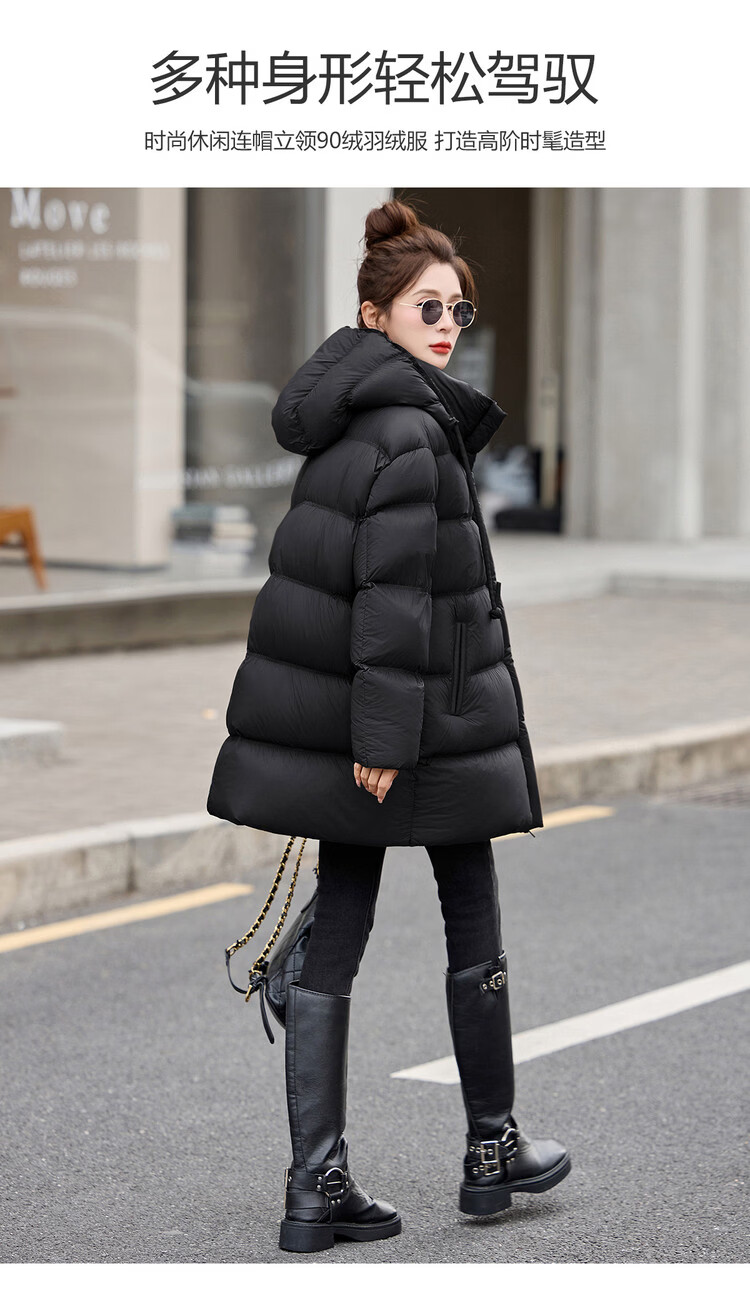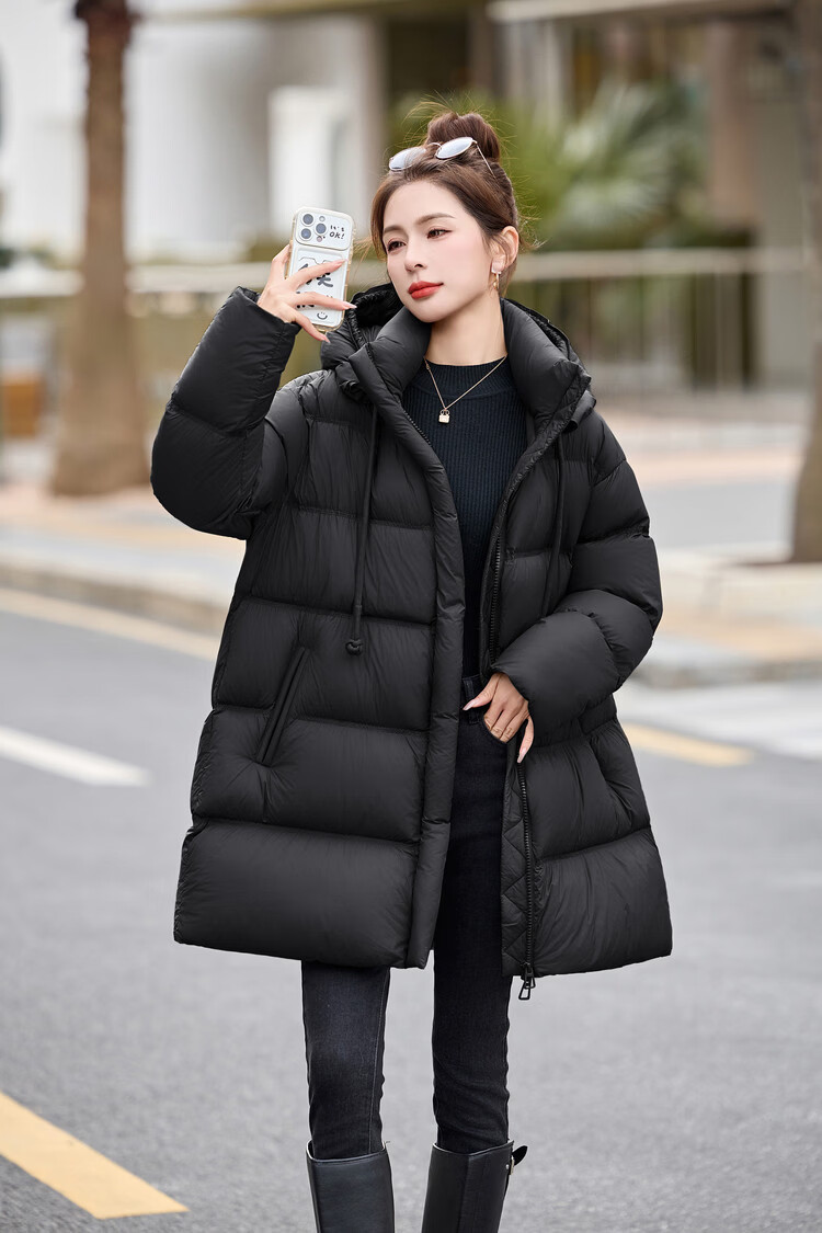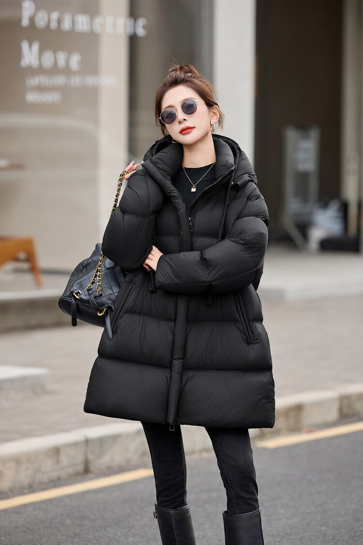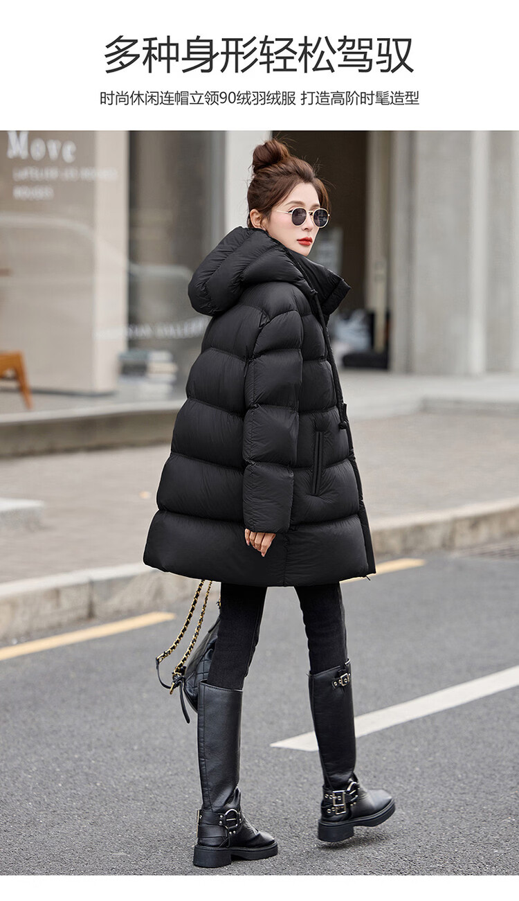 ROMON High-end Puff Hooded Down Jacket Women's Mid-Length 2025 Winter New Style Covering Buttocks, Western Style Thickened Warm Jacket, Black M