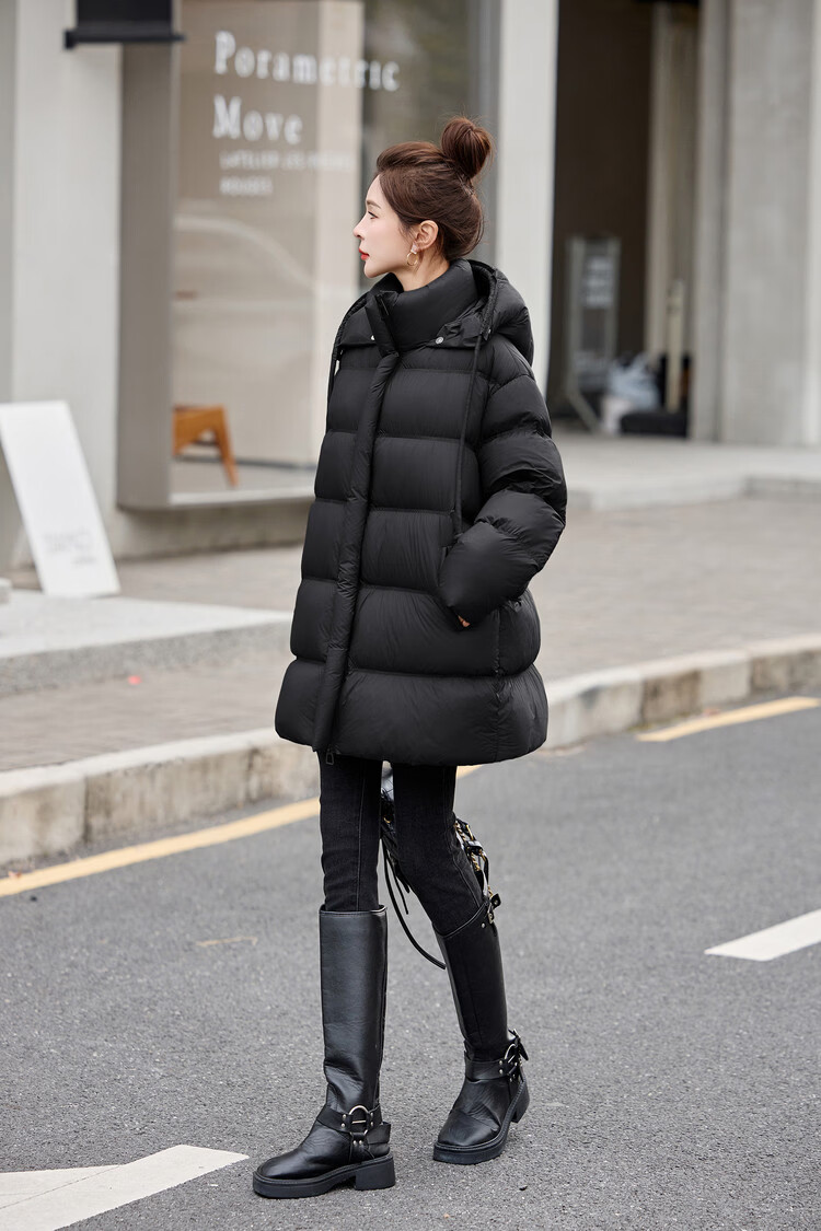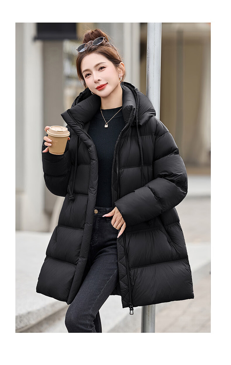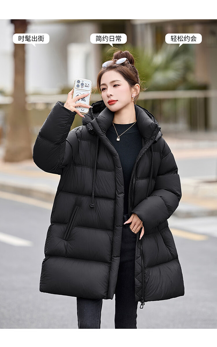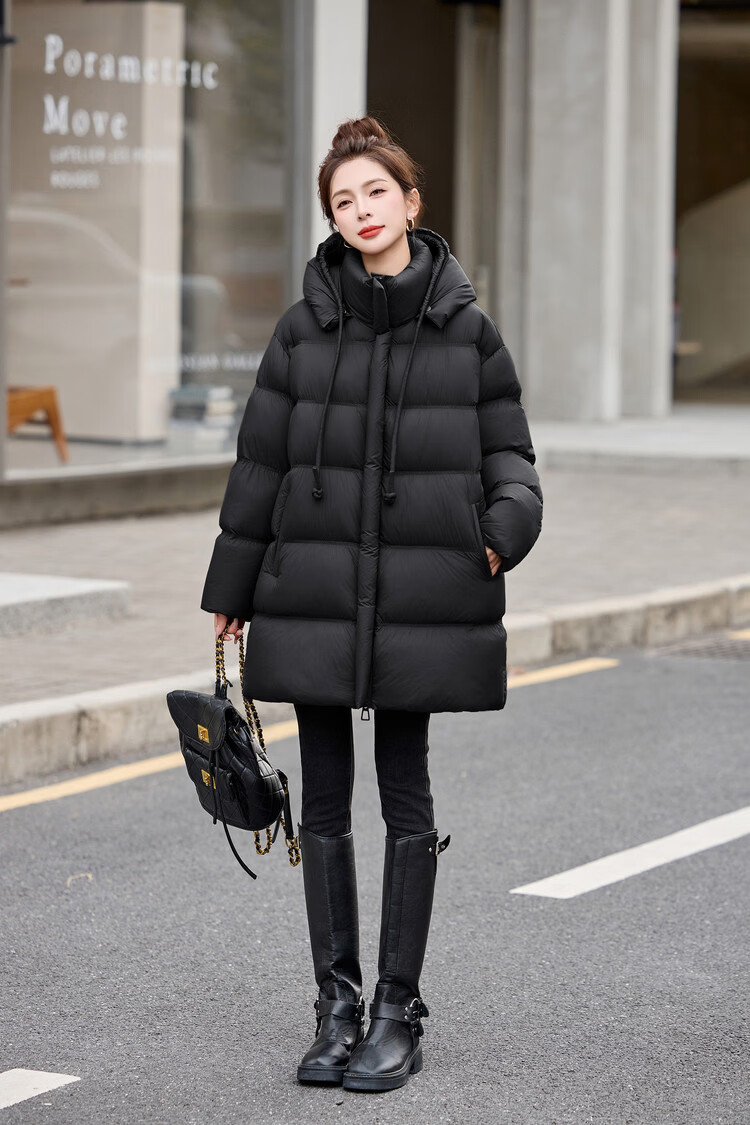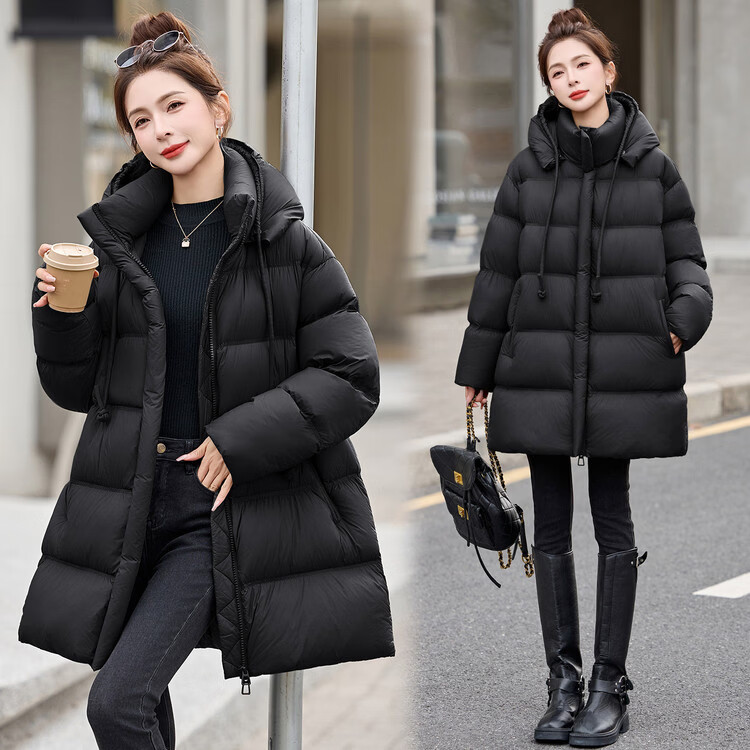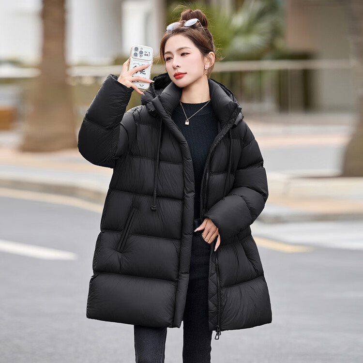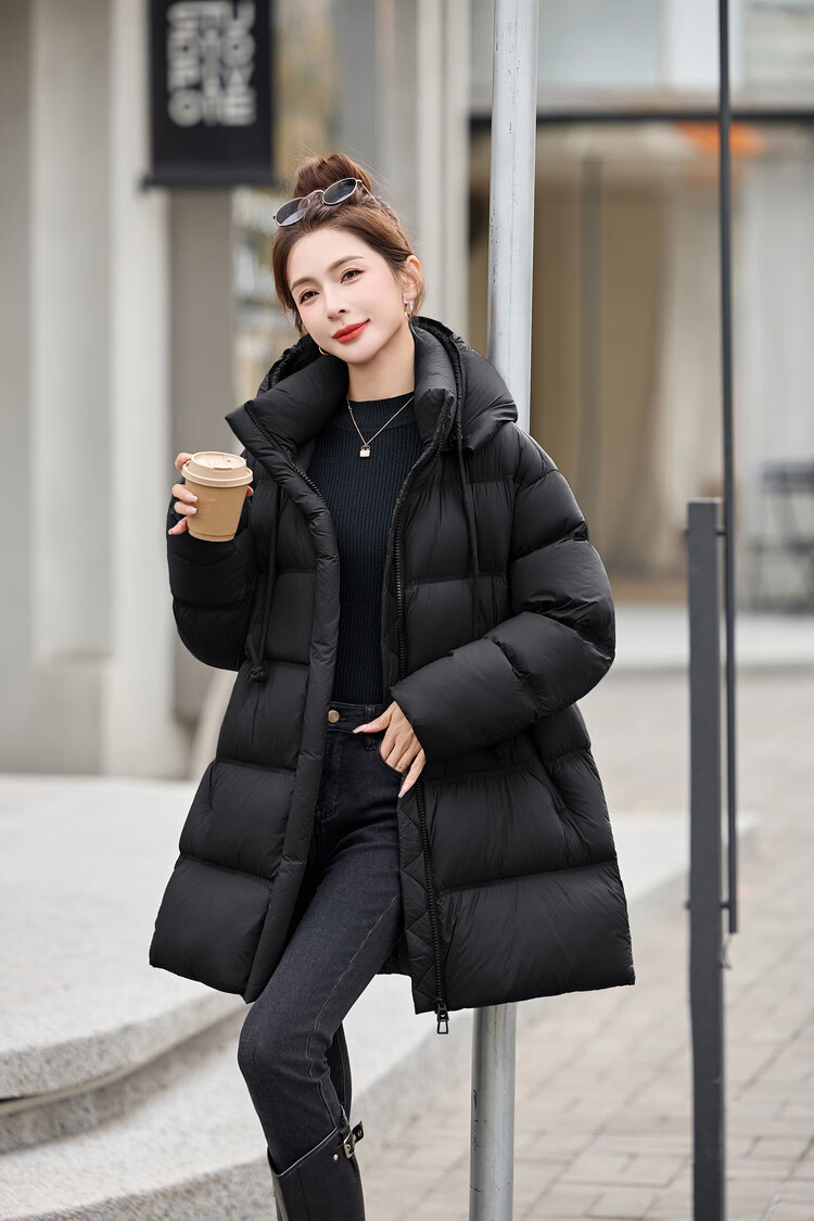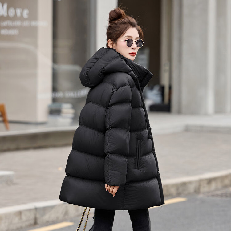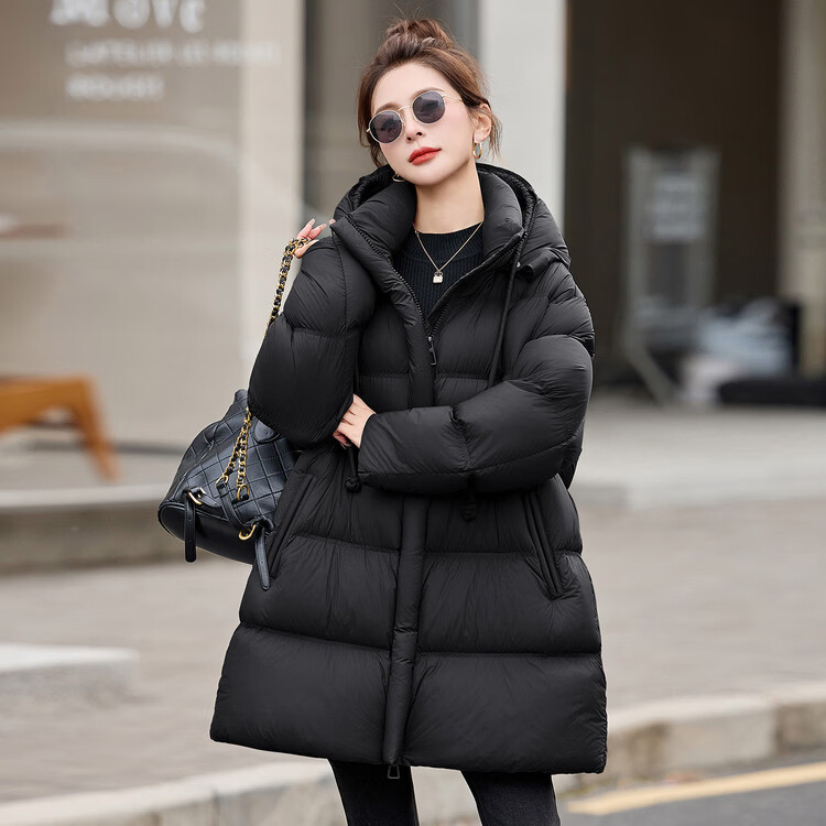 ROMON High-end Puff Hooded Down Jacket Women's Mid-Length 2025 Winter New Style Covering Buttocks, Western Style Thickened Warm Jacket, Black M