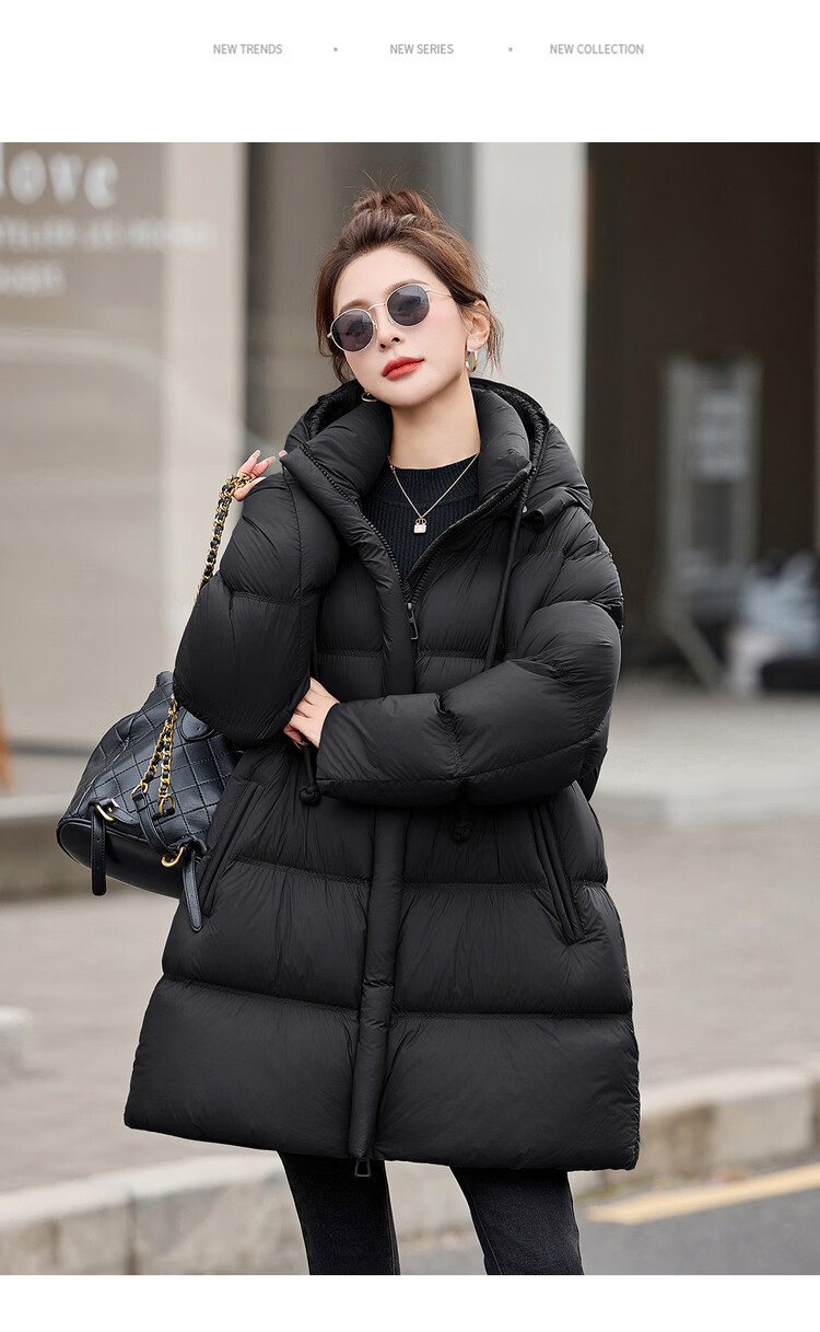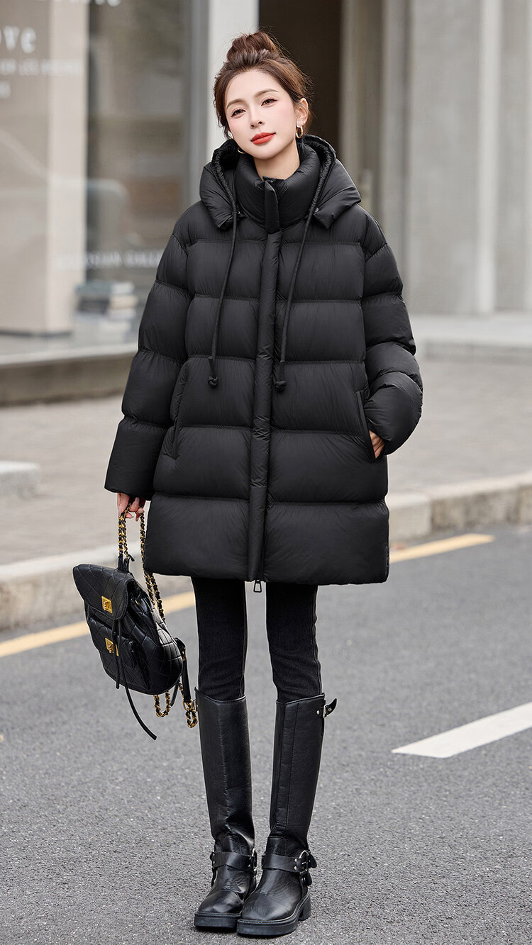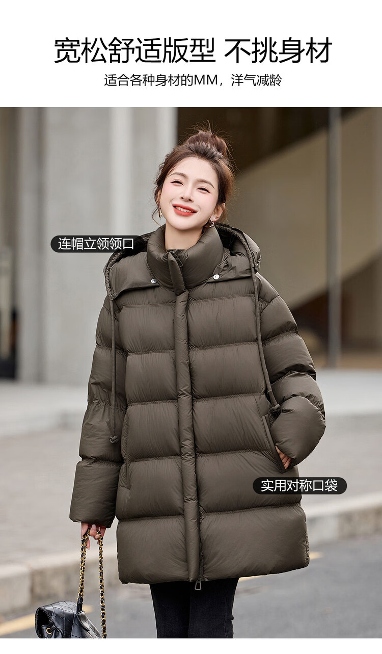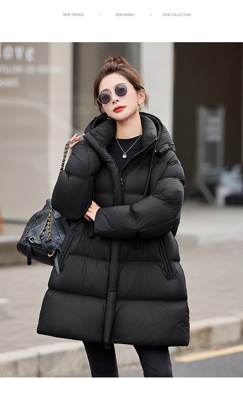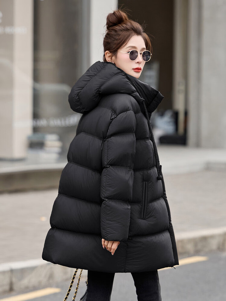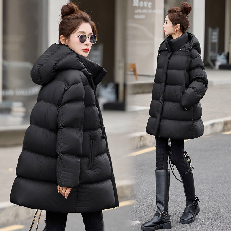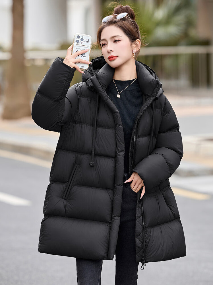 ROMON High-end Puff Hooded Down Jacket Women's Mid-Length 2025 Winter New Style Covering Buttocks, Western Style Thickened Warm Jacket, Black M