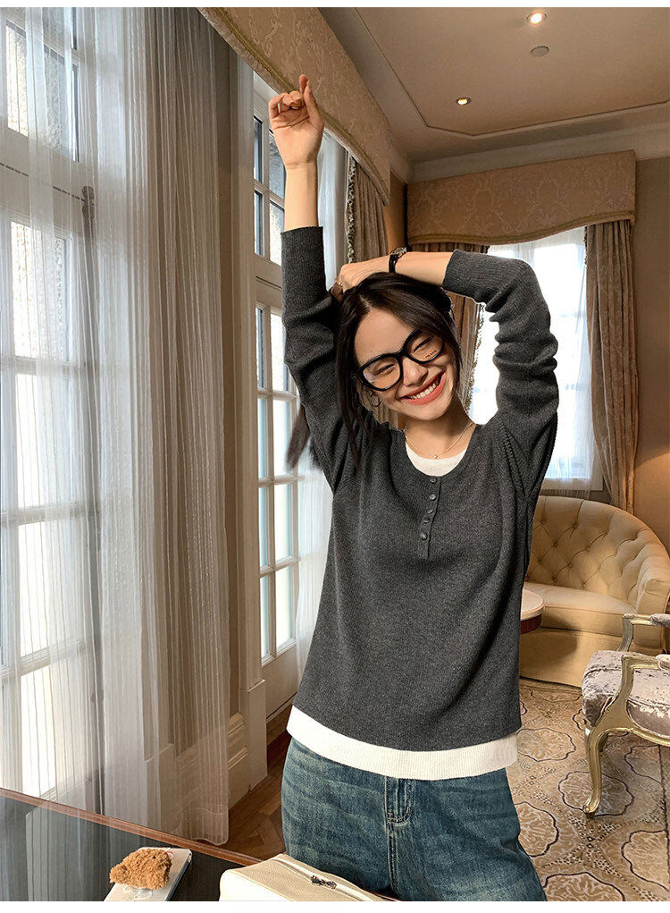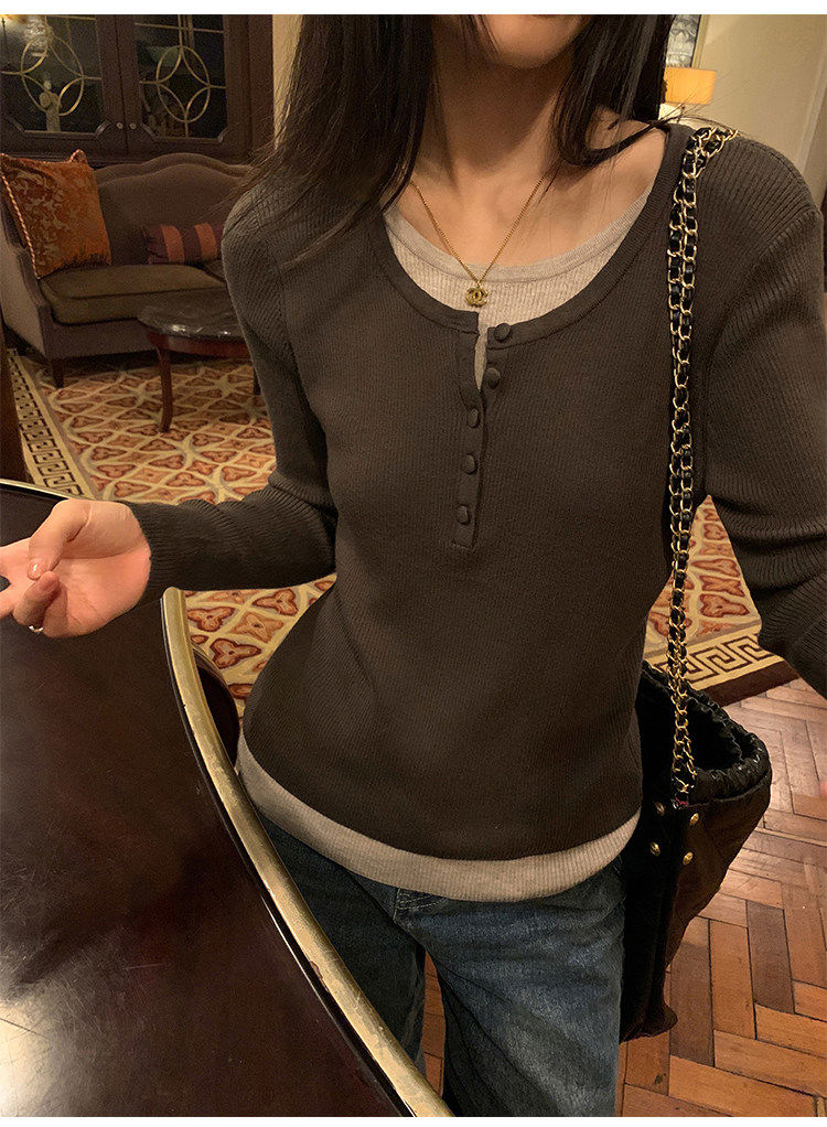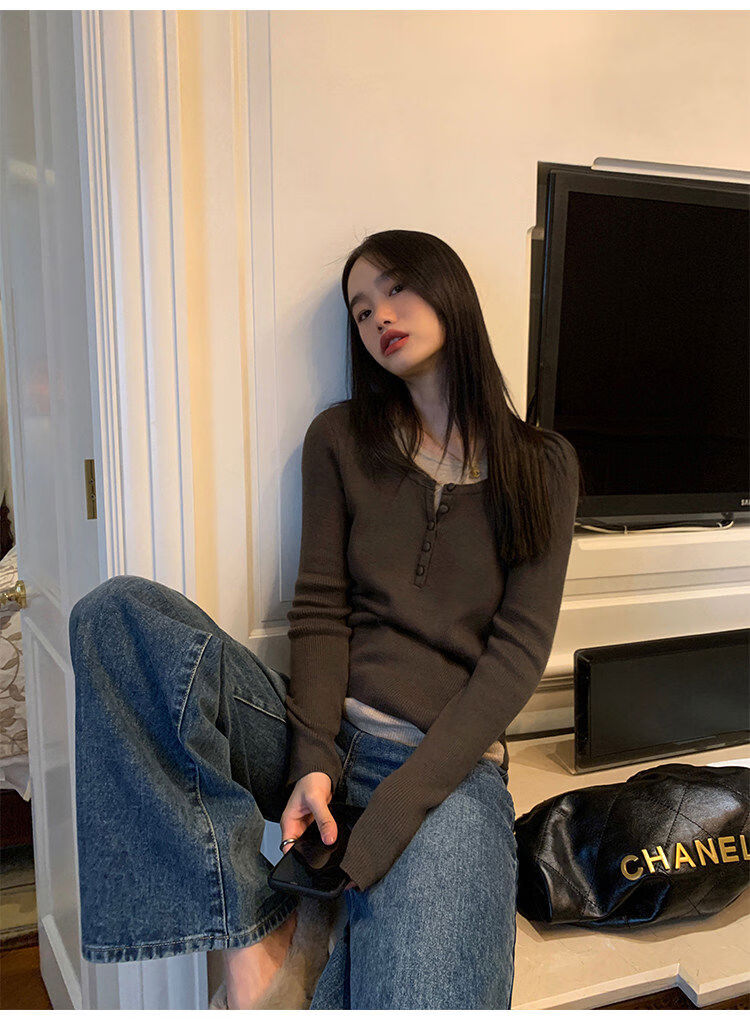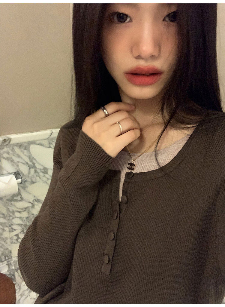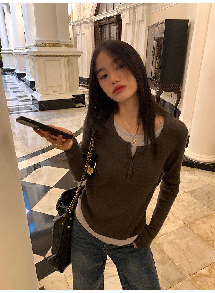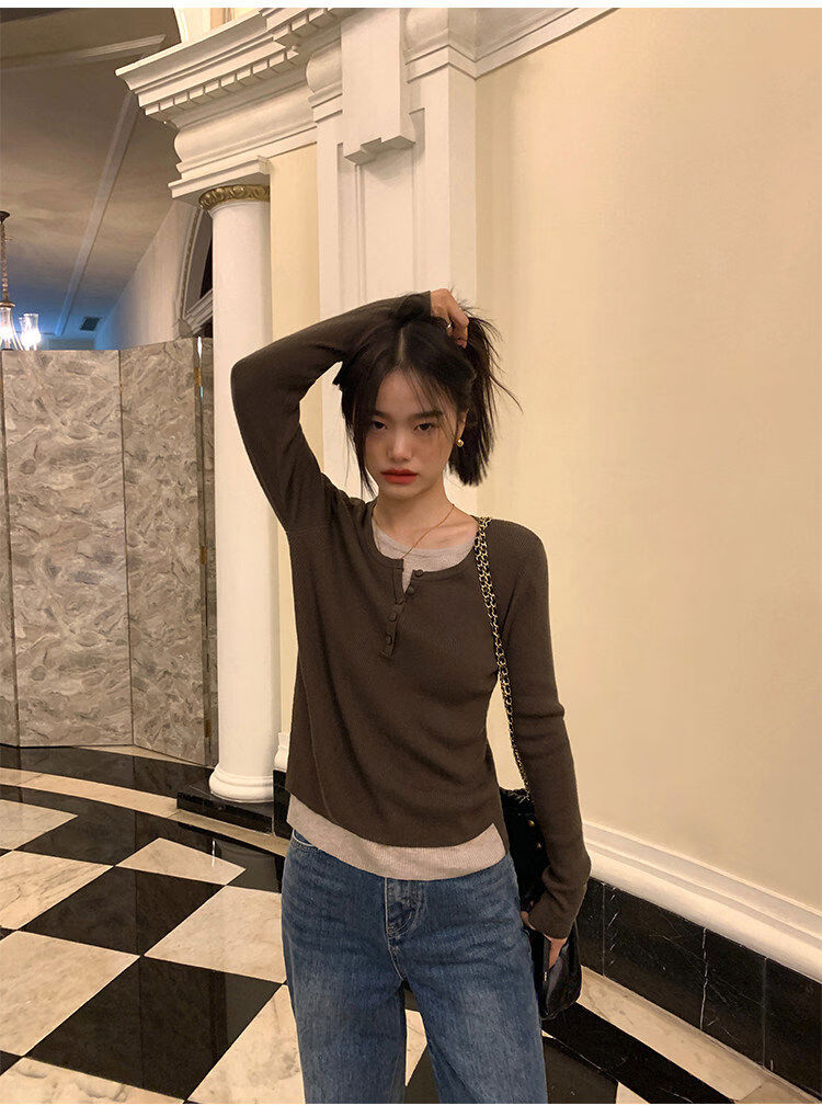 Pusumede fake two piece knitted sweater bottoming shirt for women spring and autumn design loose casual versatile single wear top coffee color ready stock S S