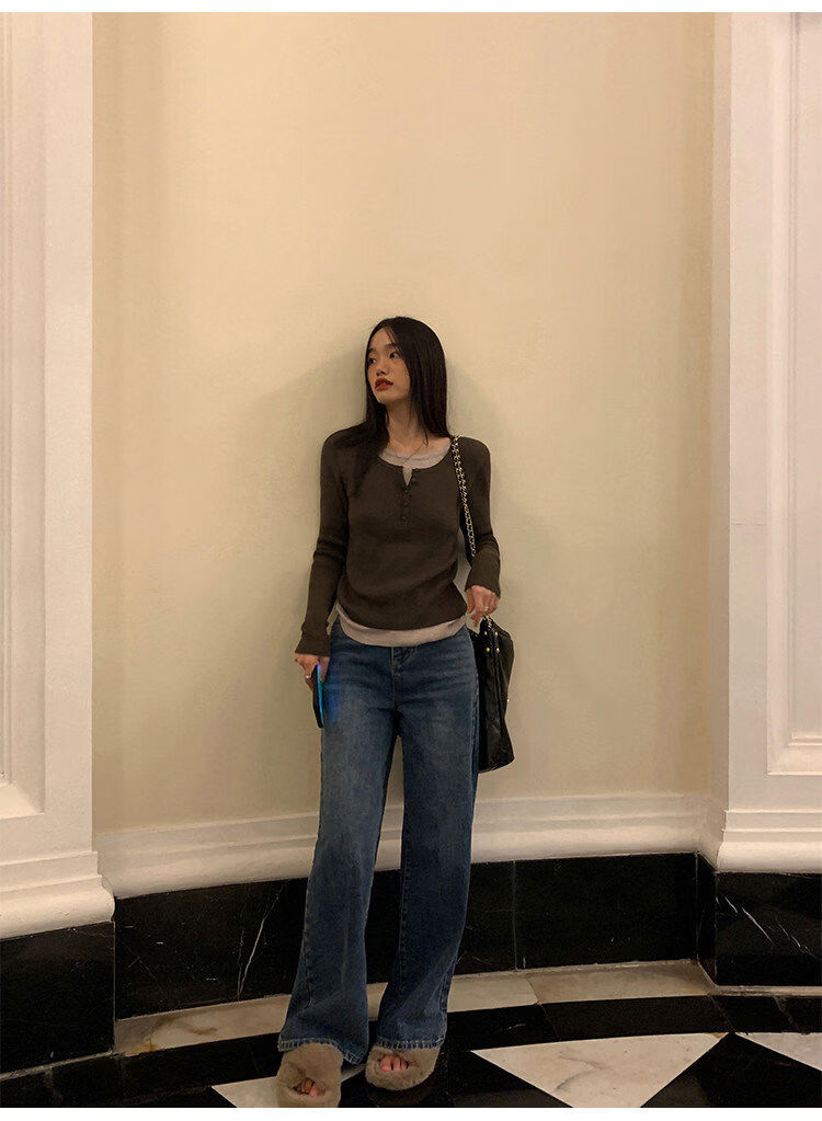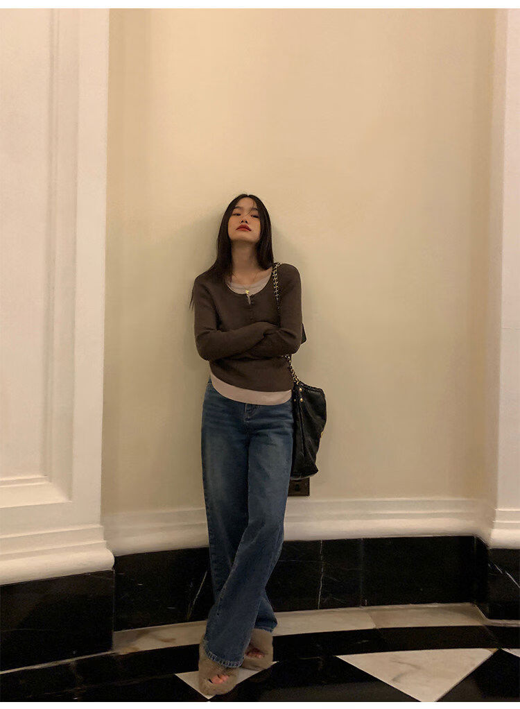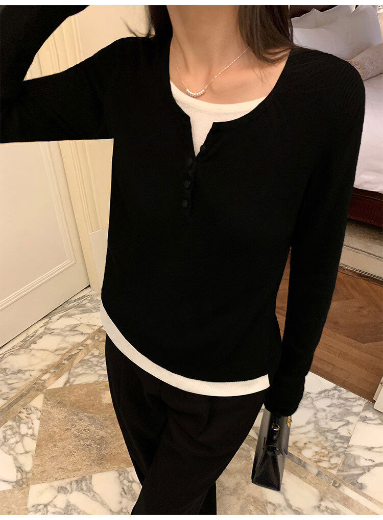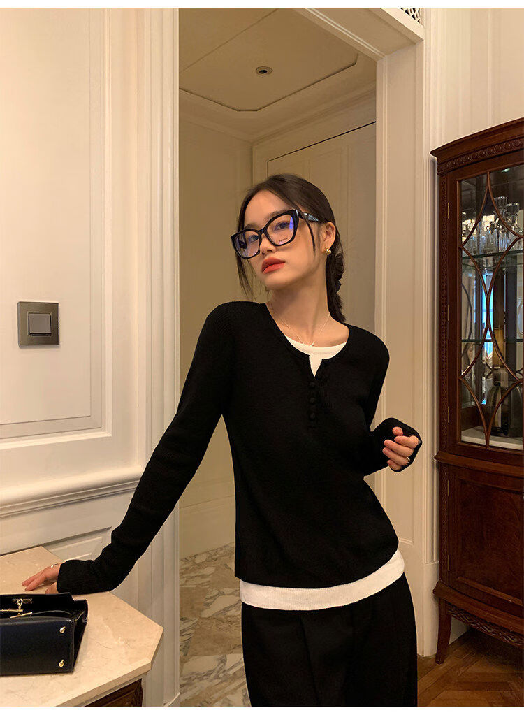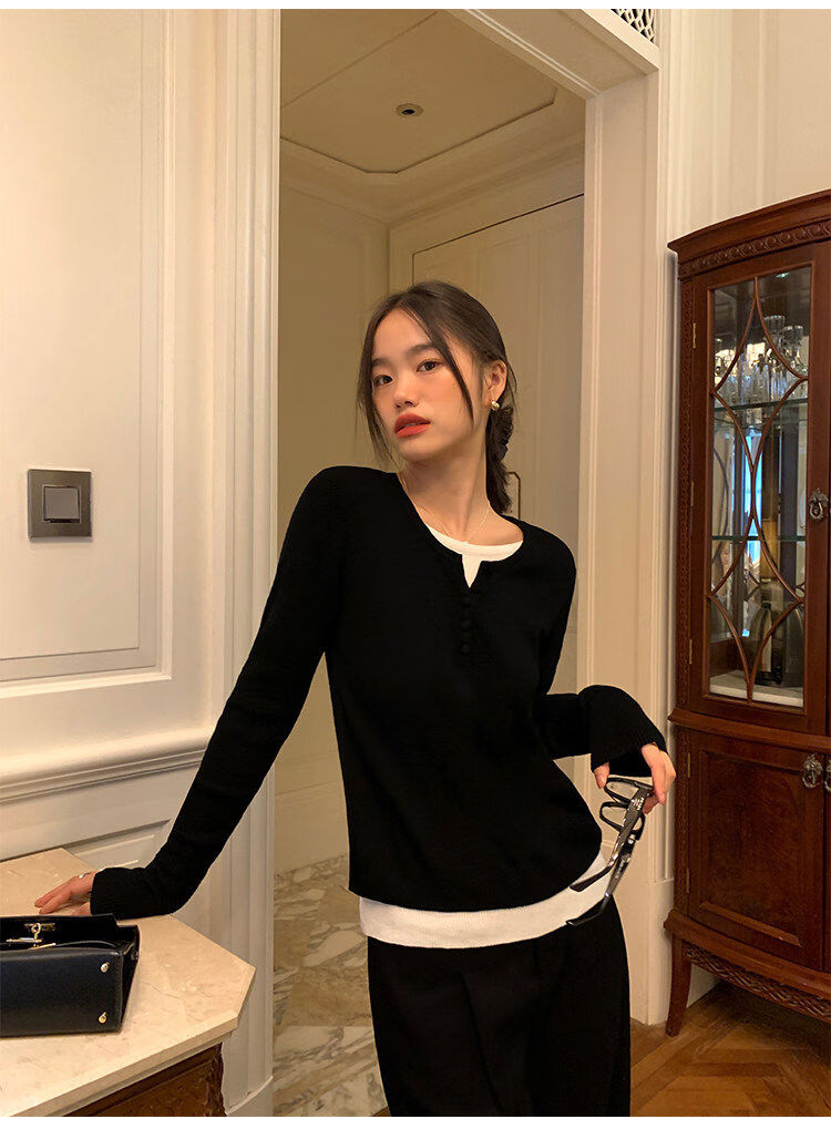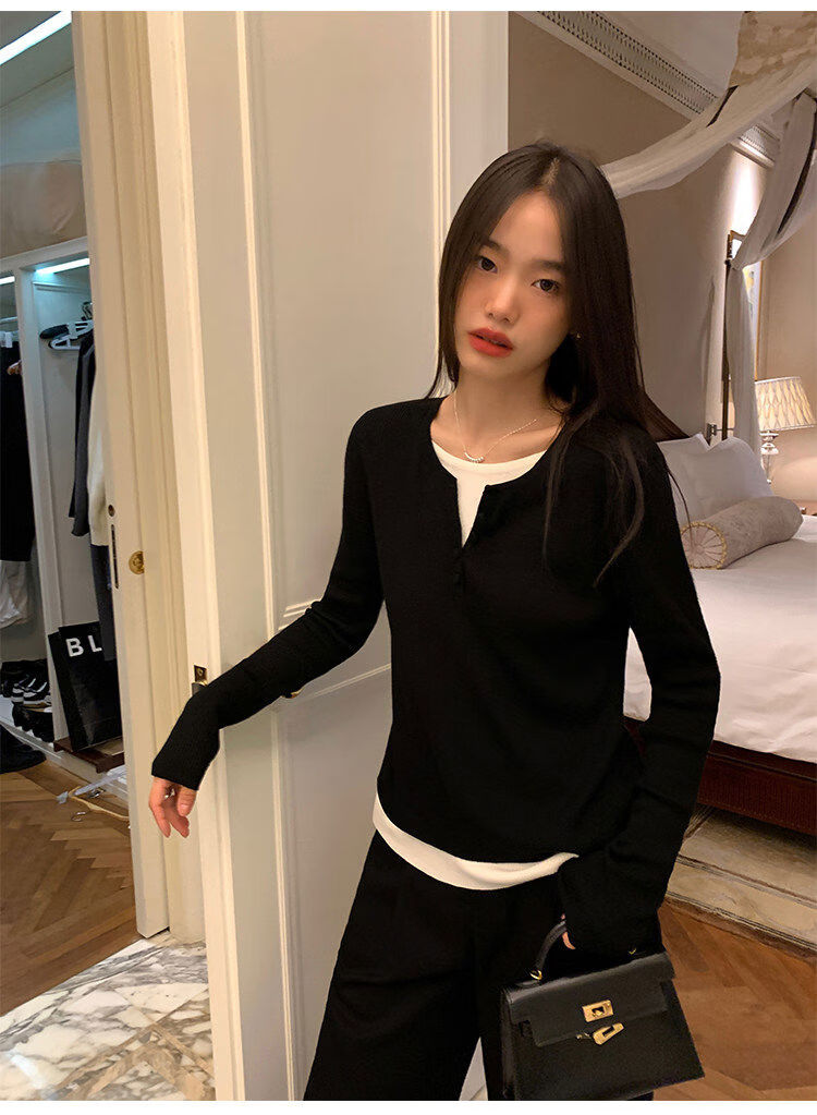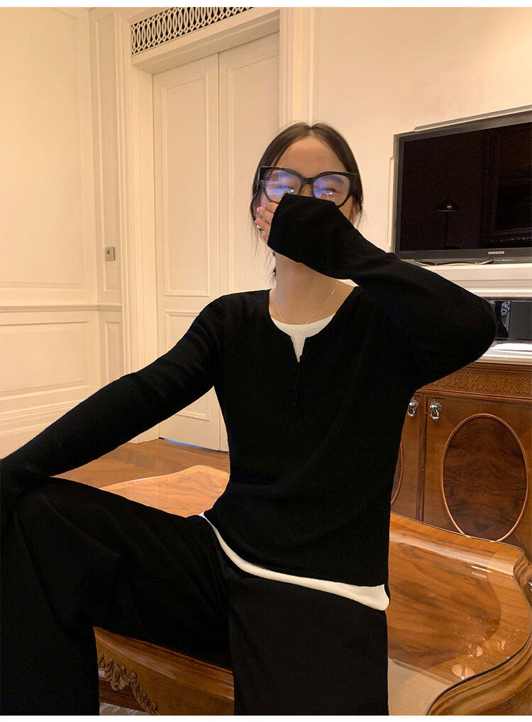 Pusumede fake two piece knitted sweater bottoming shirt for women spring and autumn design loose casual versatile single wear top coffee color ready stock S S