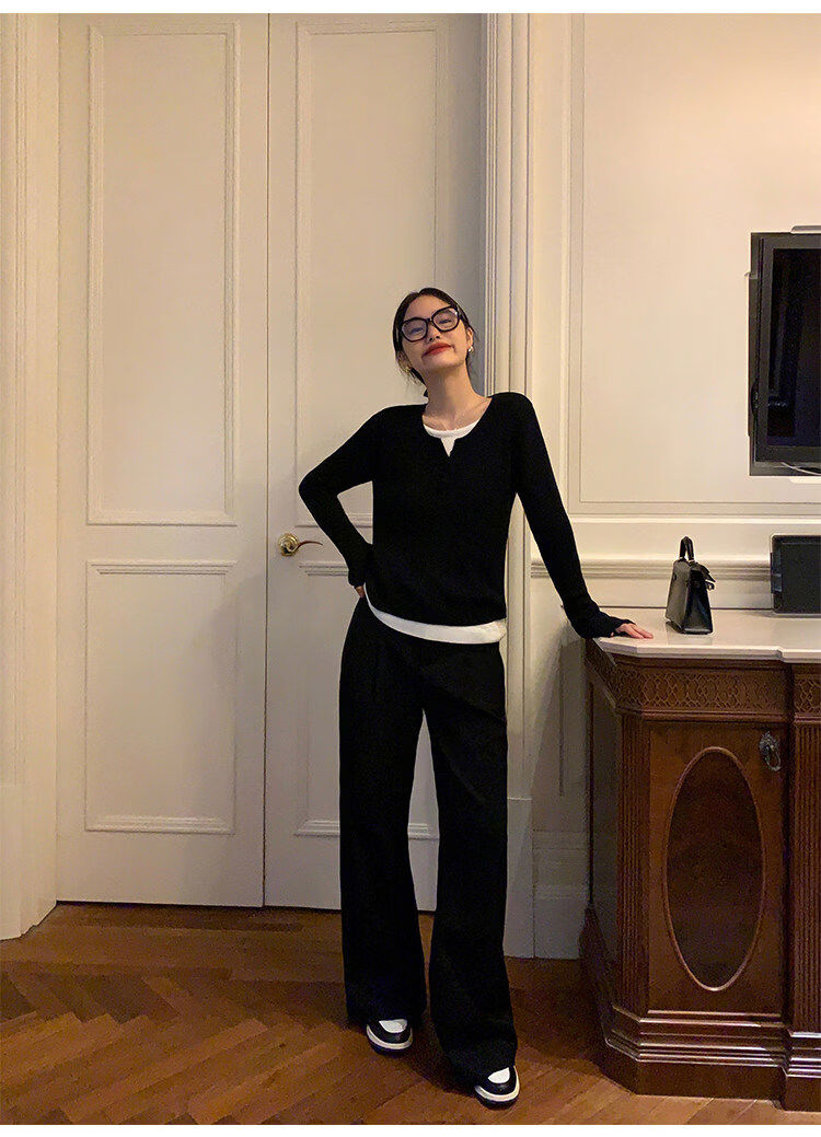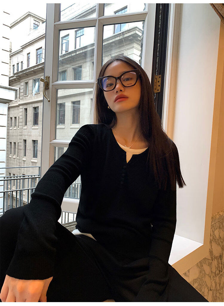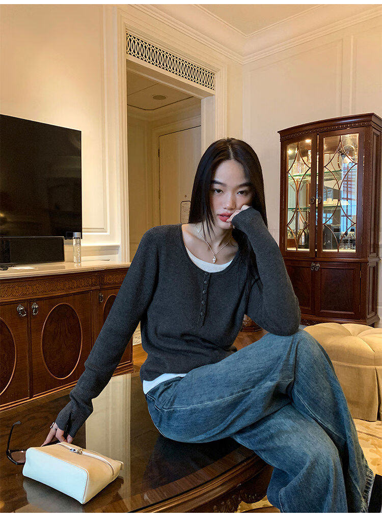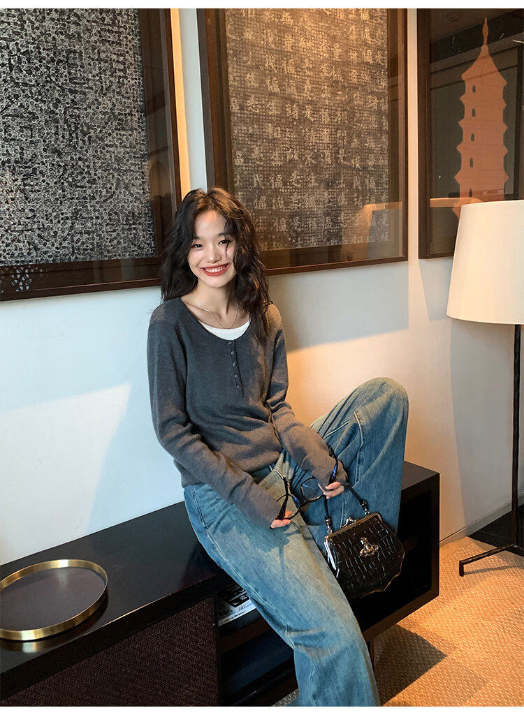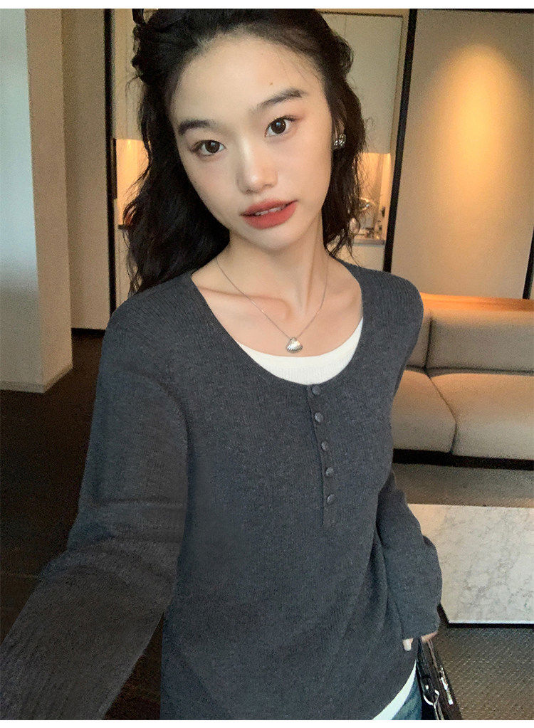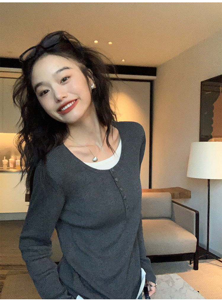 Pusumede fake two piece knitted sweater bottoming shirt for women spring and autumn design loose casual versatile single wear top coffee color ready stock S S