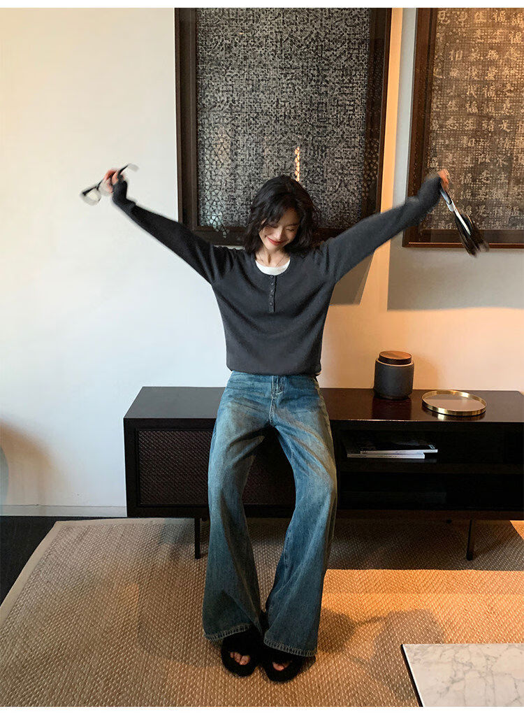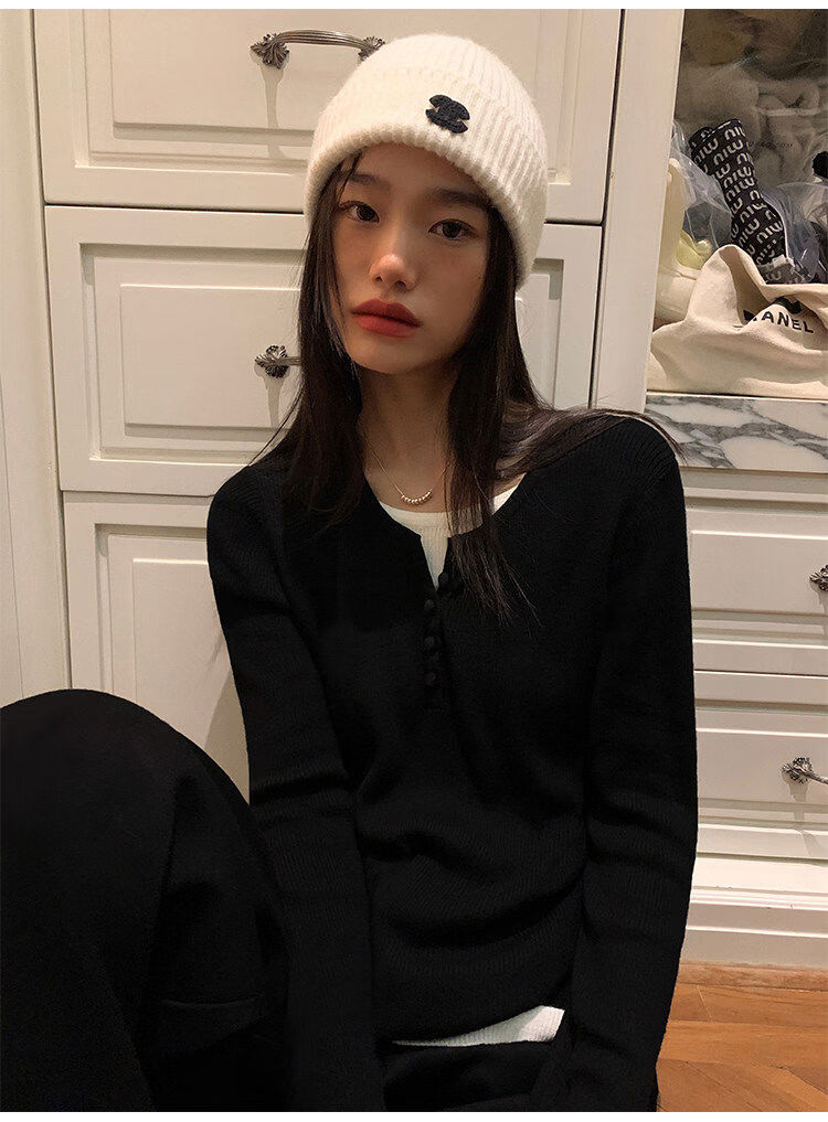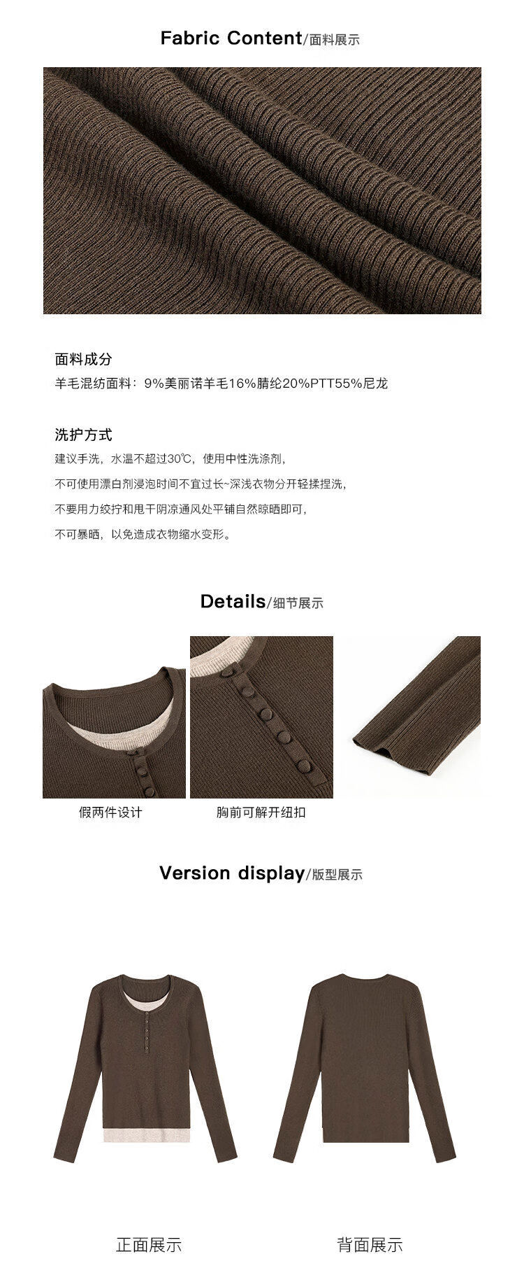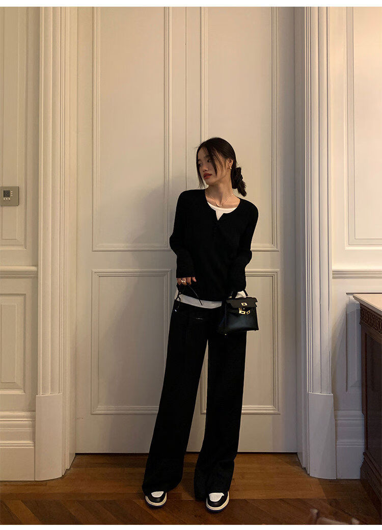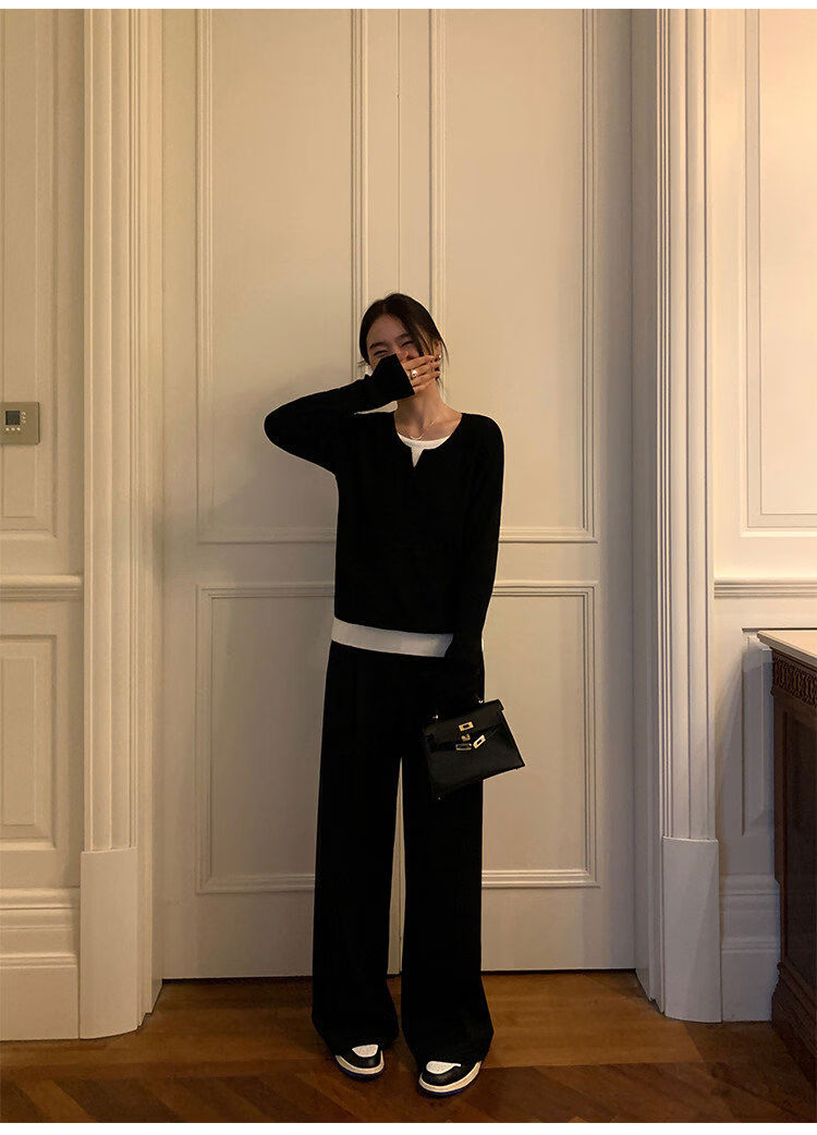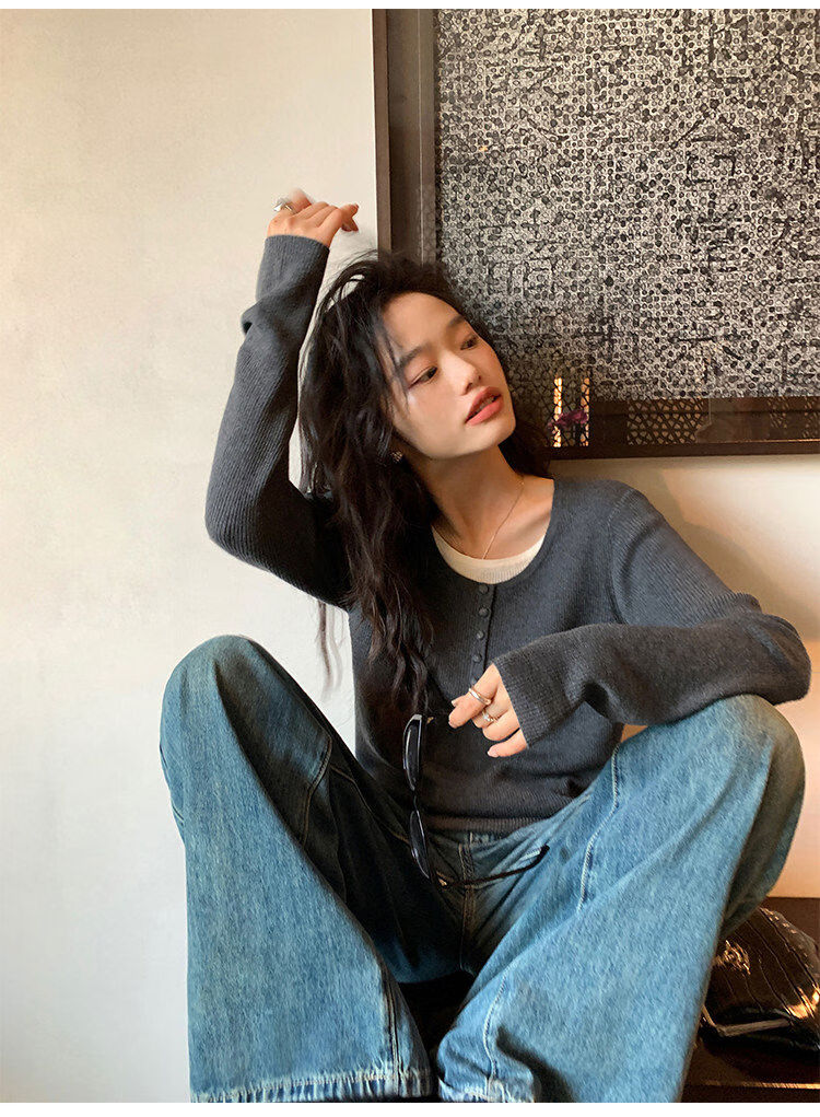 Pusumede fake two piece knitted sweater bottoming shirt for women spring and autumn design loose casual versatile single wear top coffee color ready stock S S