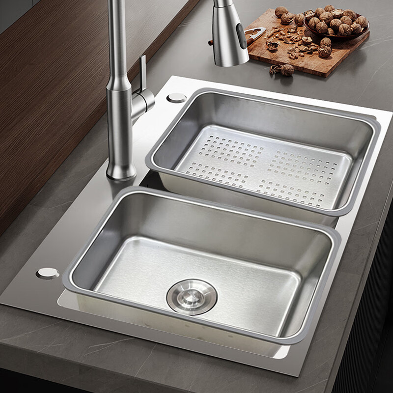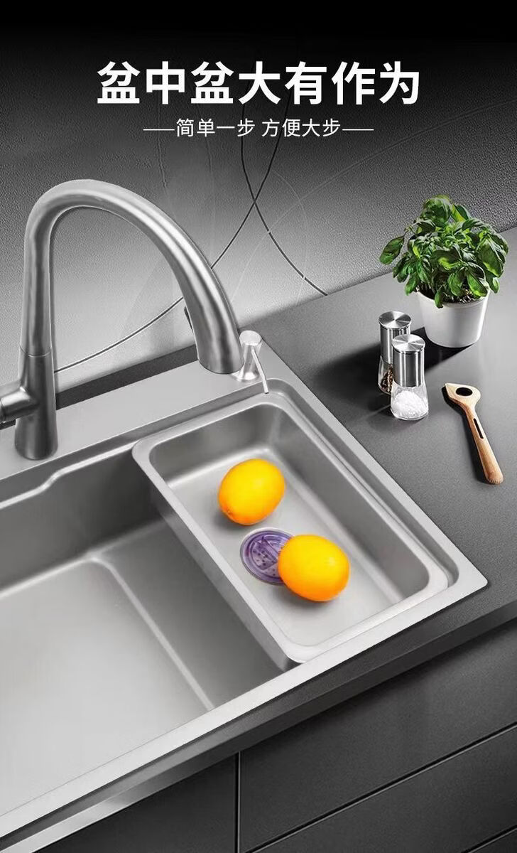 Pupan Kitchen Stainless Steel Deep Basin Middle Basin Sink Large Single Slot Drain Basket Washing Pool Dish Shelf Rack Filter Basin Set Model 304 Brushed Silver Basin Middle Basin 355x250 Inner Diameter 318x2