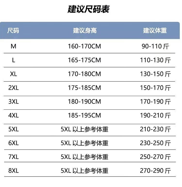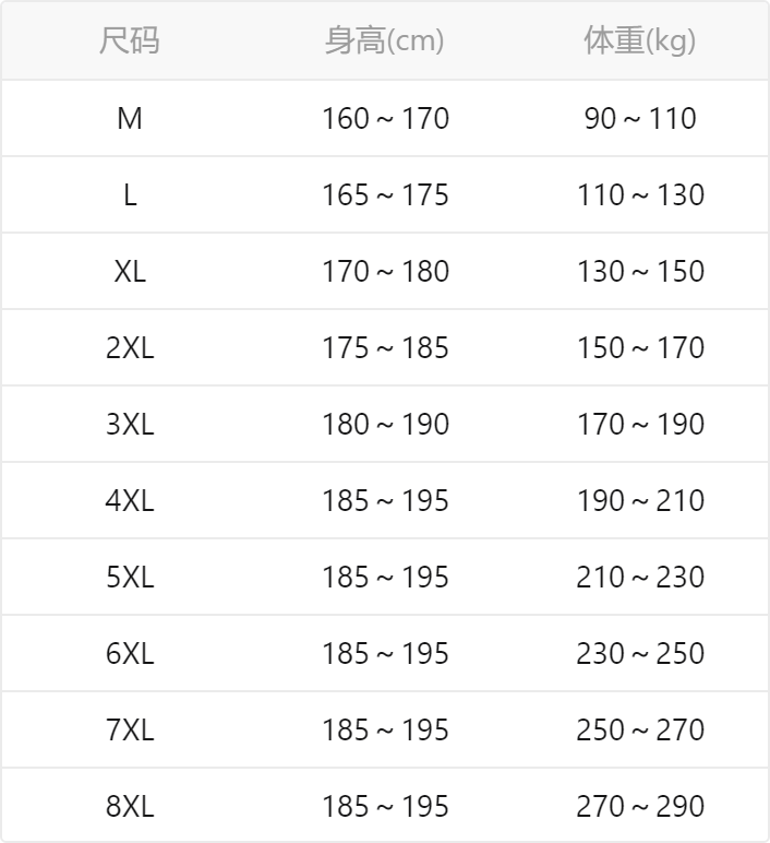 China (cm) 165 / 88-90 170 / 96-98 175 / 108-110 180 / 118-122 185 / 126-130