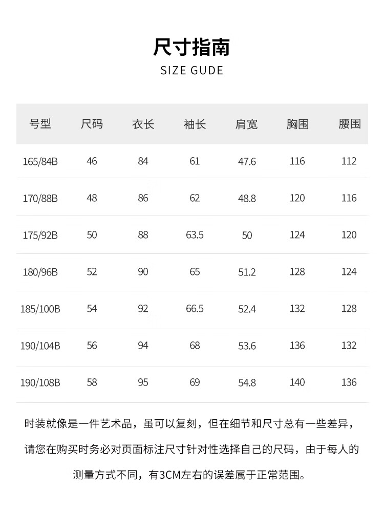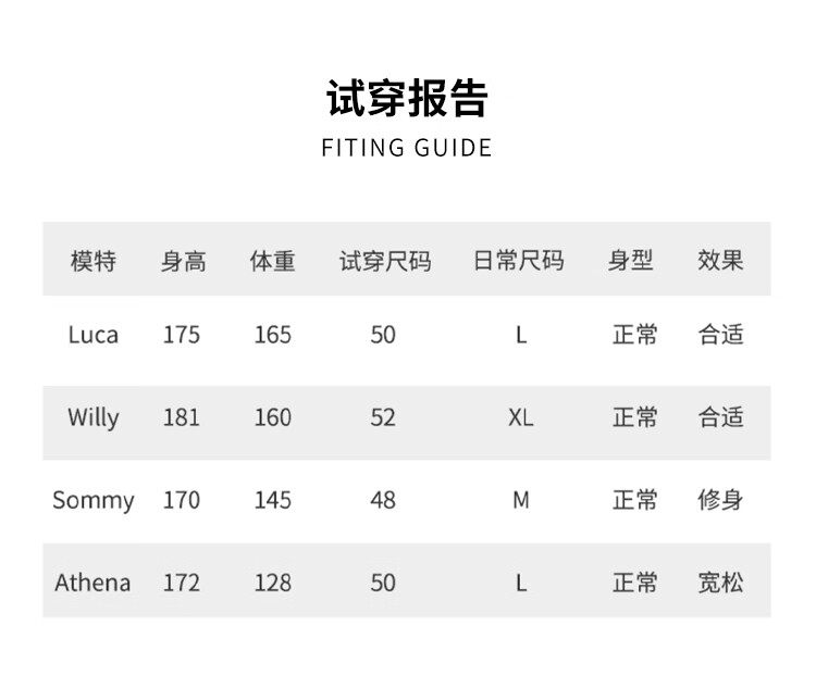 China (cm) 165 / 88-90 170 / 96-98 175 / 108-110 180 / 118-122 185 / 126-130