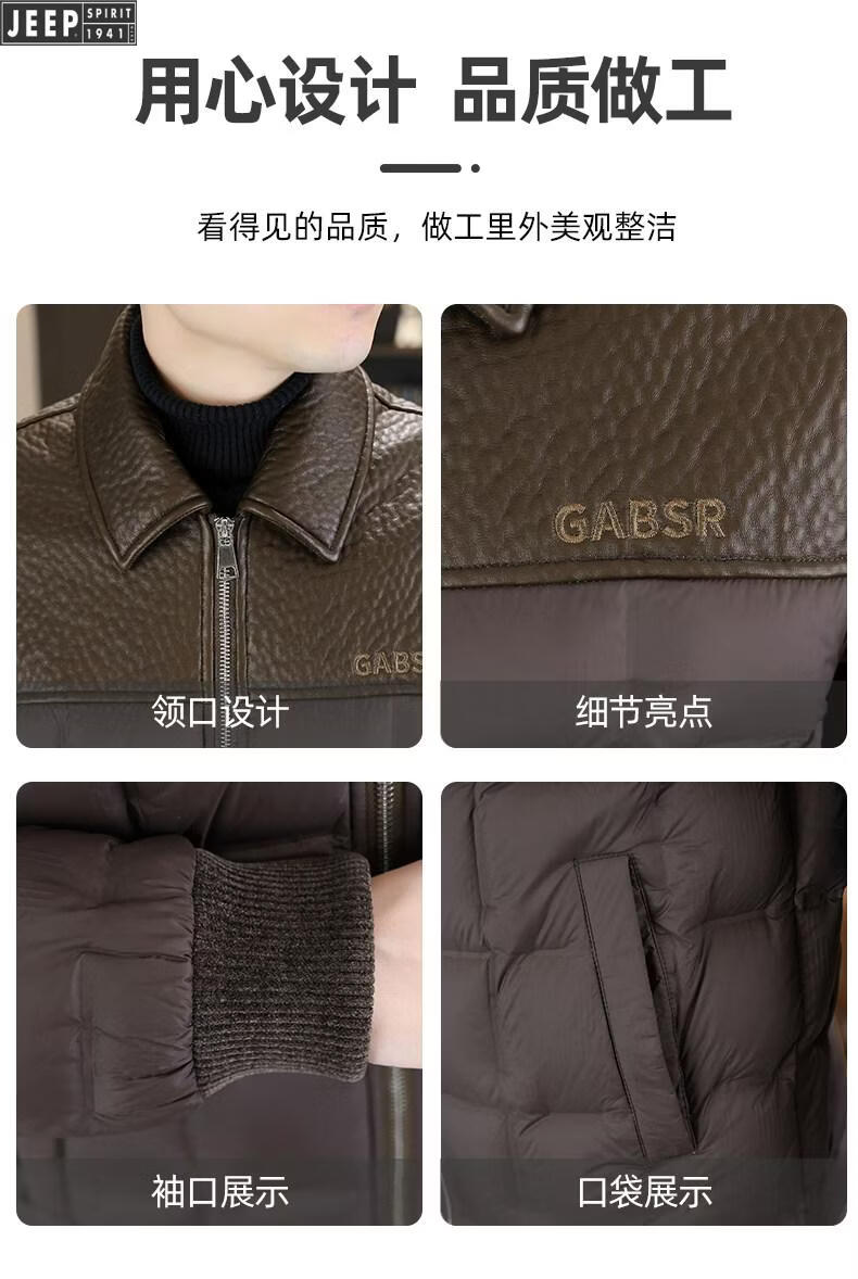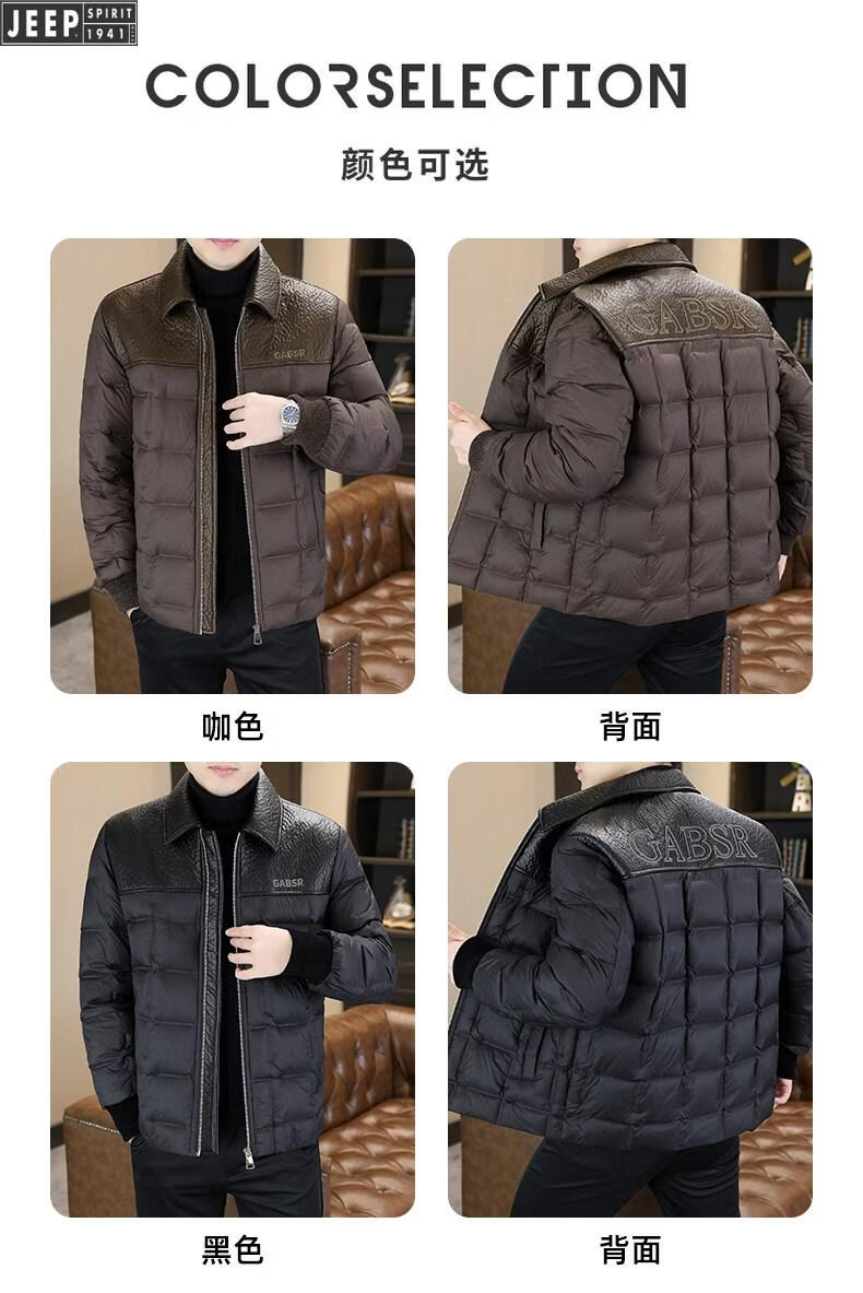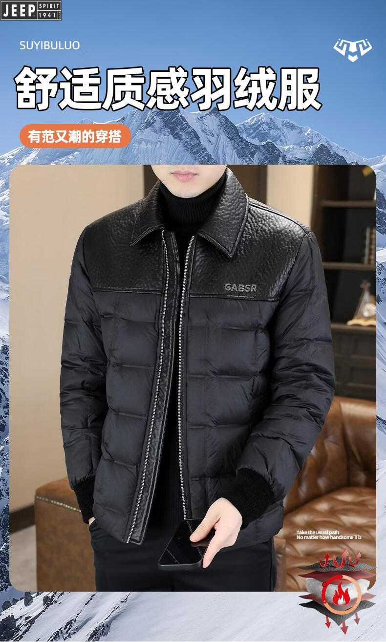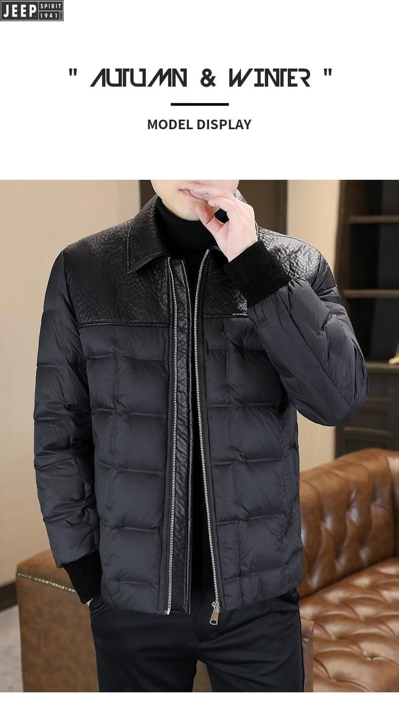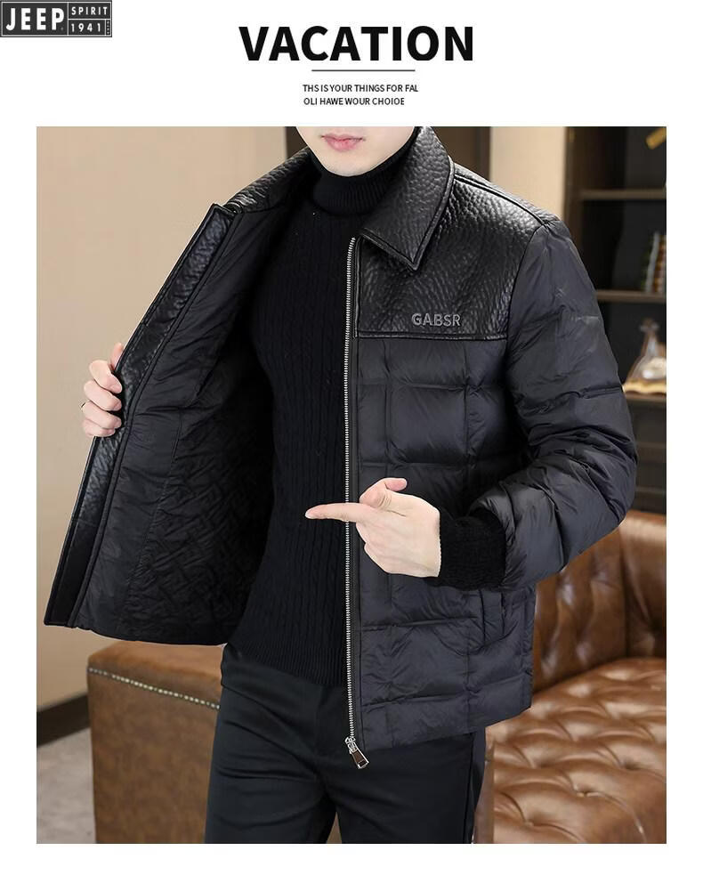 JEEP Jeep men's lapel down jacket winter 2026 new style leather jacket cold-proof warm thickened jacket men's fashion black XL