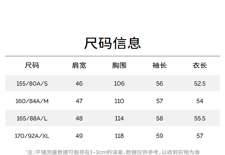 China (cm) 160-165/84-86 165-170 / 88-90 167-172 / 92-96 168-173 / 98-102 170-176 / 106-110