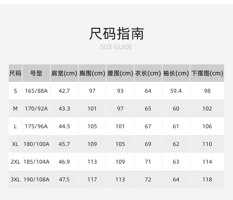 China (cm) 165 / 88-90 170 / 96-98 175 / 108-110 180 / 118-122 185 / 126-130