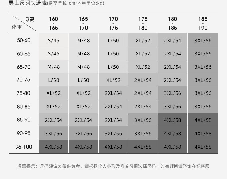 China (cm) 160-165/84-86 165-170 / 88-90 167-172 / 92-96 168-173 / 98-102 170-176 / 106-110