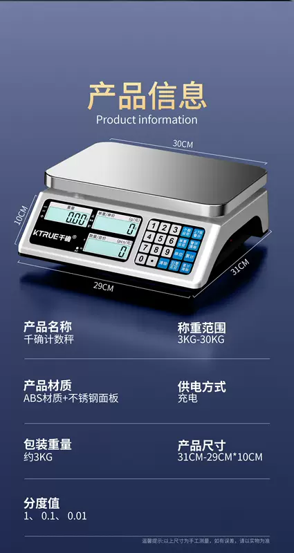 Yusenyi electronic scale precision industrial counting 30kg high-precision gram weighing 0 sampling 01 down gram weight commercial bench scale. Weighing (30kg1g) energy-concentrated lithium battery - single-sided display