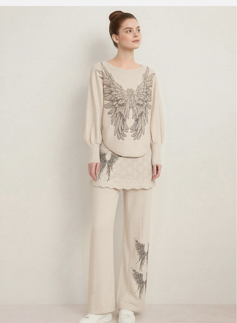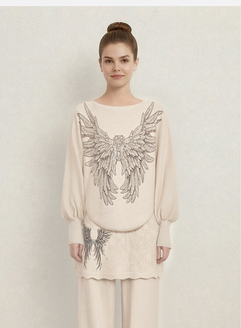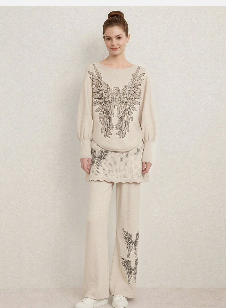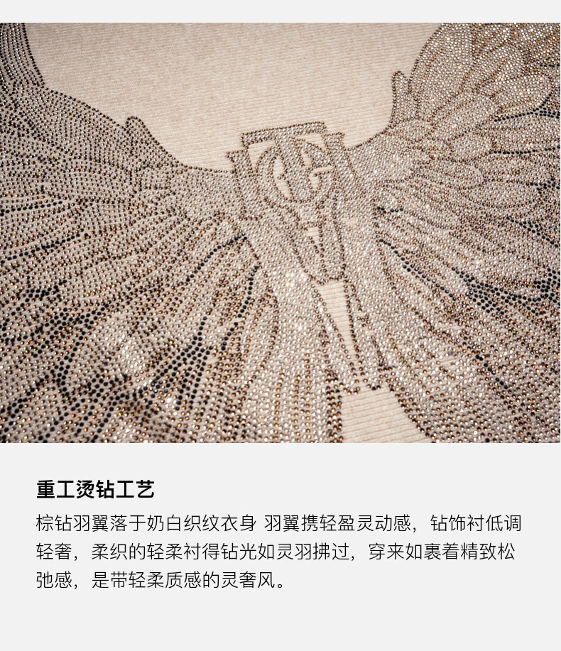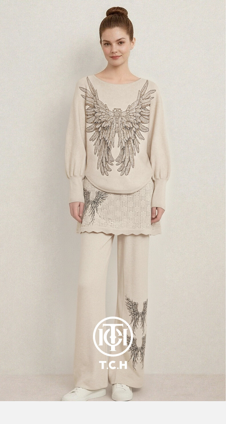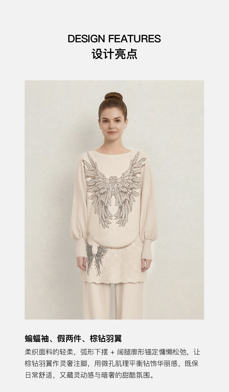 TCH knitted suit for women 26 years early spring model angel wings hot diamond fashion versatile temperament elegant style culottes two-piece set off-white S
