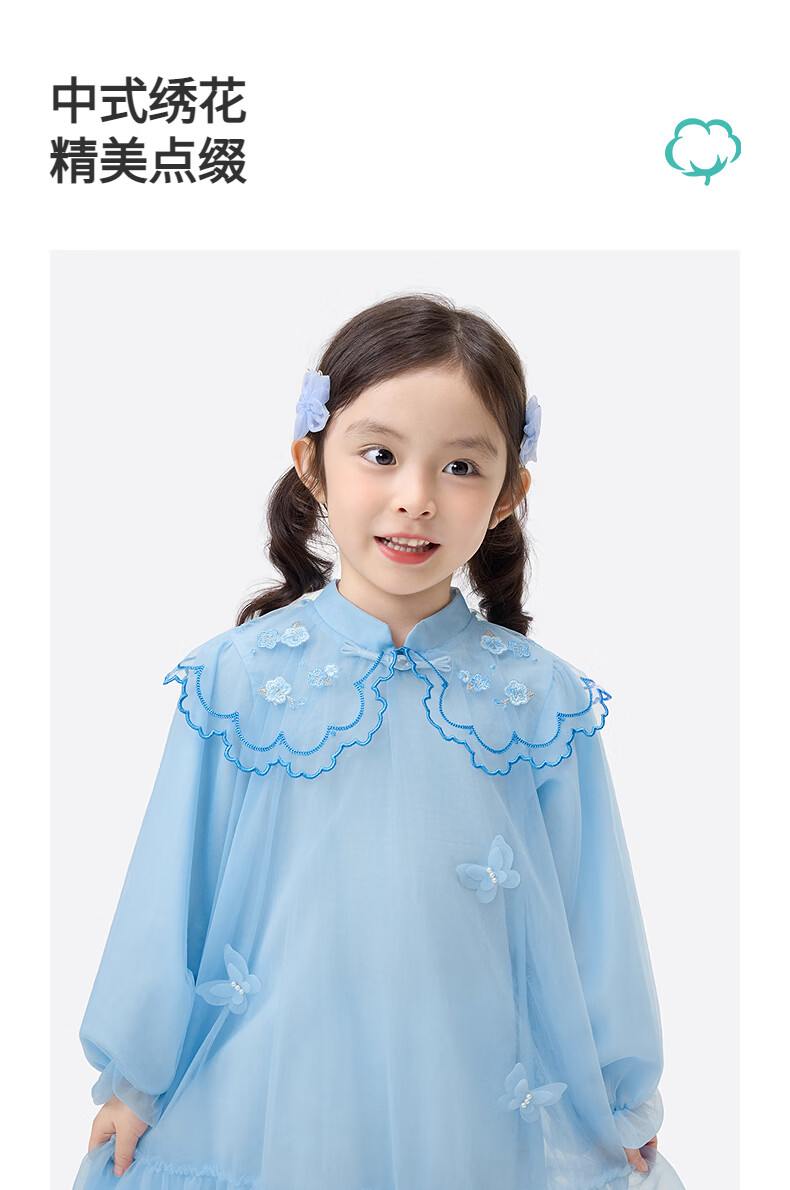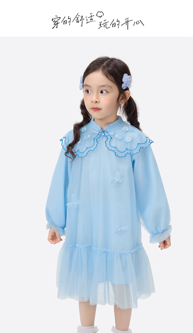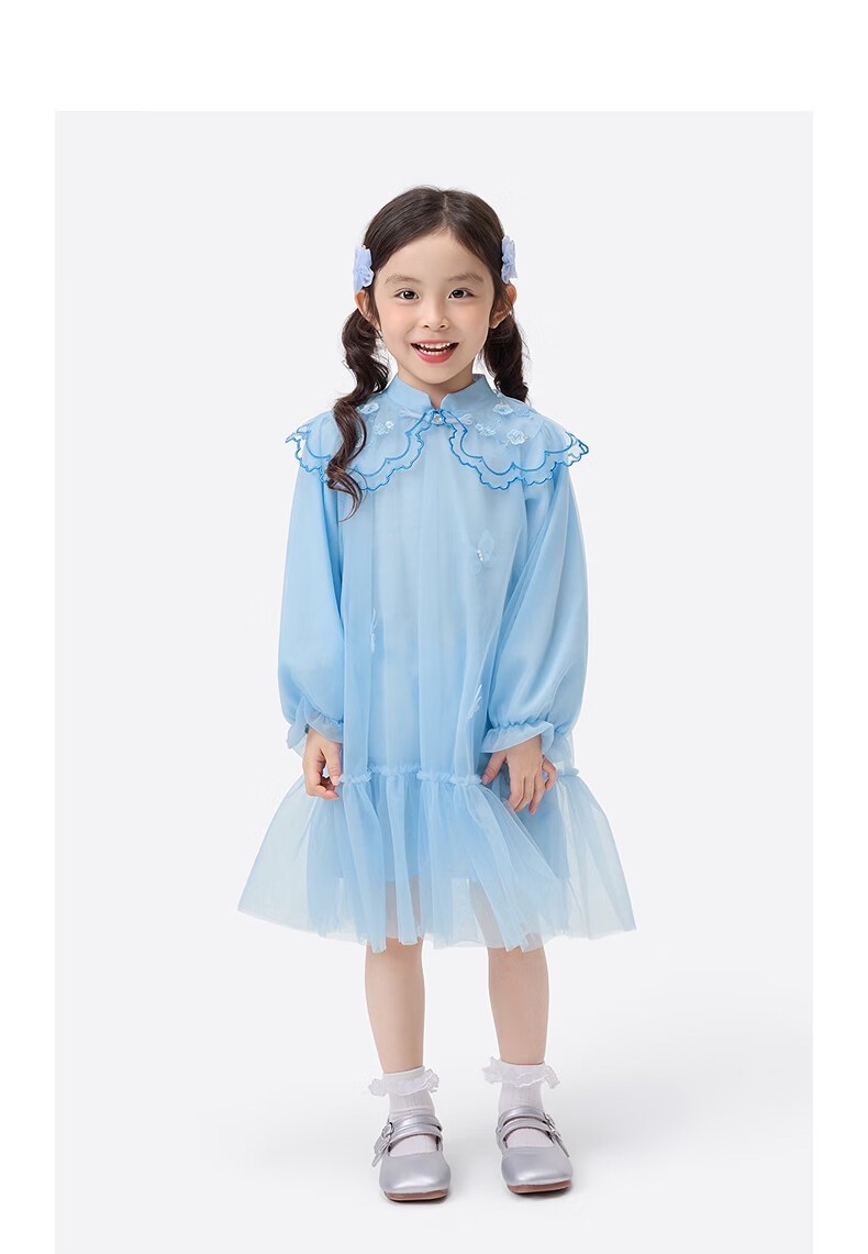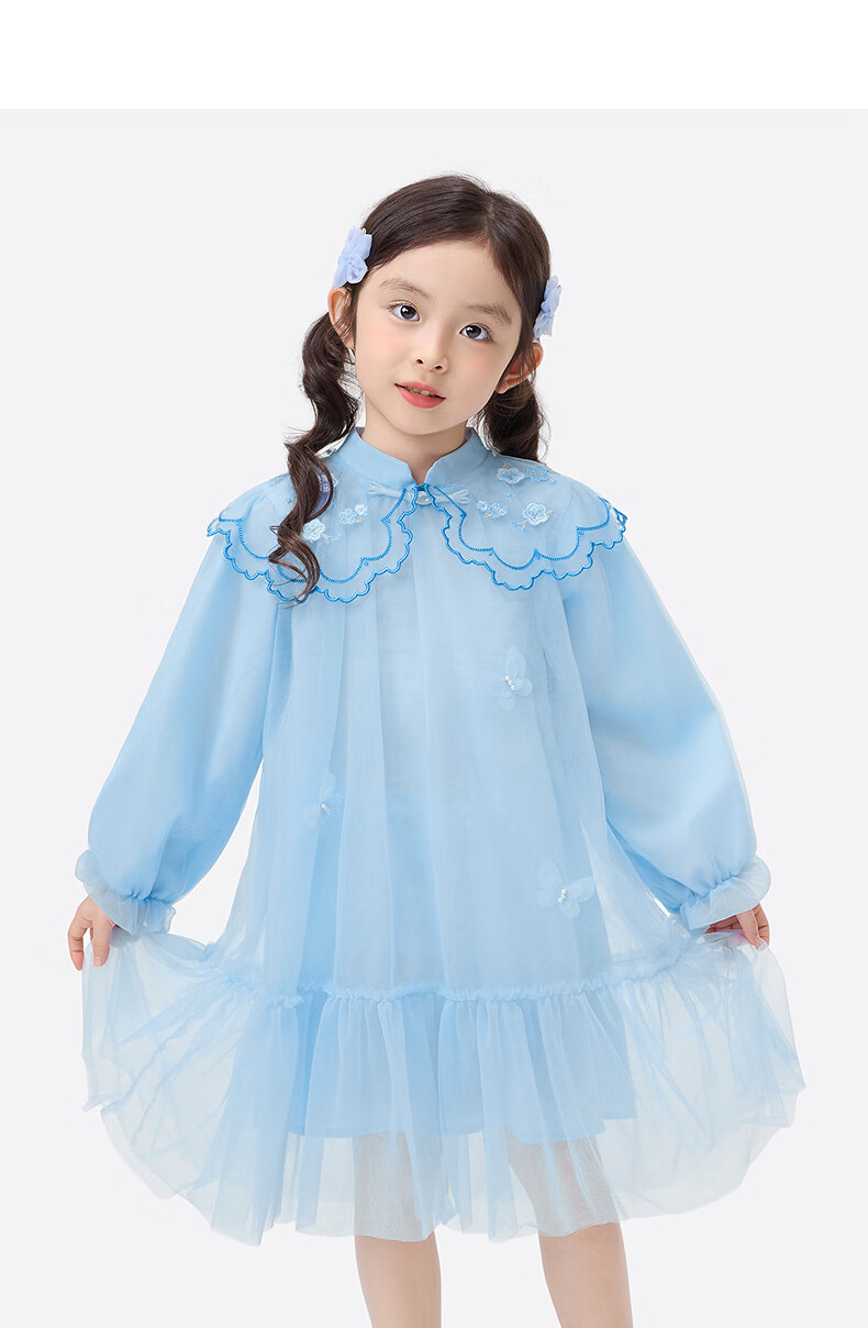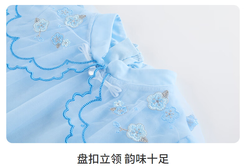 Xiaoyinman children's clothing girls' new Chinese style dress with button stand collar 26 spring Chinese style mesh skirt for children and middle-aged children blue 105