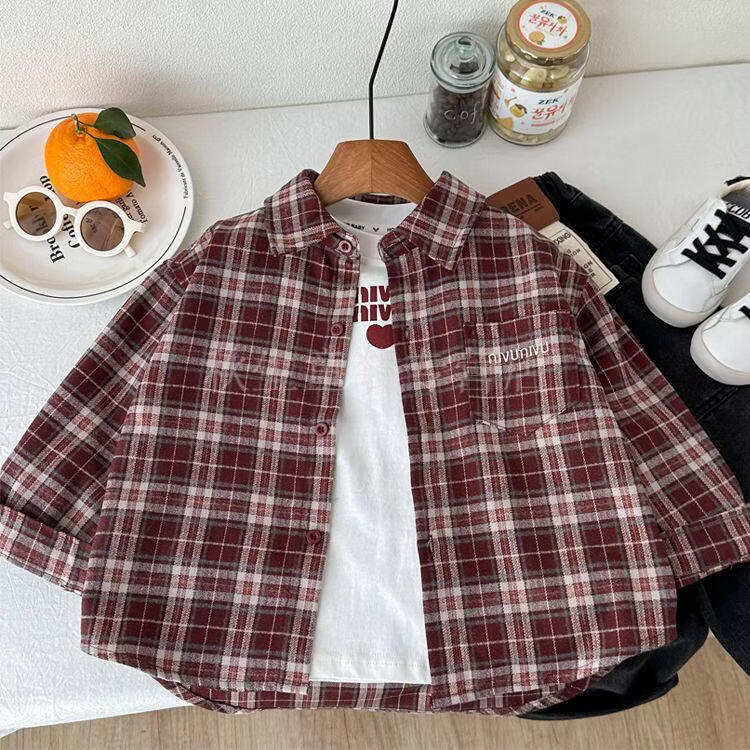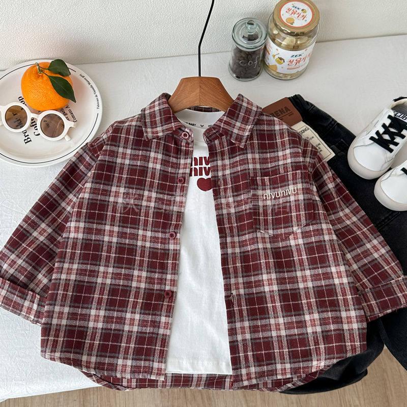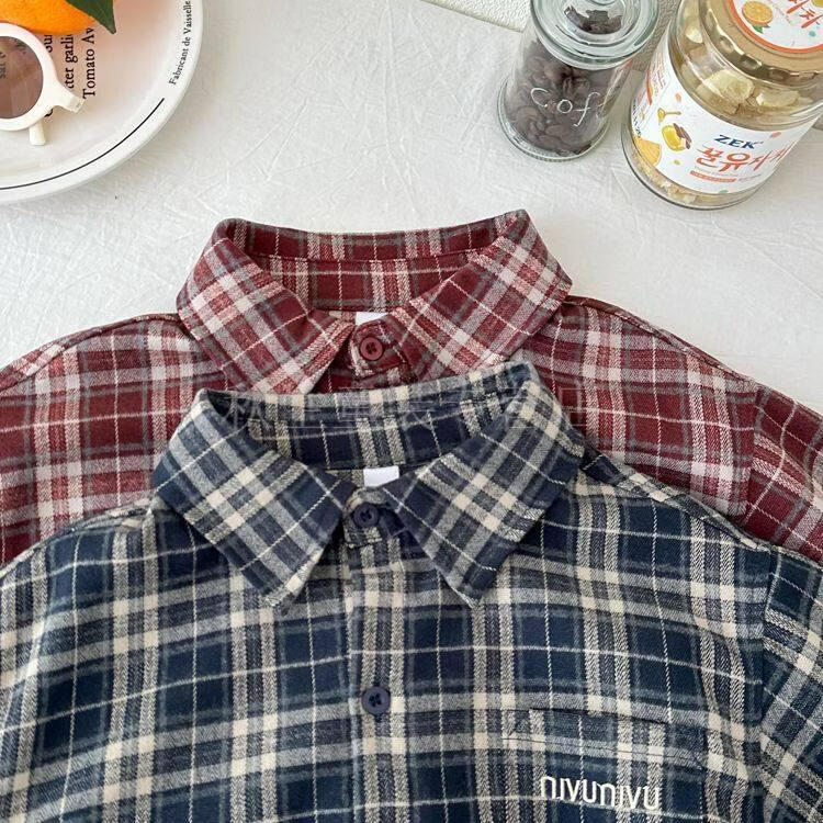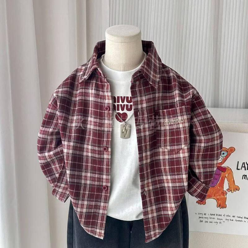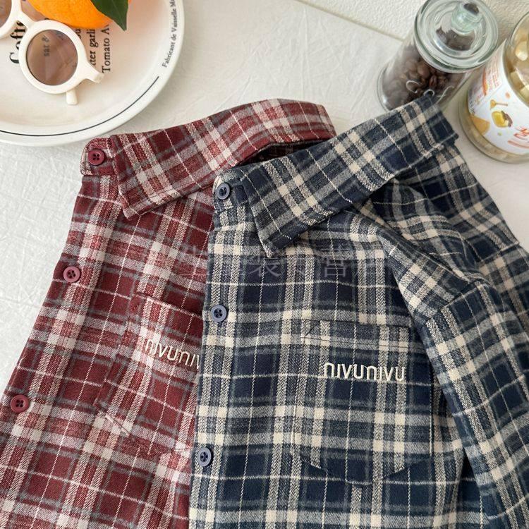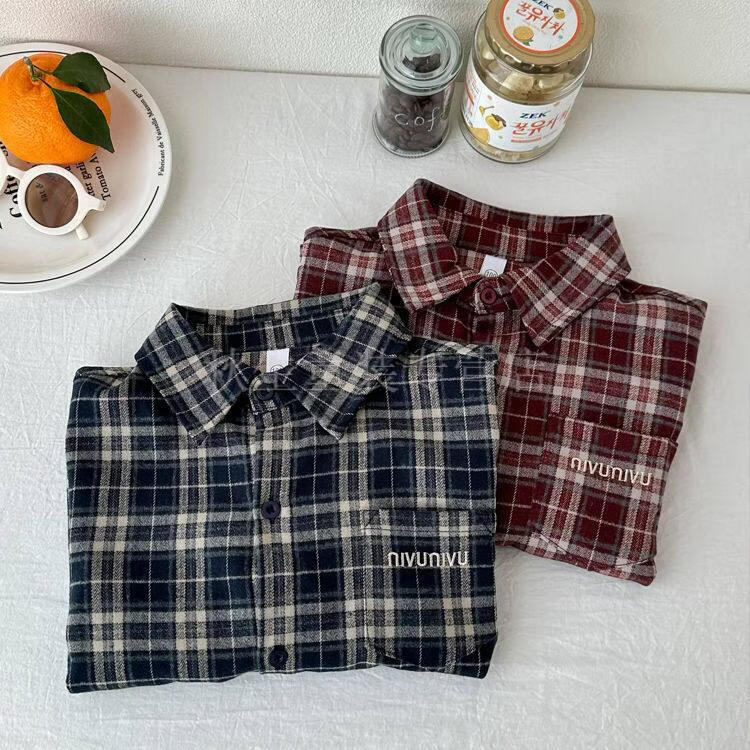G.duck Korean style boys' brushed plaid shirt, handsome college style spring girl's thin long-sleeved jacket, fashionable red plaid shirt, same style for men and women 110 cm