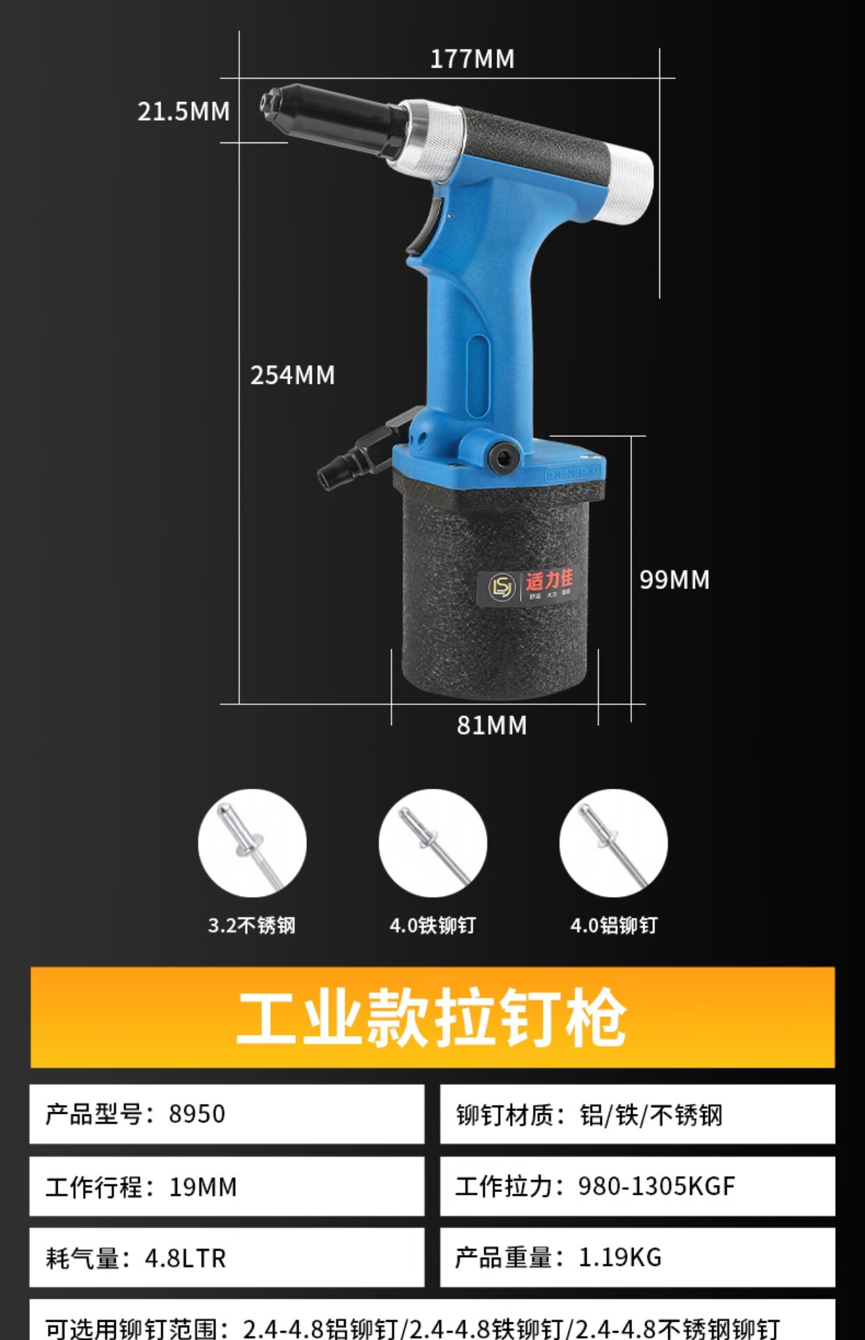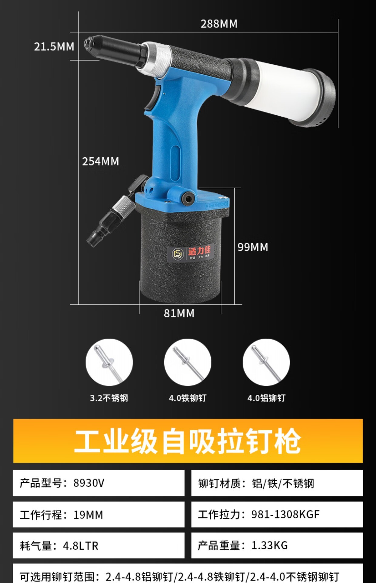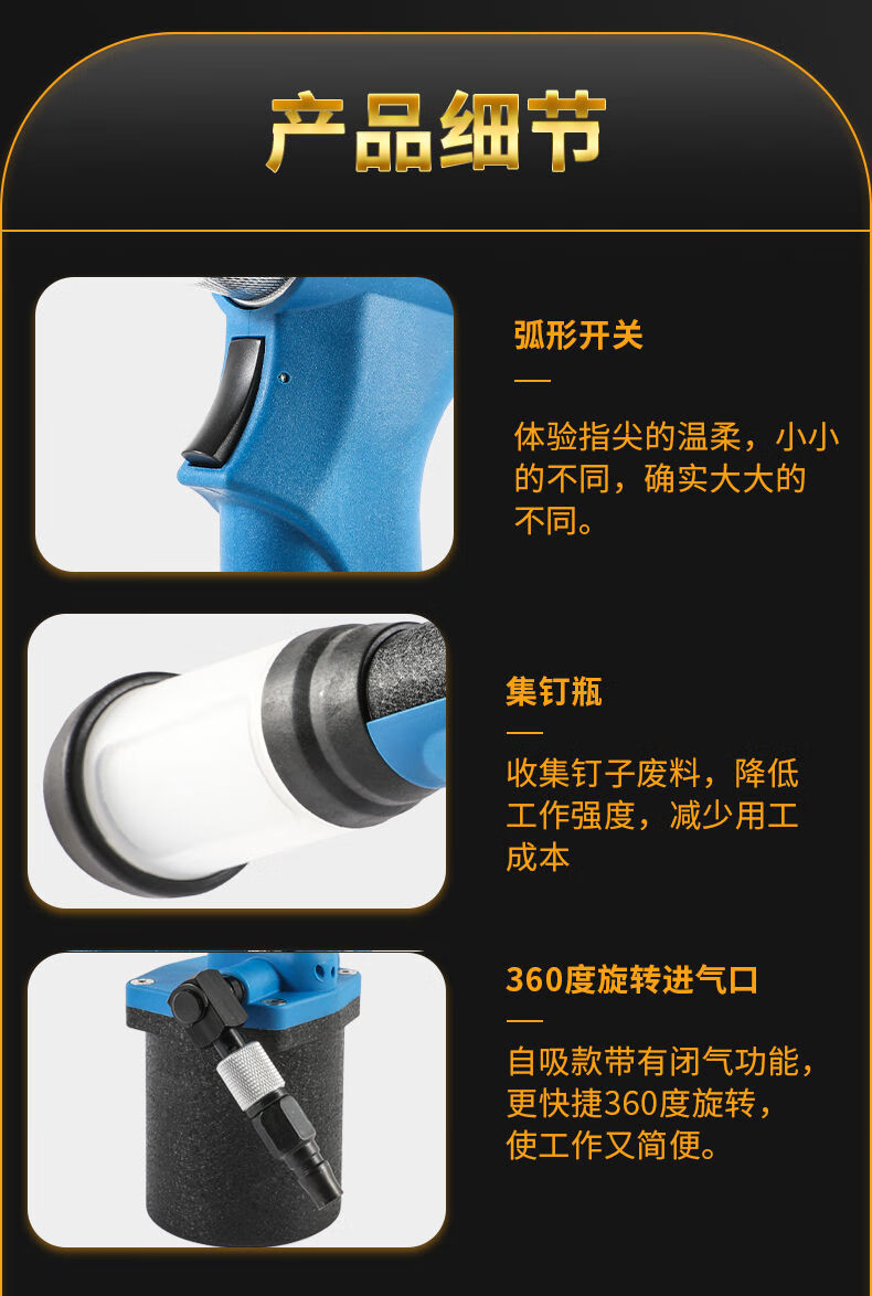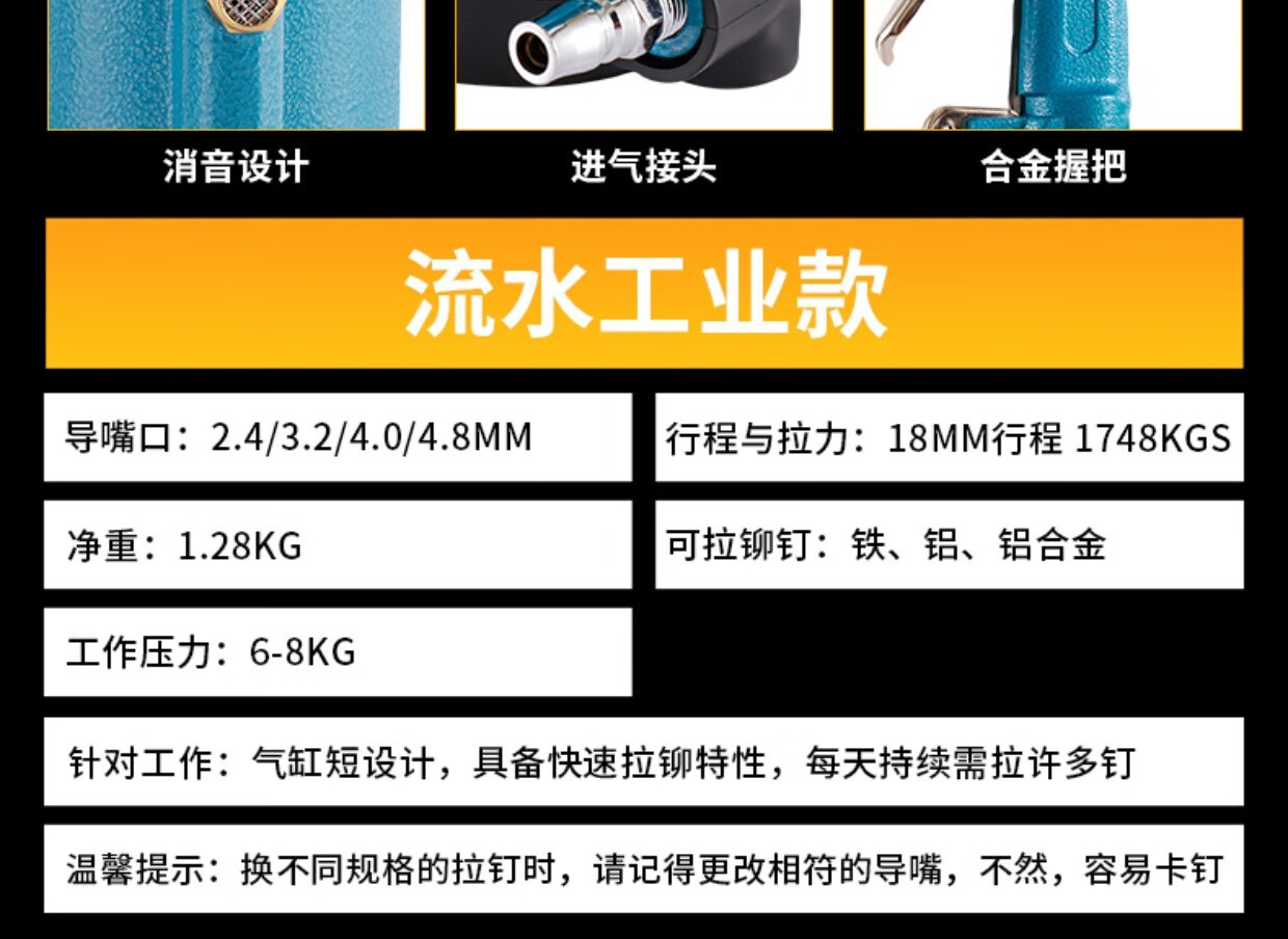Industrial grade pneumatic rivet gun self-priming pneumatic rivet gun stainless steel core pulling cap machine pneumatic riveting tool 4.0-6.4 industrial grade blue rivet gun (can pull 5.016