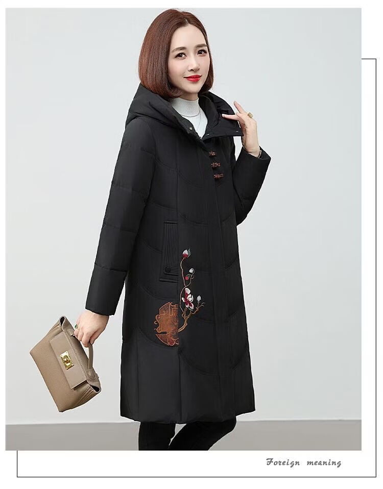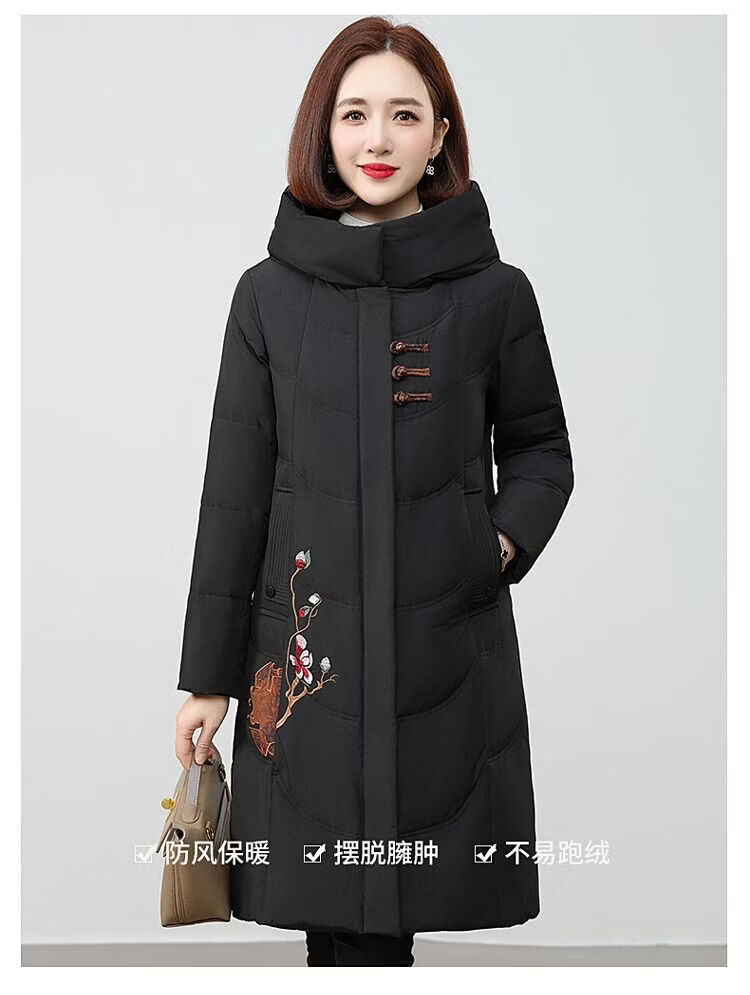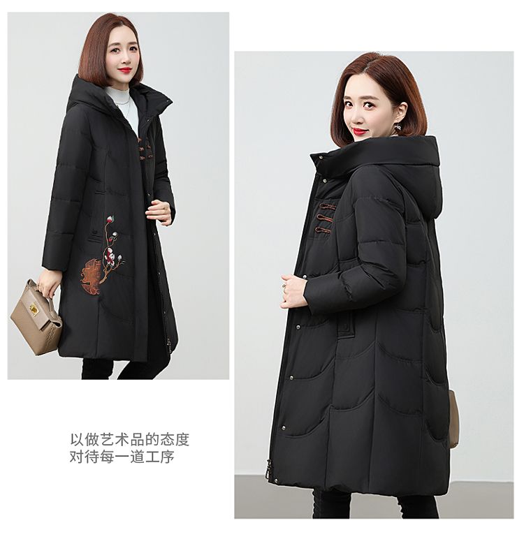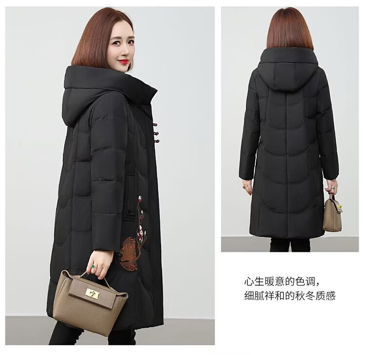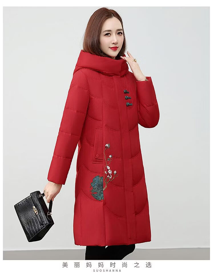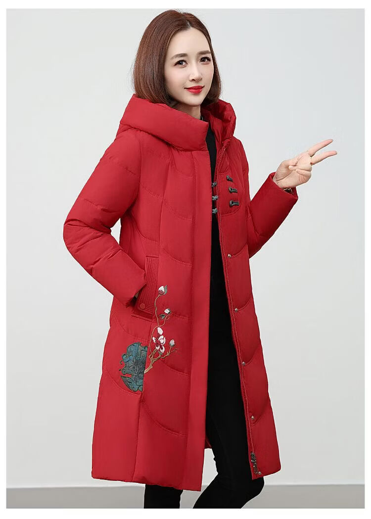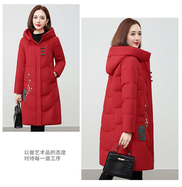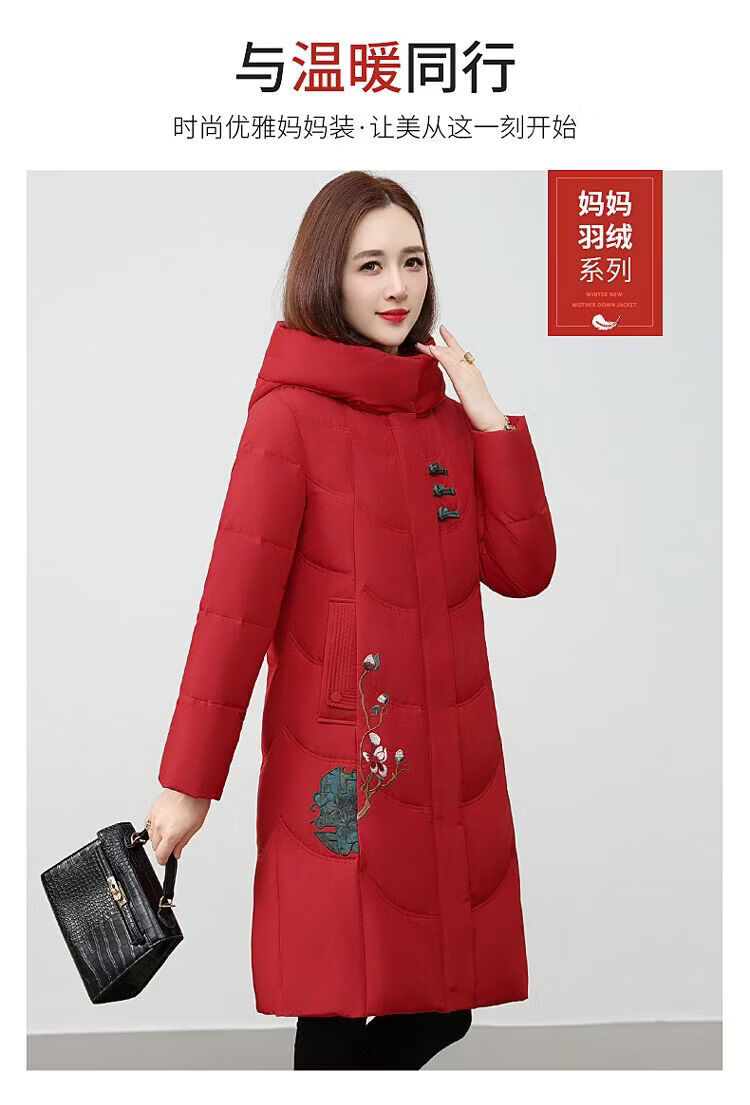 ROMON authentic brand red down jacket new Chinese style mid-length over-the-knee thickened warm embroidered hooded jacket mother's outfit red 2XL recommended 111-125 Jin Jin equals 0.5 kg
