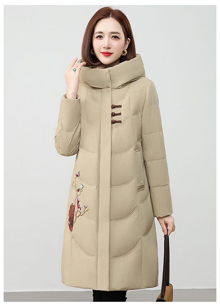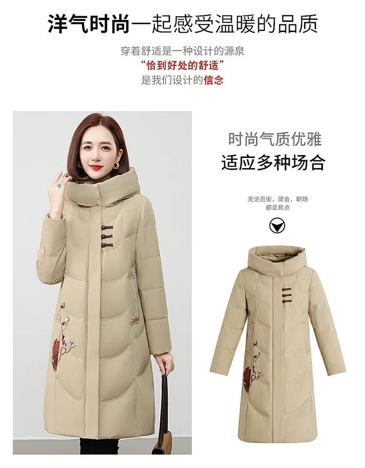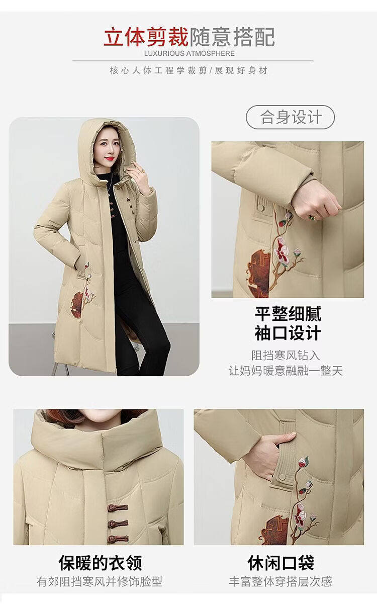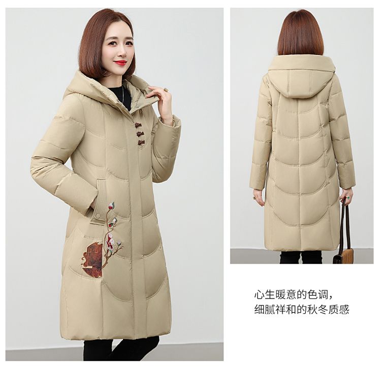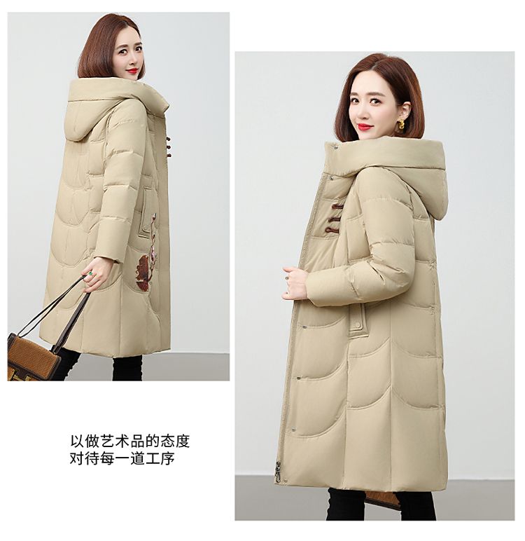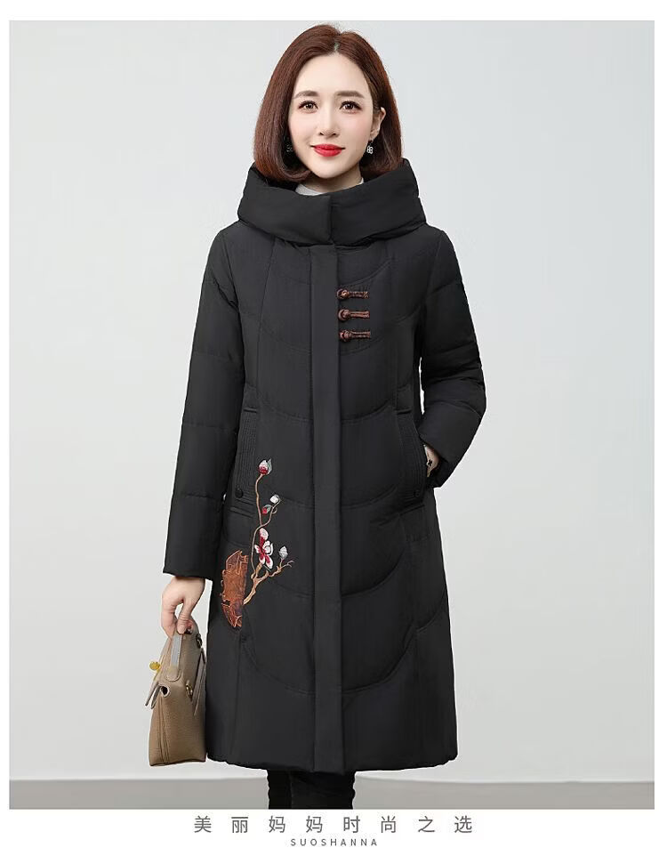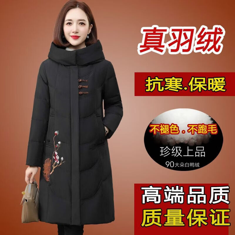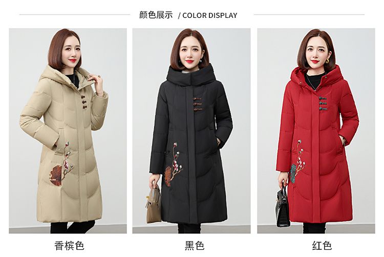 ROMON authentic brand red down jacket new Chinese style mid-length over-the-knee thickened warm embroidered hooded jacket mother's outfit red 2XL recommended 111-125 Jin Jin equals 0.5 kg