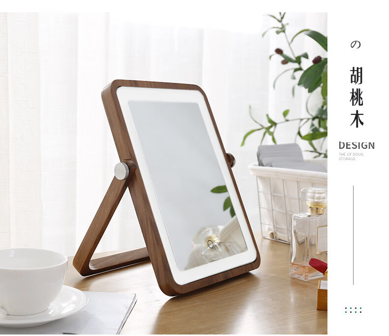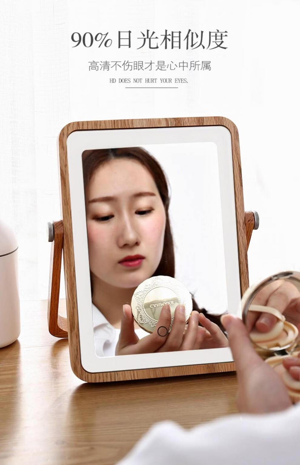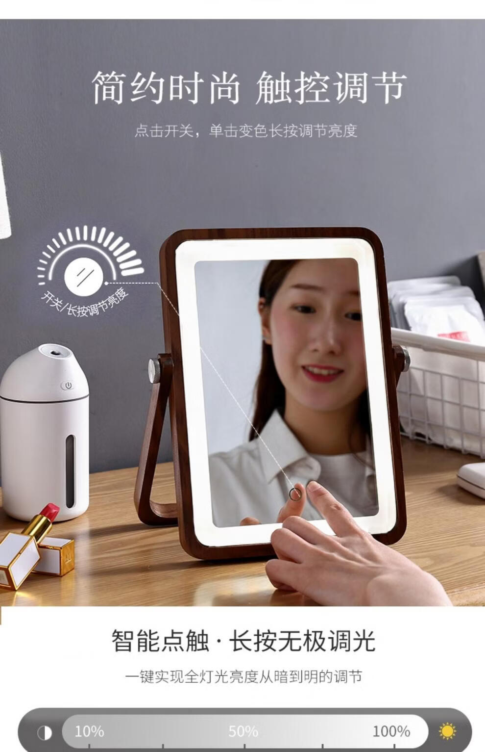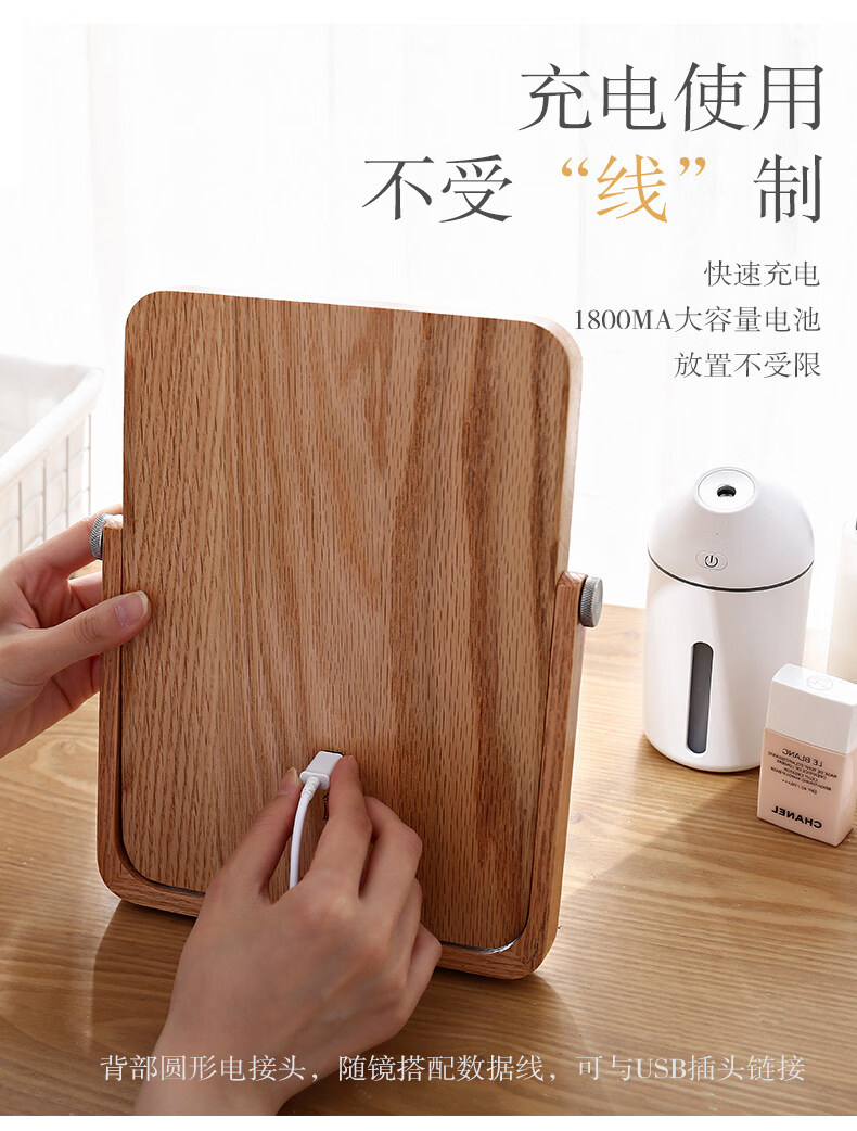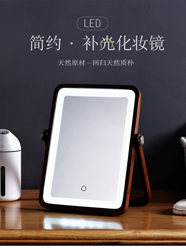 Solid wood LED desktop makeup mirror, foldable and rechargeable desktop makeup mirror with light, girls dormitory fill-in mirror, North American walnut
