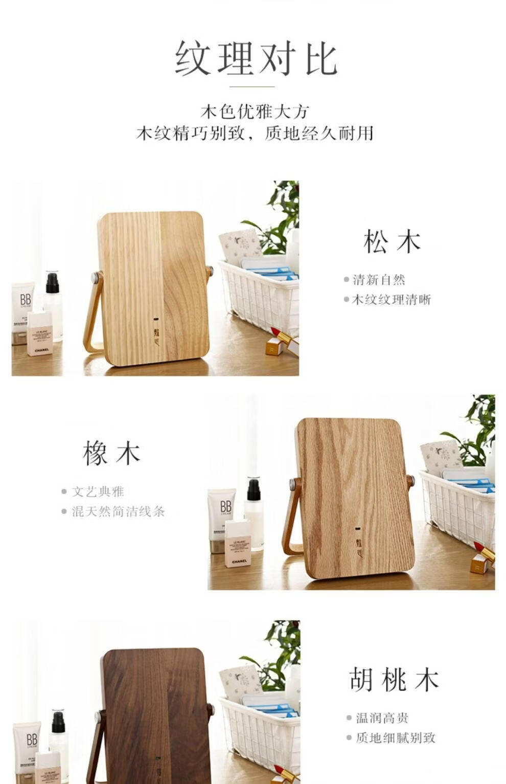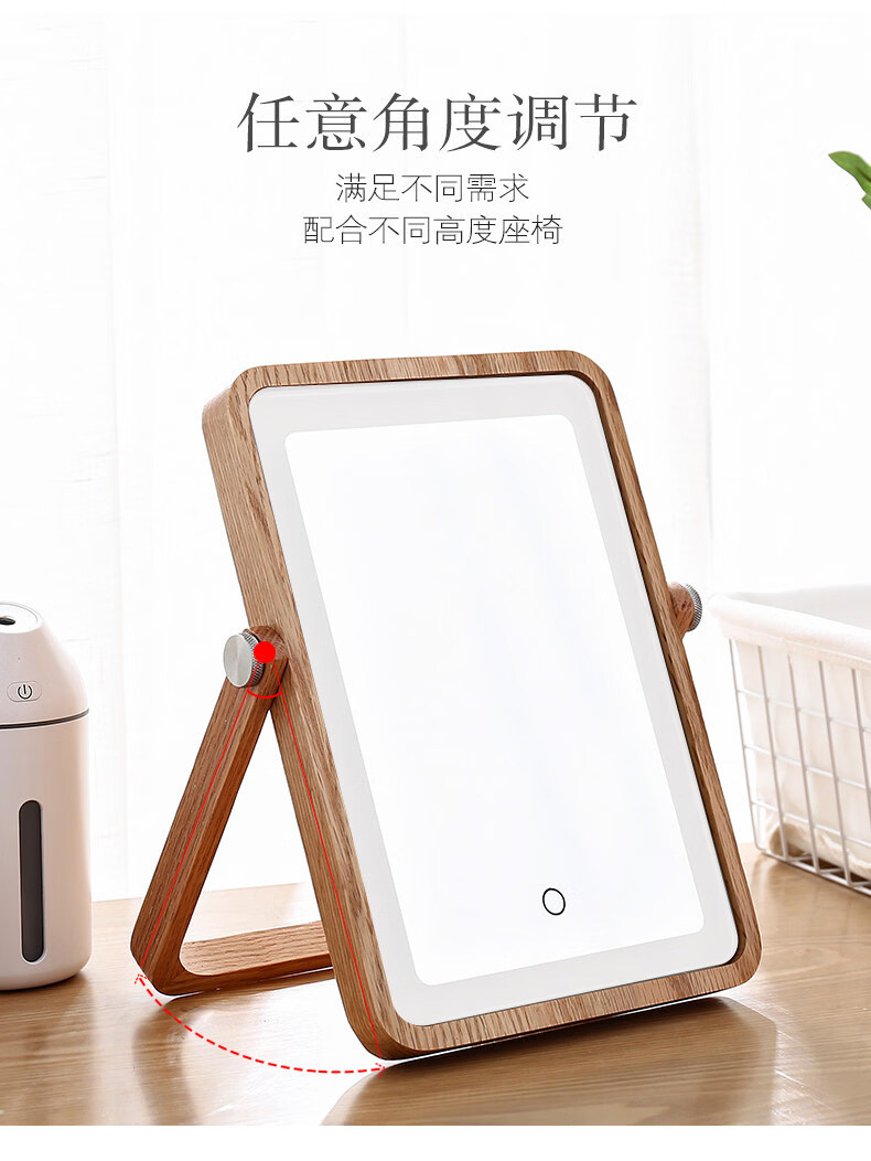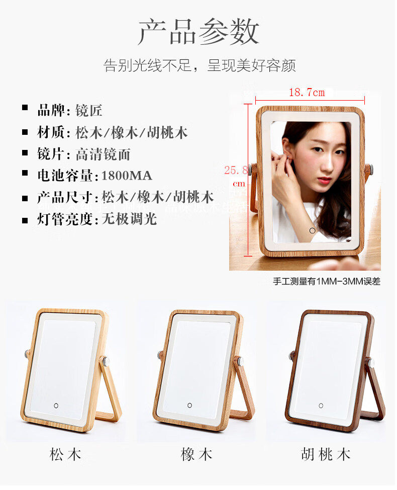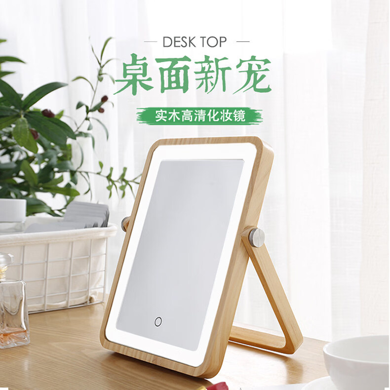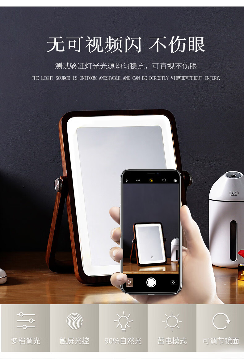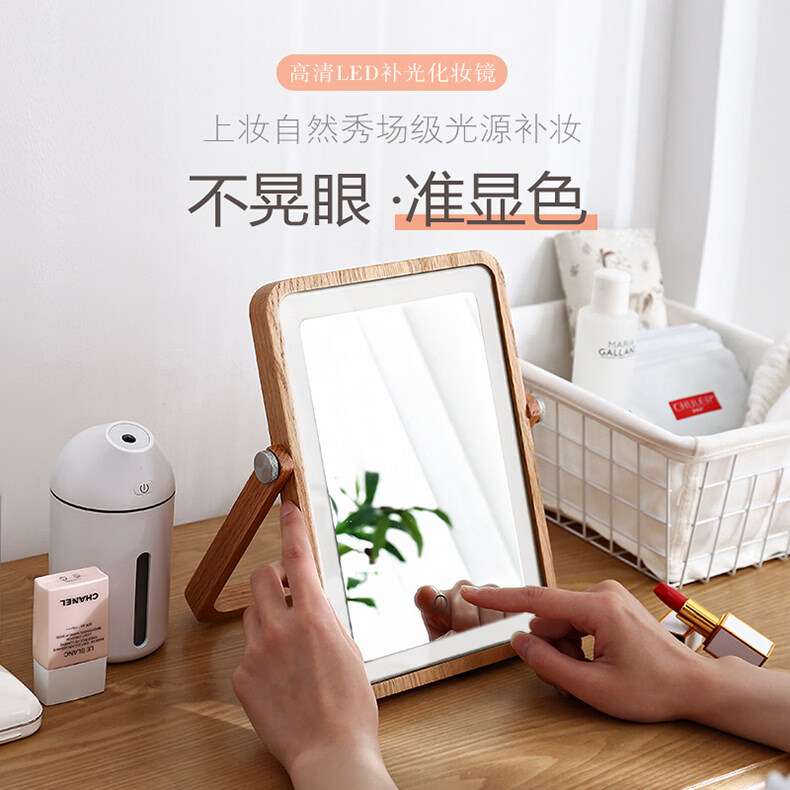 Solid wood LED desktop makeup mirror, foldable and rechargeable desktop makeup mirror with light, girls dormitory fill-in mirror, North American walnut