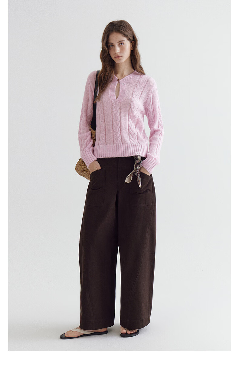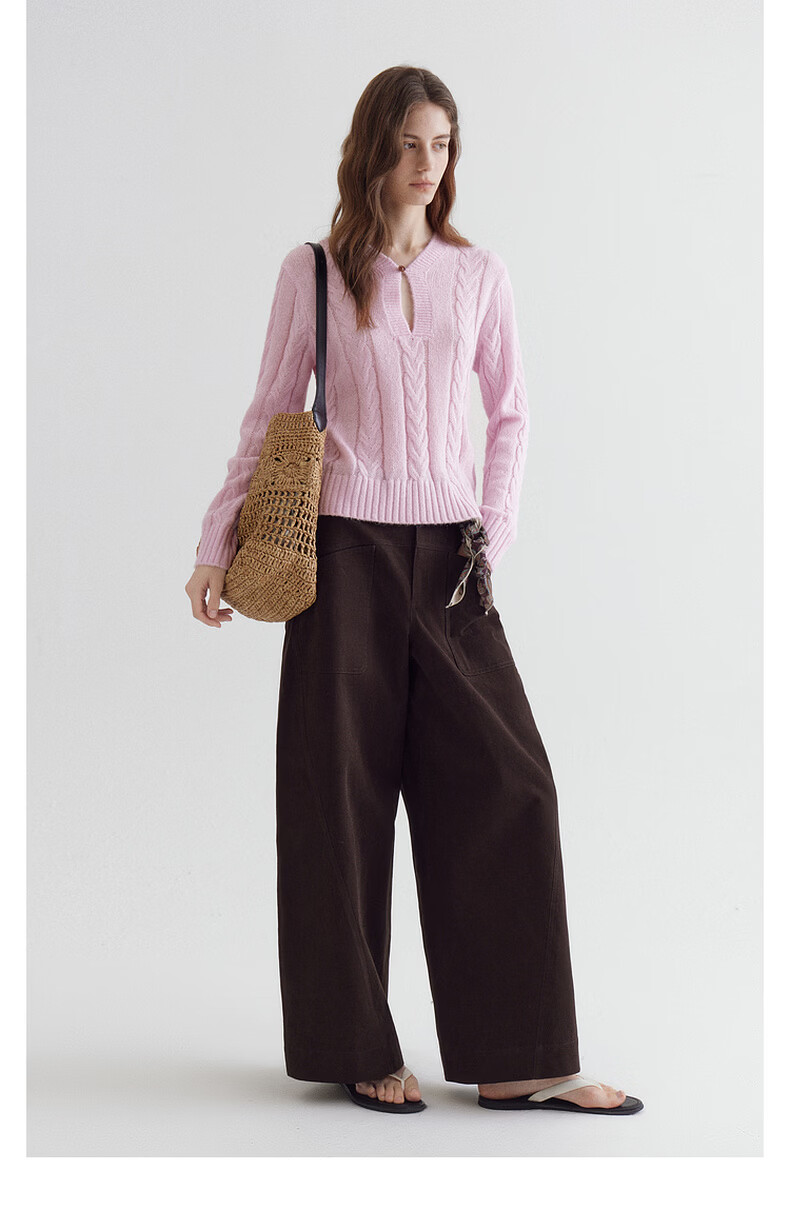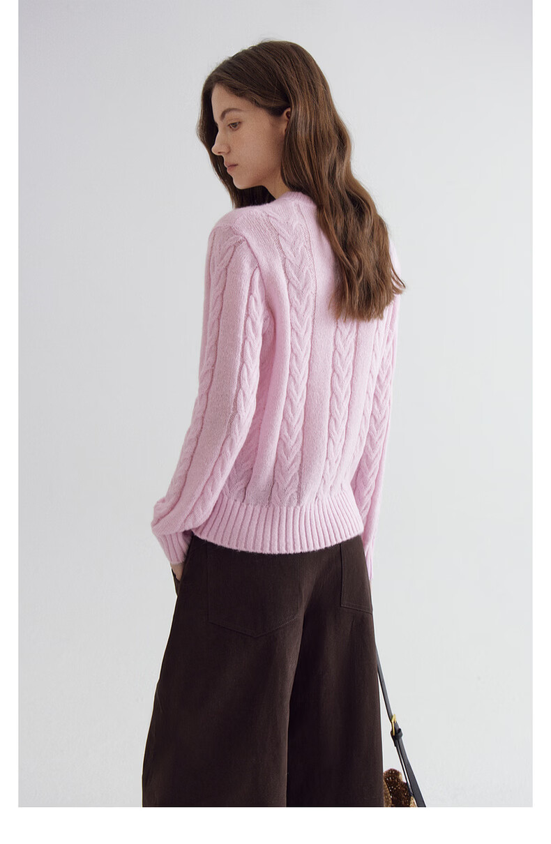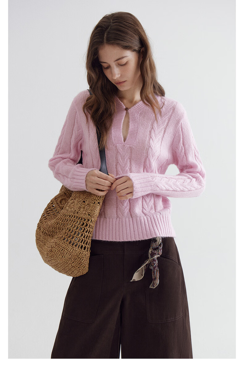 Fano studios Fan Luo Fano pink gentle mohair sweater for women 2026 spring one button hollow V-neck cable tie top pink ready stock M