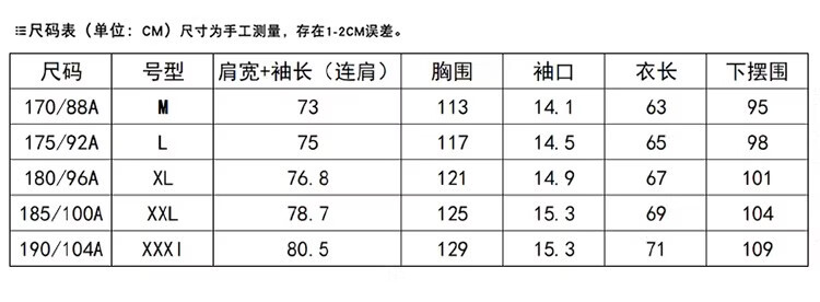 China (cm) 165 / 88-90 170 / 96-98 175 / 108-110 180 / 118-122 185 / 126-130