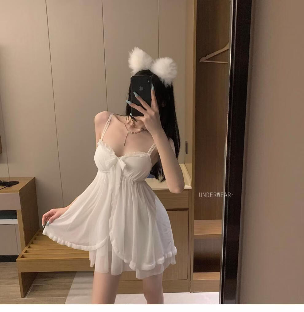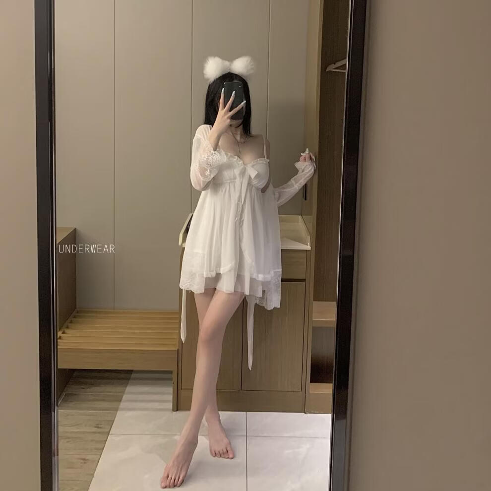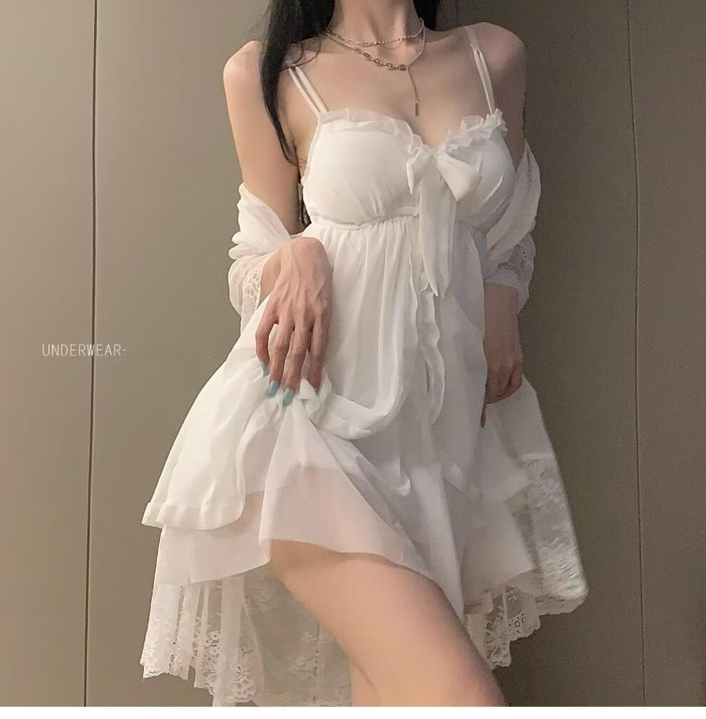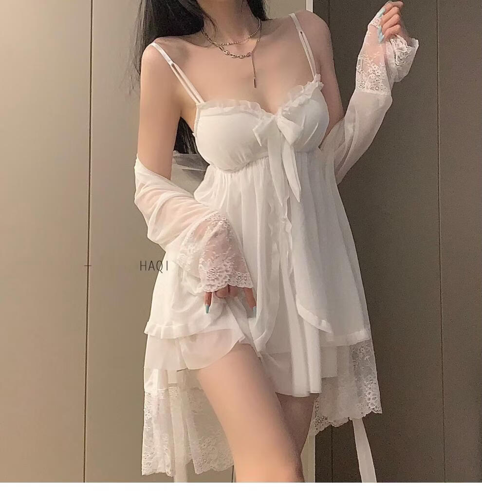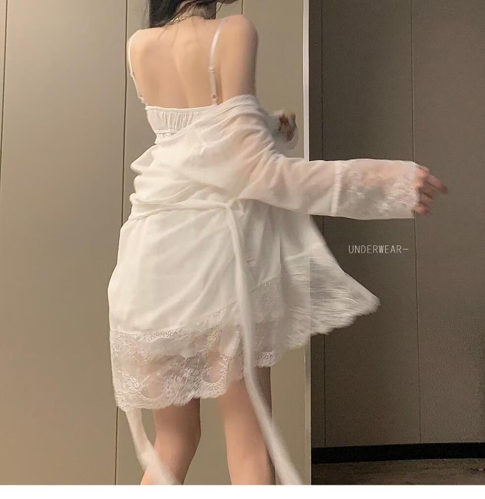 Langsha sexy pajamas for women summer new fairy style lace suspenders mesh nightgown robe with chest pad home two-piece suit black outer robe M 80-110Jin Jin is equal to 0.5 kg