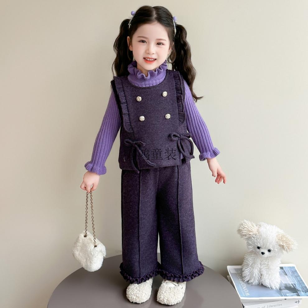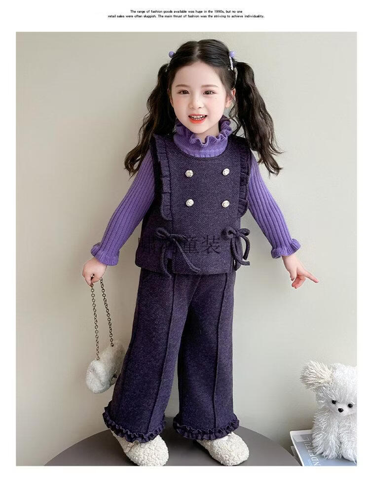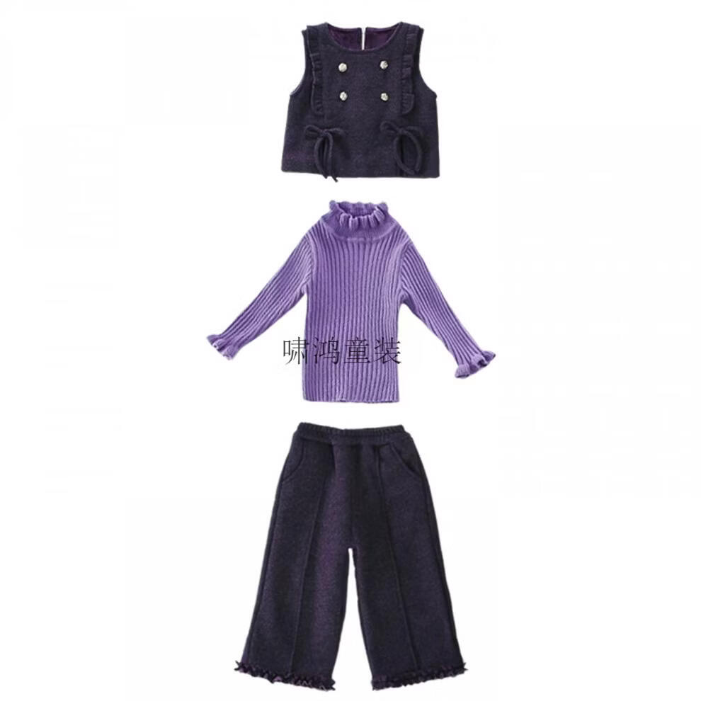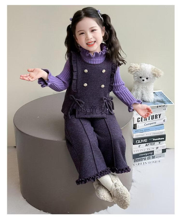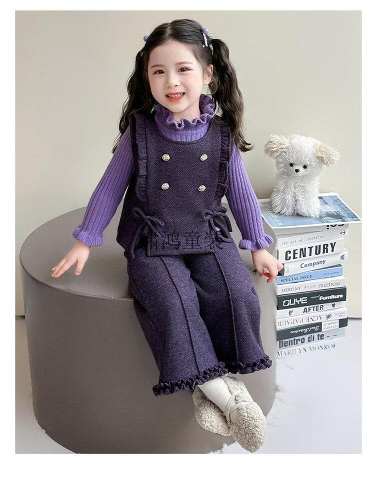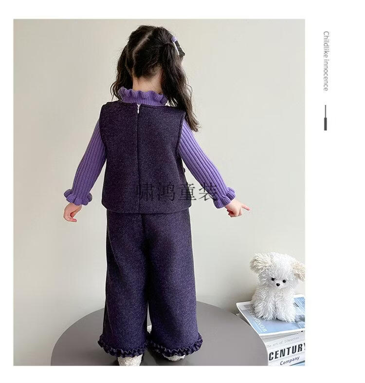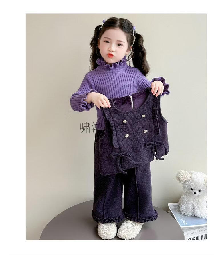 Log Cabin Girls' Velvet Suit Autumn and Winter 2026 New Style Fashionable Baby Girl Big Good-looking Sweater Winter Clothing Three-piece Set Purple Suit Vest + Pants 90 cm
